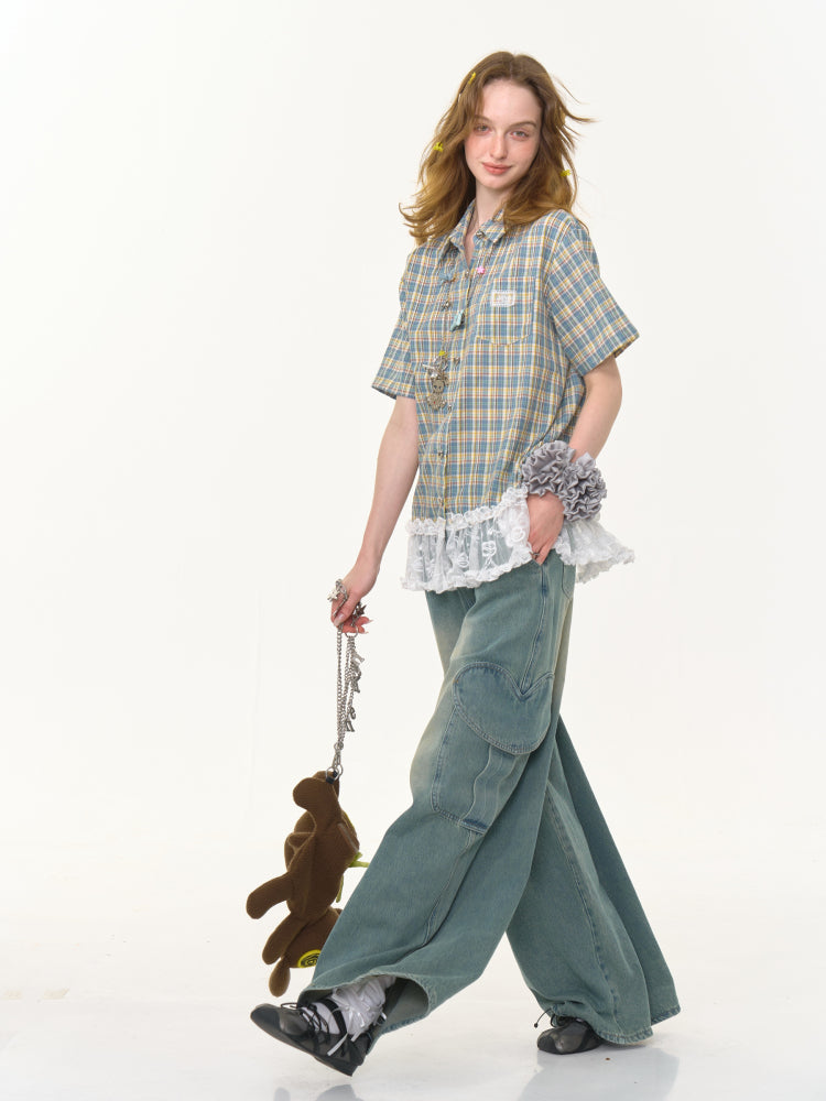 Check Stitching Lace Hem Short Sleeve Shirt【s0000013037】