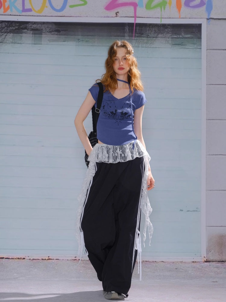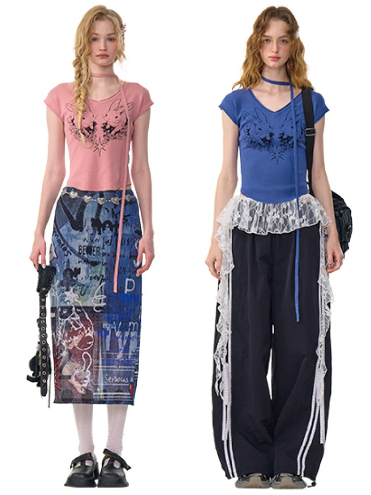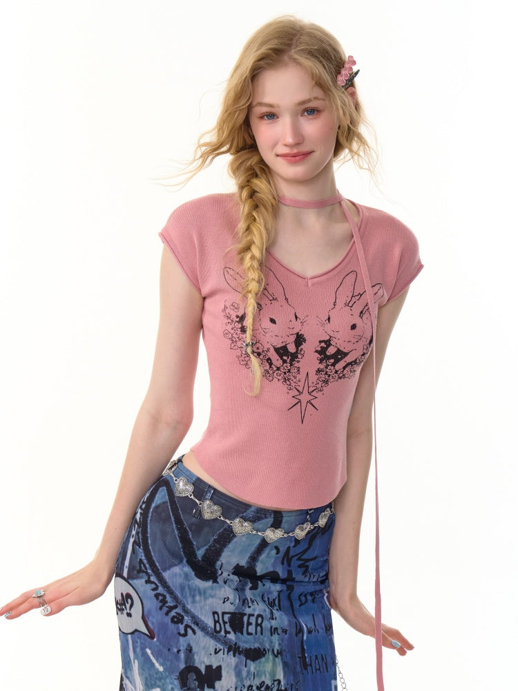 Rabbit Graphic V-Neck Choker Short Sleeve T-Shirt【s0000013107】