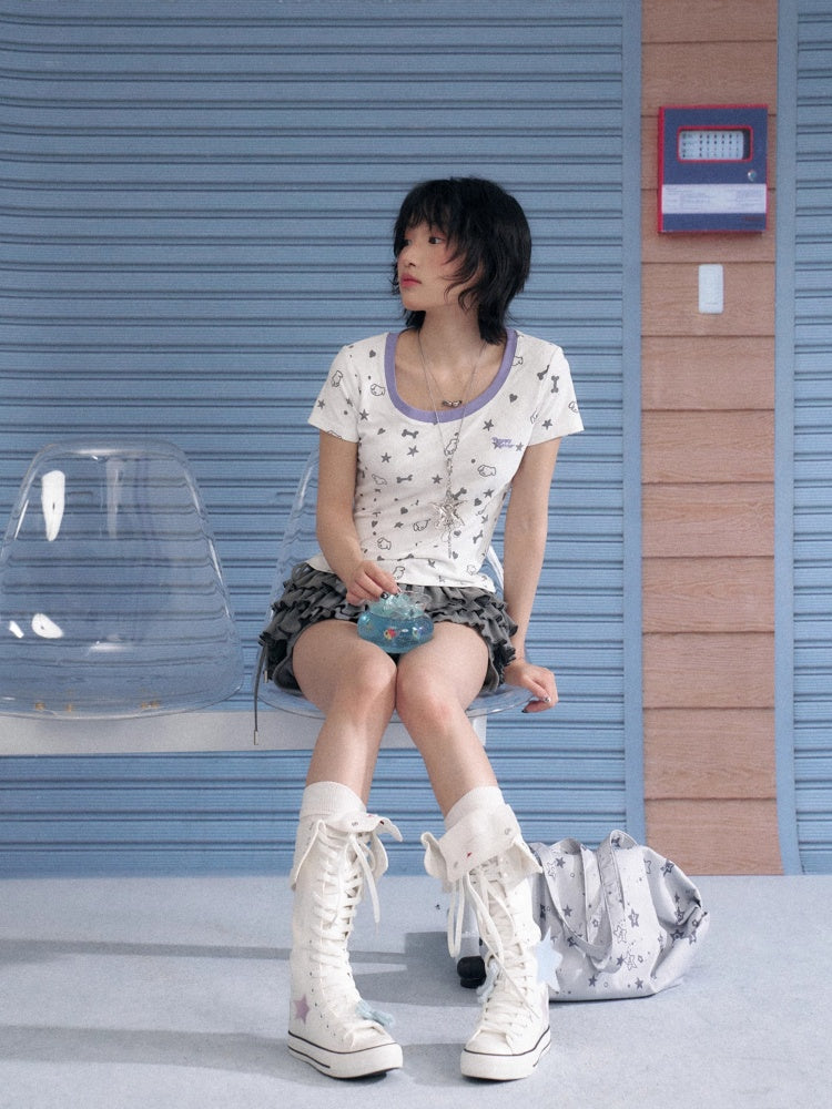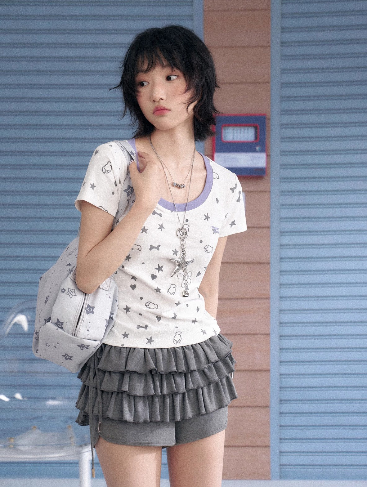 Puppy Party Printed Contrast Short Sleeve T-Shirt【s0000013135】