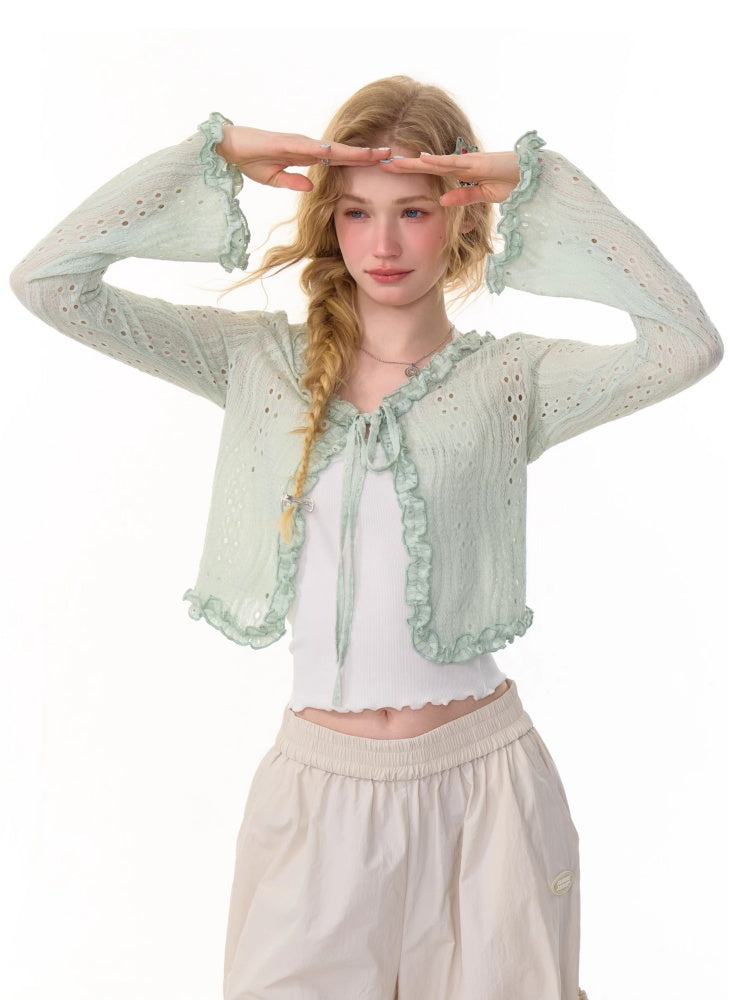 Ribbon Tie Openwork Knit Lace Ruffle Cropped Cardigan【s0000013147】