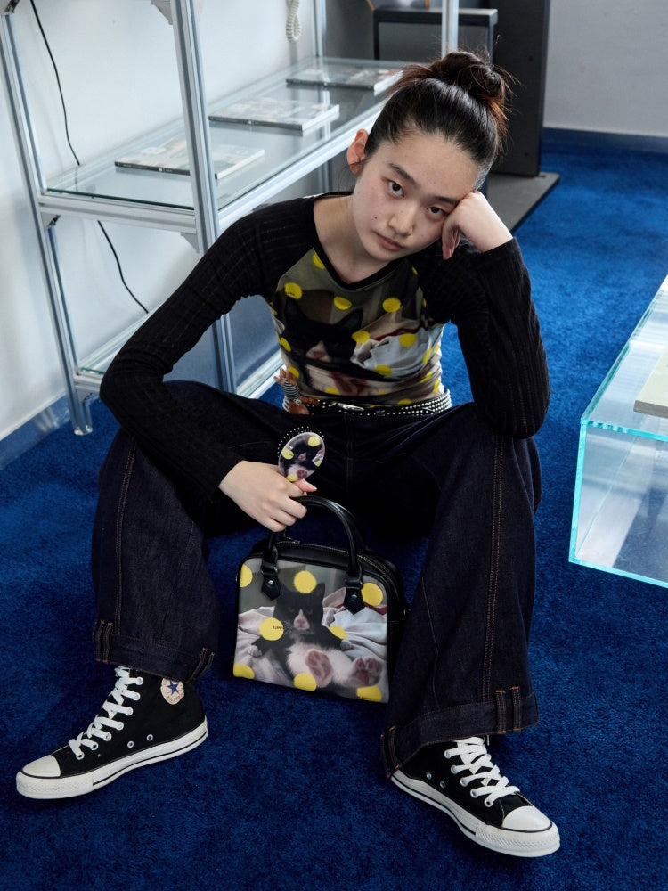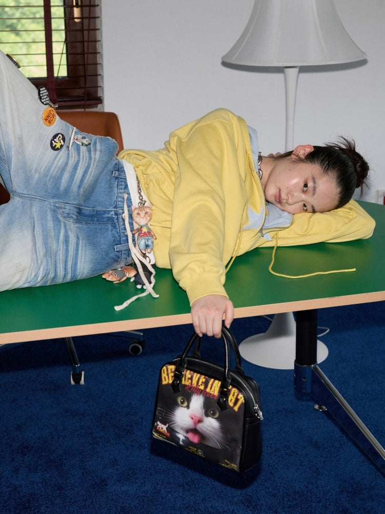 Original Vintage Cat & Dog Print Boston Leather Commuter Adjustable Crossbody Bag【s0000013849】