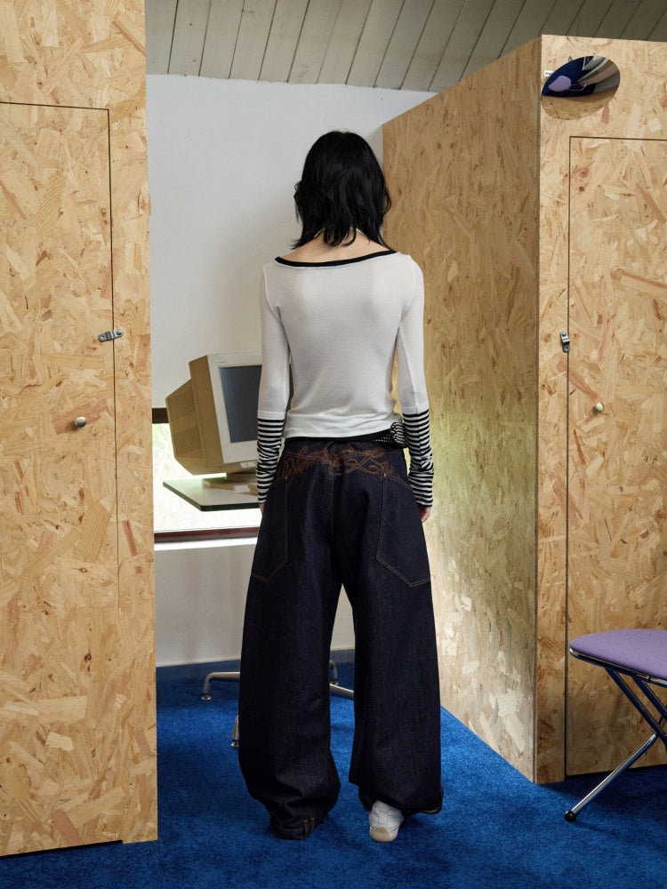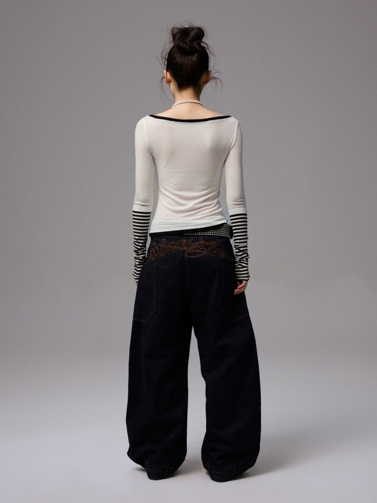 One Line Boat Collar Faux Layered Graffiti Print Long Sleeved T-Shirt【s0000013865】