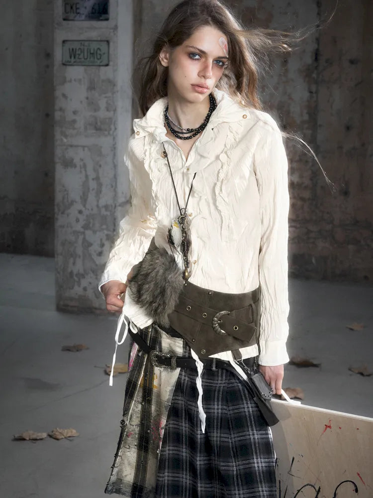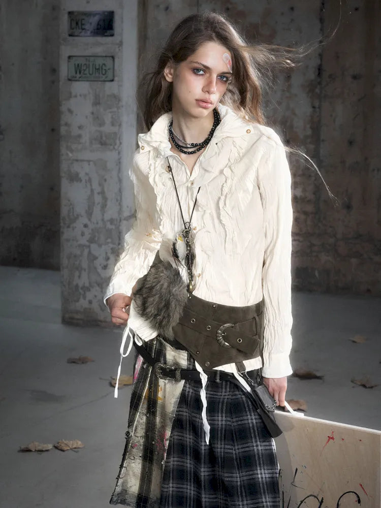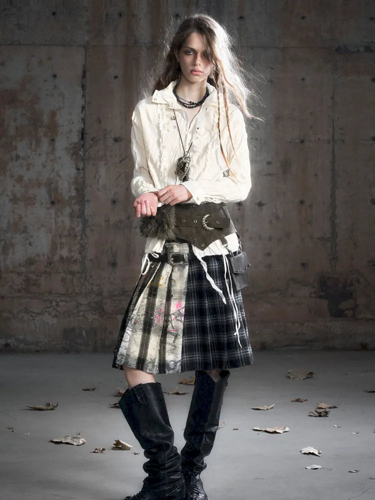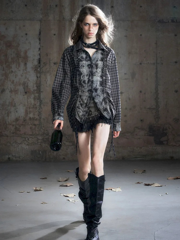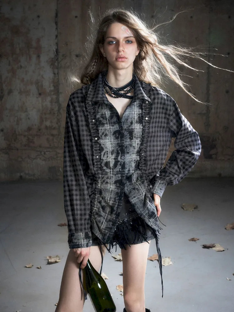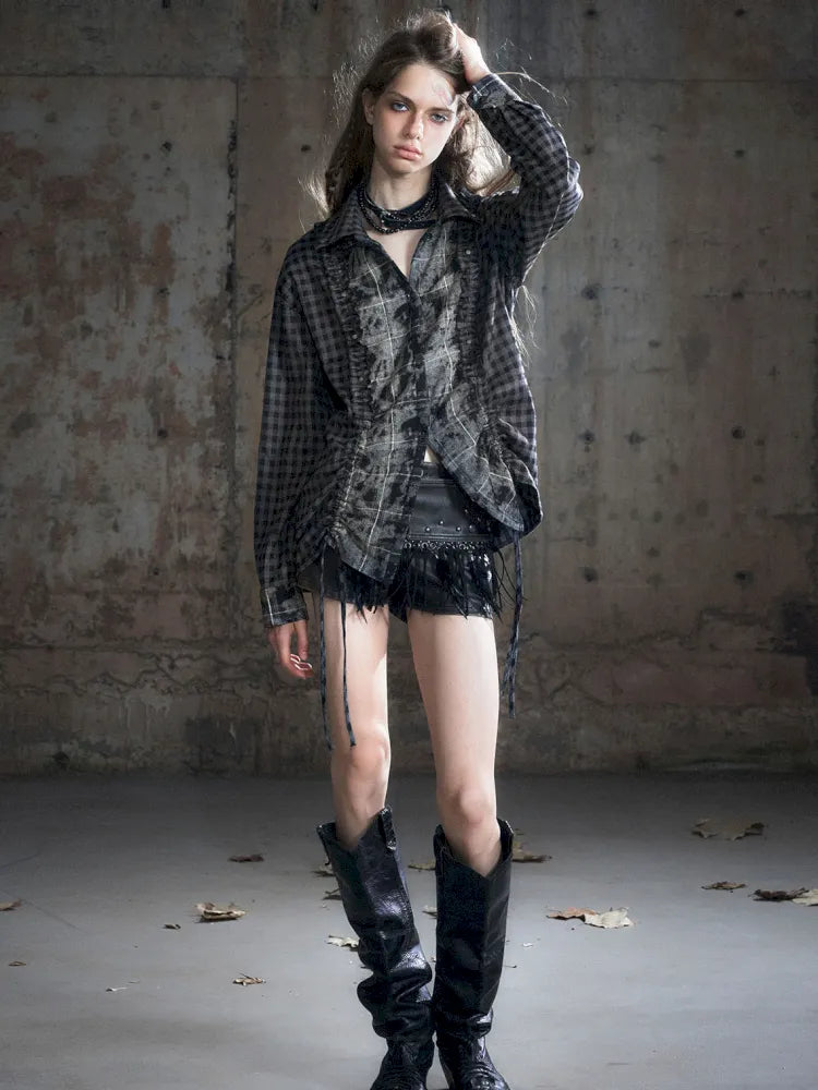 Drawstring Black-Gray Checkered Shir【s0000013959】