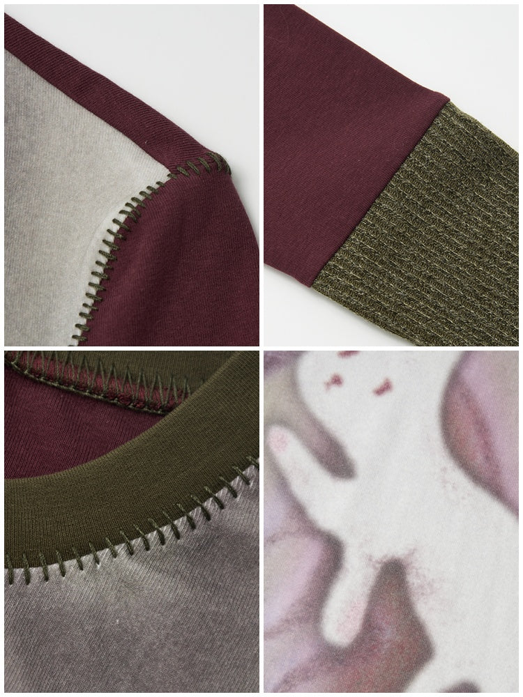 "Healing Sleepwalking" Flower Gauze Pit Strip Splicing Round Neck Long-Sleeved T-Shirt【s0000014276】