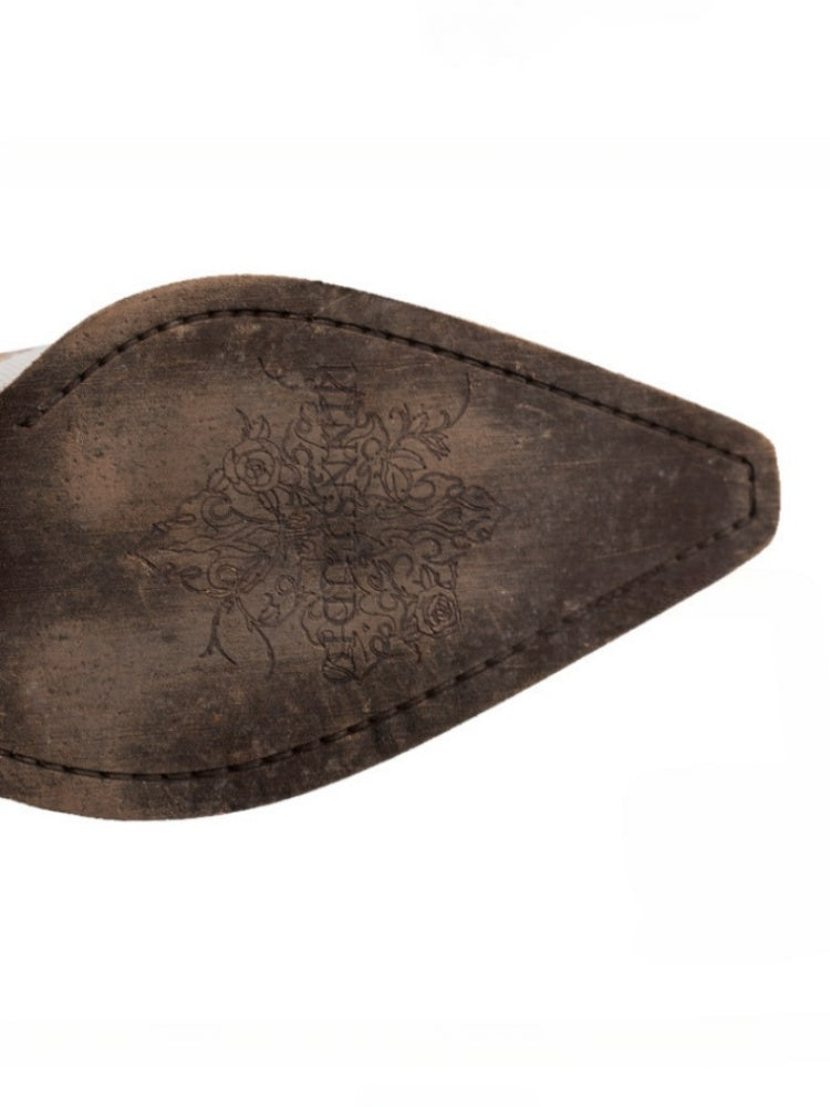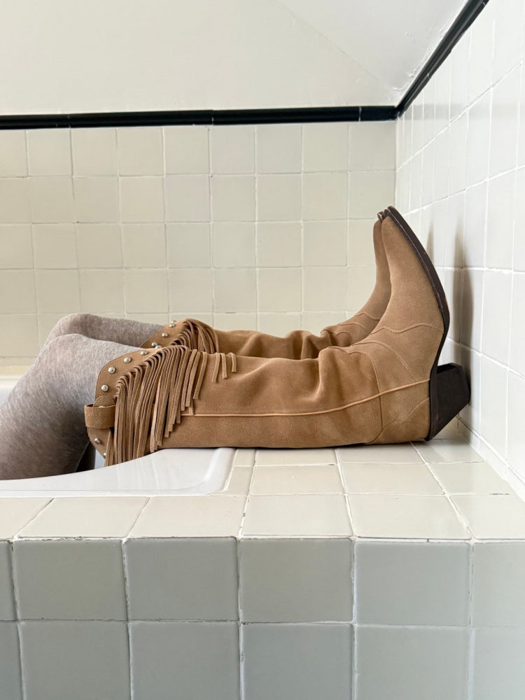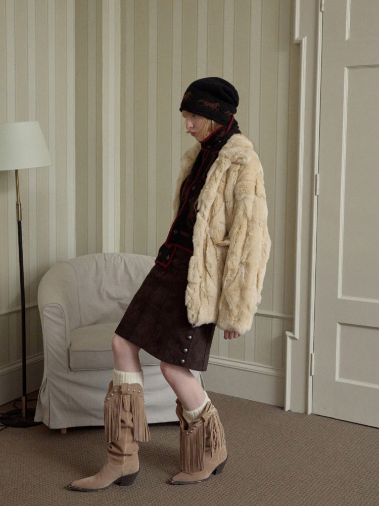 V-Mouth Pointed Toe Suede Cowhide Western Rivet Tassel Mid-Leg Knight Boots【s0000014961】