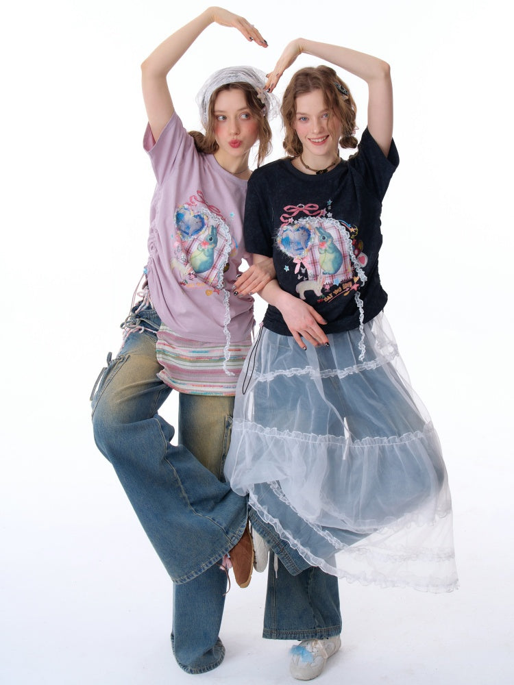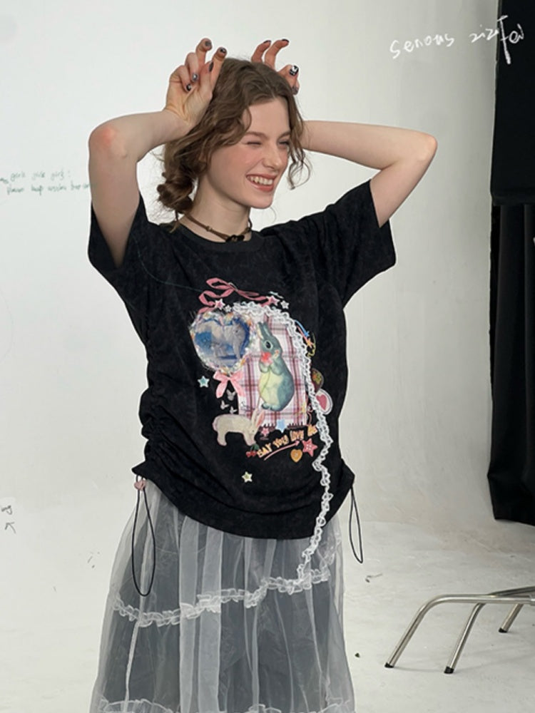 Rabbit Print Three Dimensional Lace Loose Crew Neck Short Sleeve T-Shirt【s0000011755】