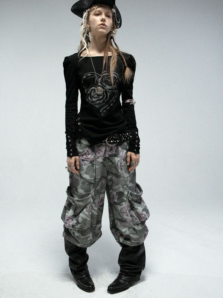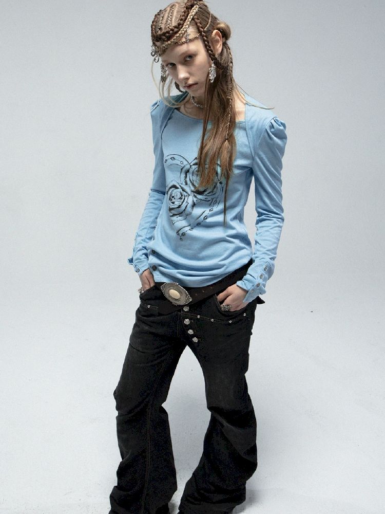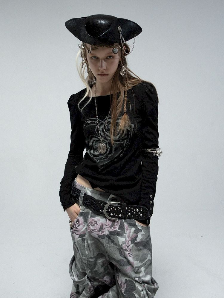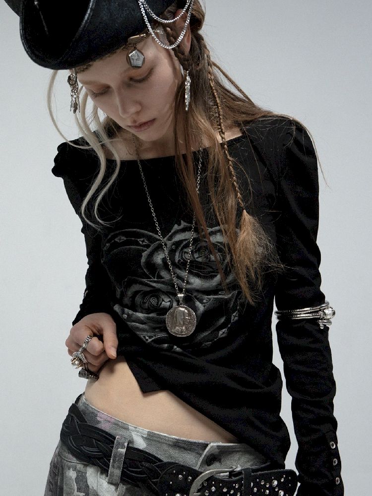 Bubble Sleeve Square Neck Printed Long Sleeve Tee【s0000011840】