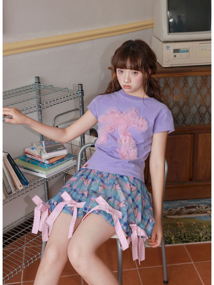 Two-tone mesh bow T-shirt【s0000012828】