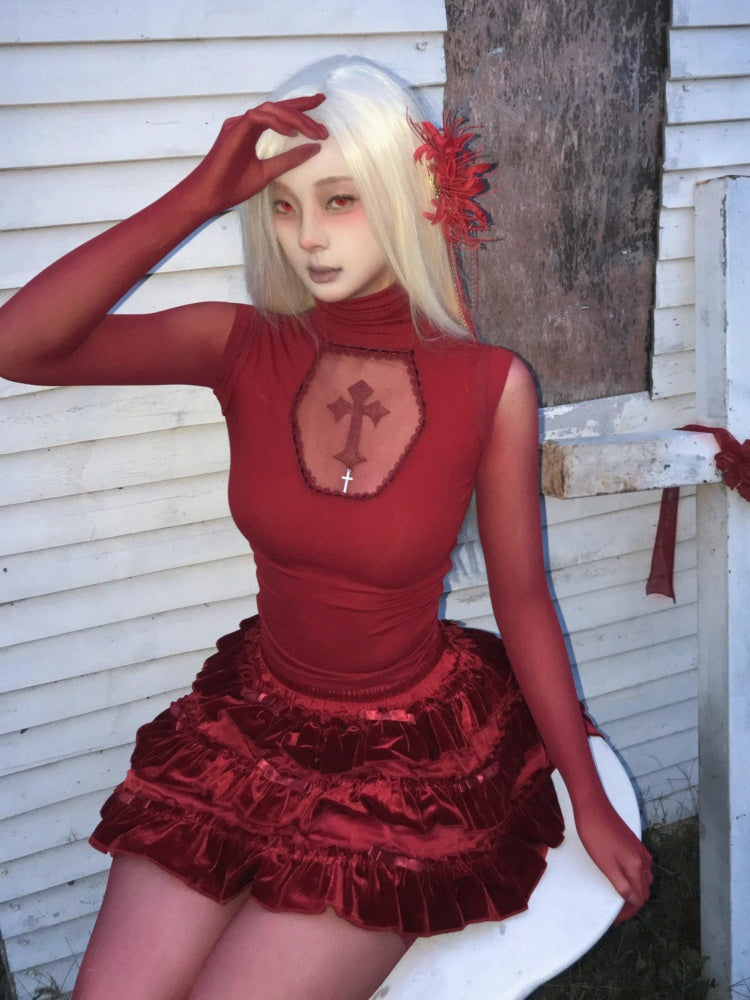 Blood-Stained Gothic Cross Cut-Out Turtle Neck Tops【s0000013579】