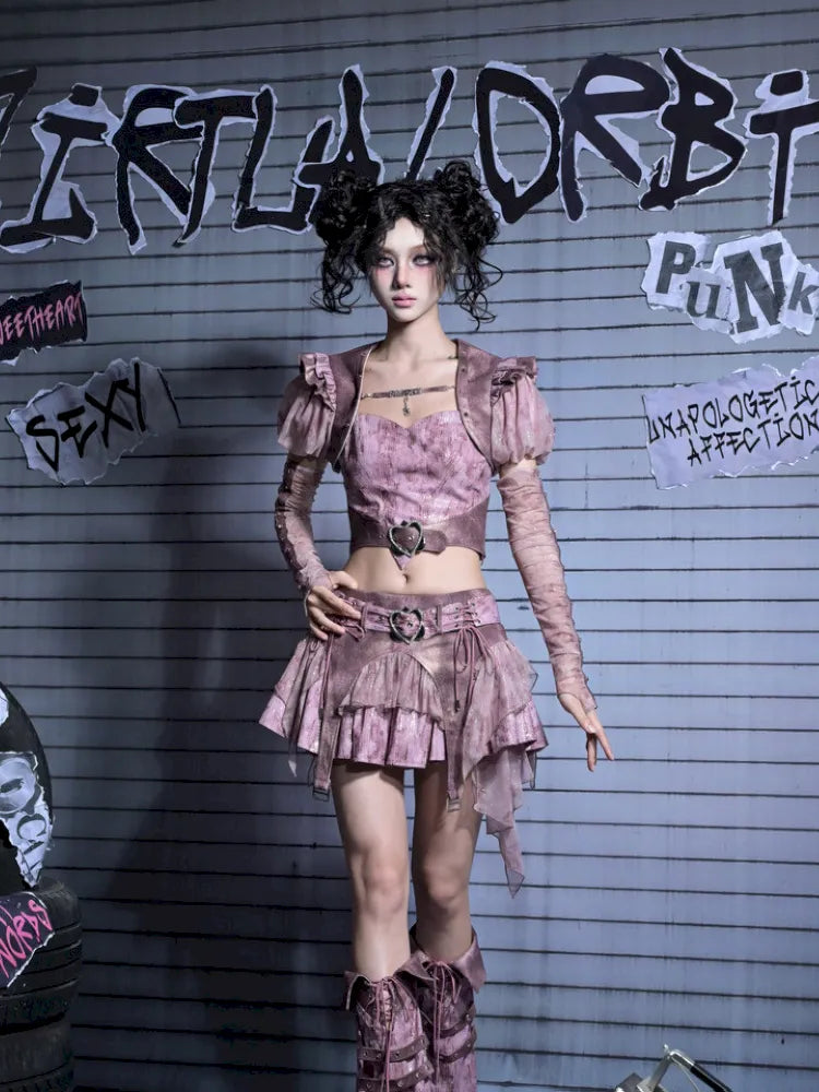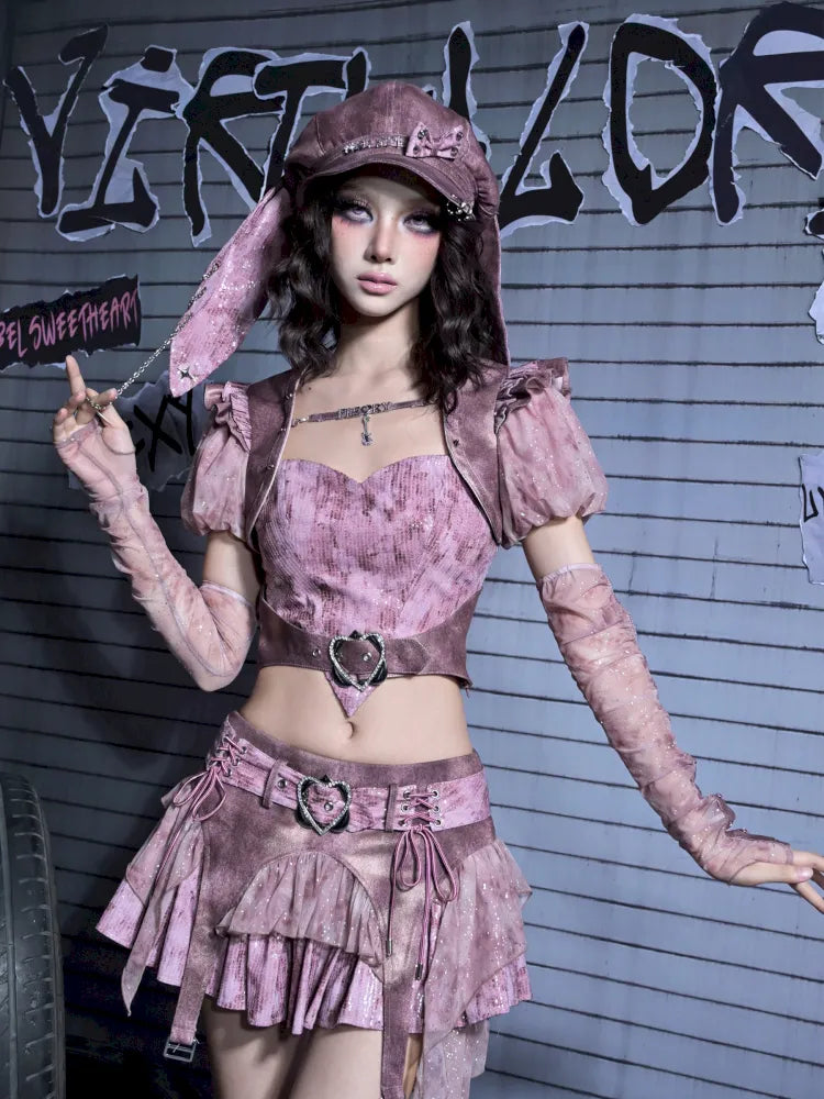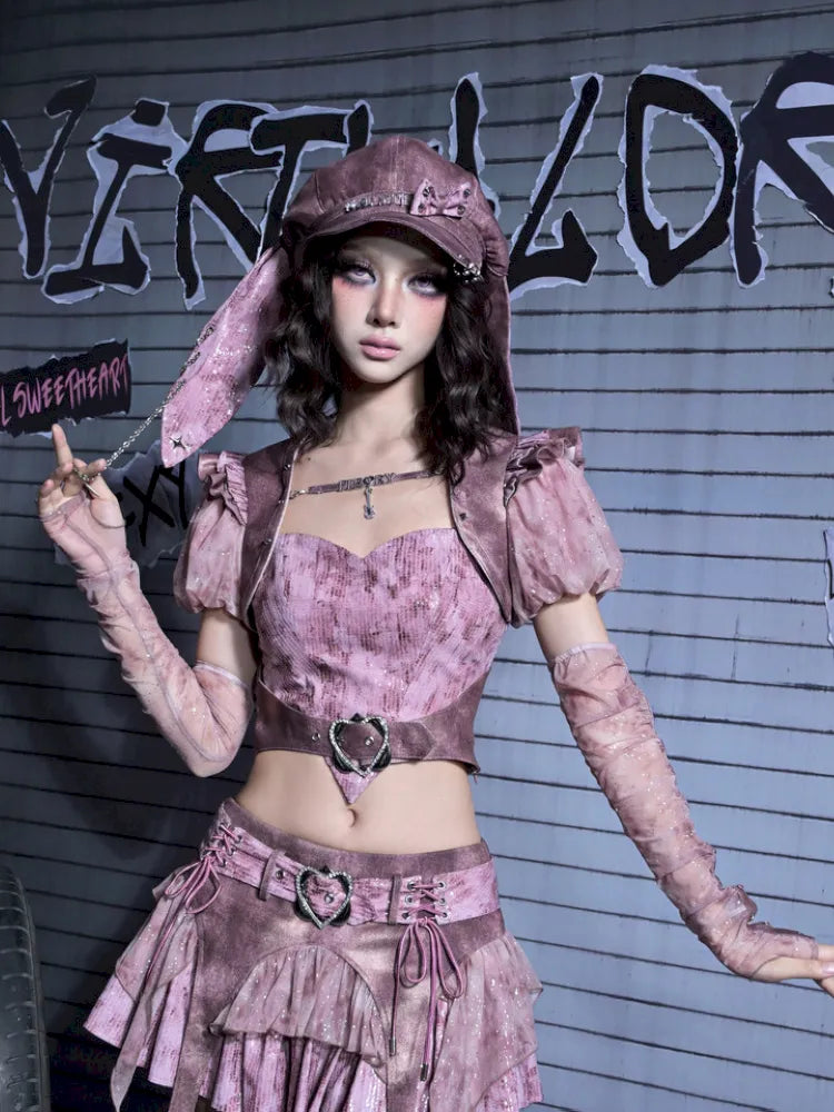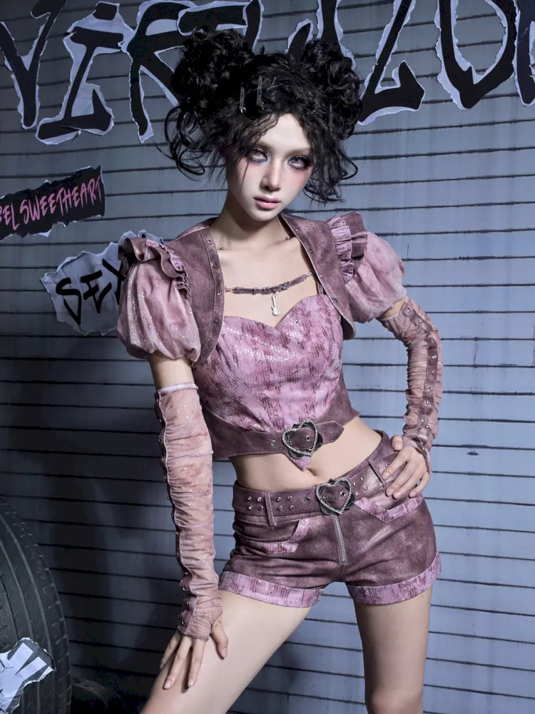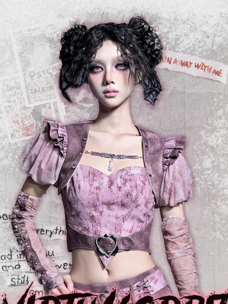 Puff Sleeve Heart-Print Strapless Two-Piece Top【s0000014027】