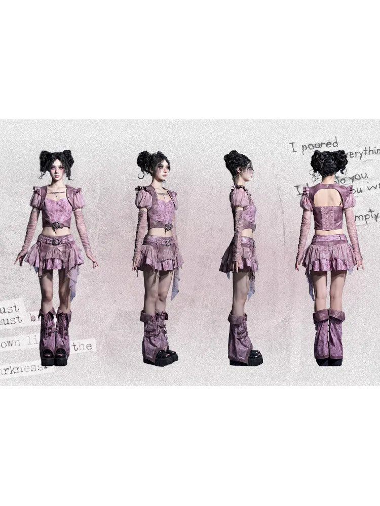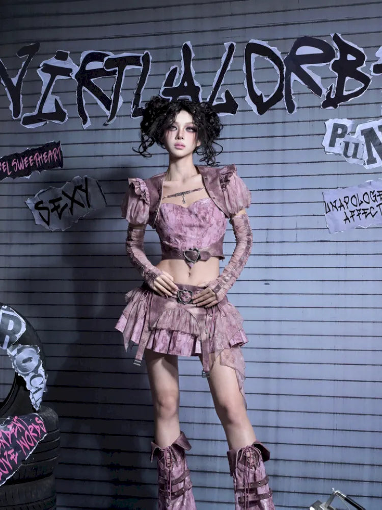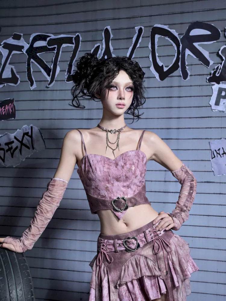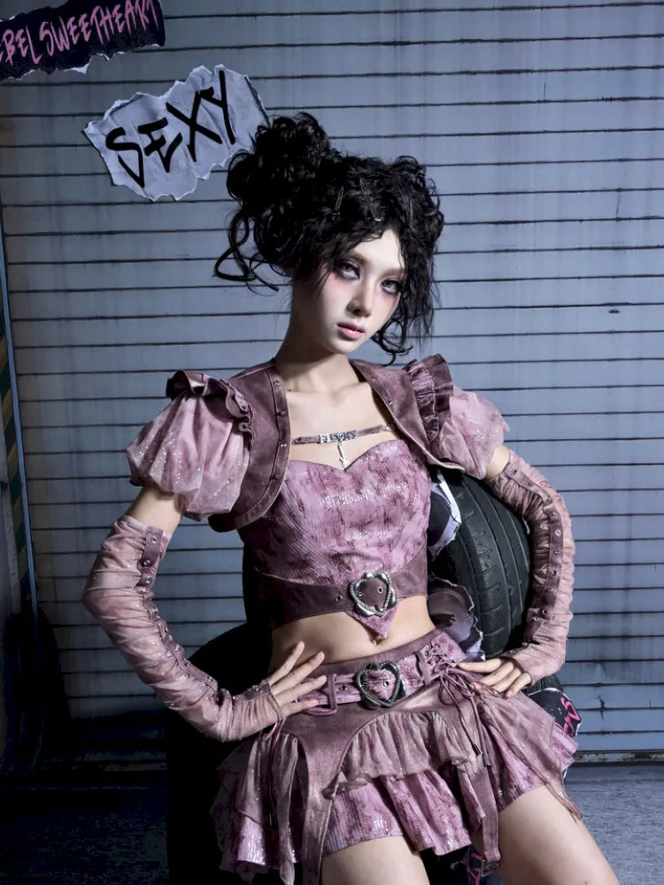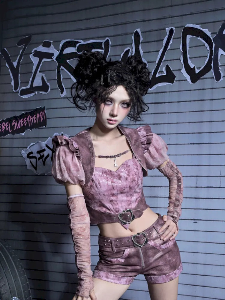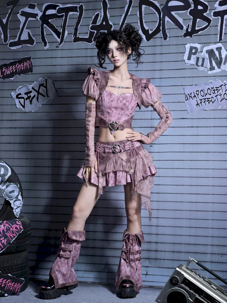 Puff Sleeve Heart-Print Strapless Two-Piece Top【s0000014027】