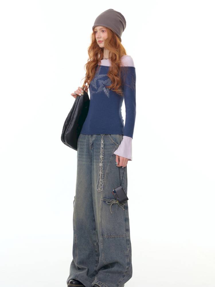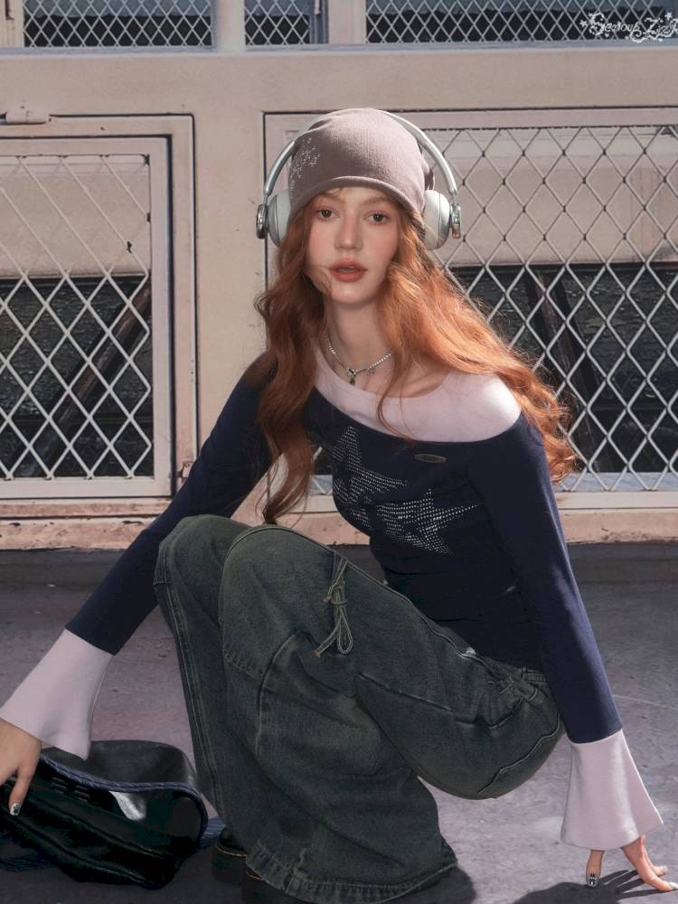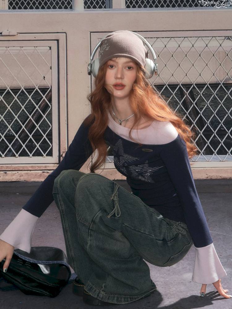 Star Print Dark Blue Long Sleeve T-Shirt【s0000014361】