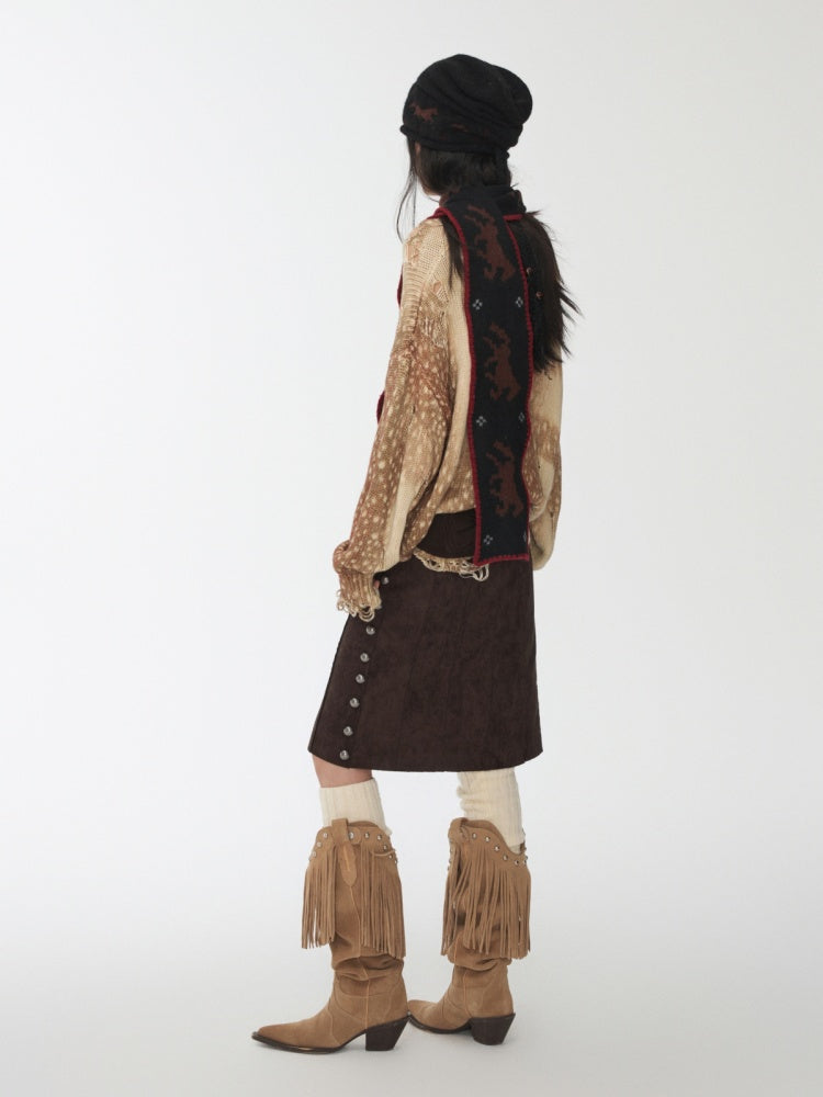 Vintage Fawn Print Cut-Out Hole Knit Lazy Loose Crew Neck Big Sweater【s0000014598】