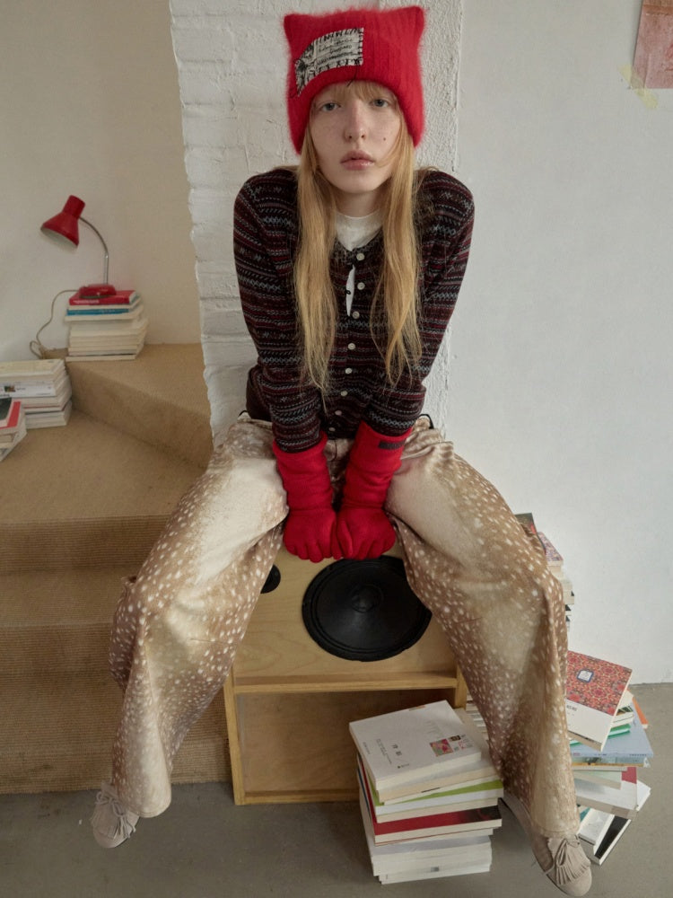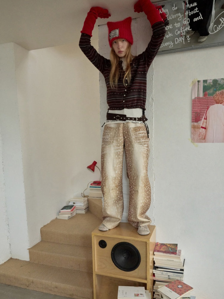 Vintage Fawn Print Contrast Embroidered Scimitar Pants Low-Rise Loose Wide-Leg Trousers【s0000014599】