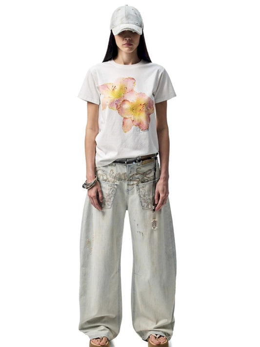 Vintage Yellow Mud Distressed Wide-Leg Jeans【s0000014873】