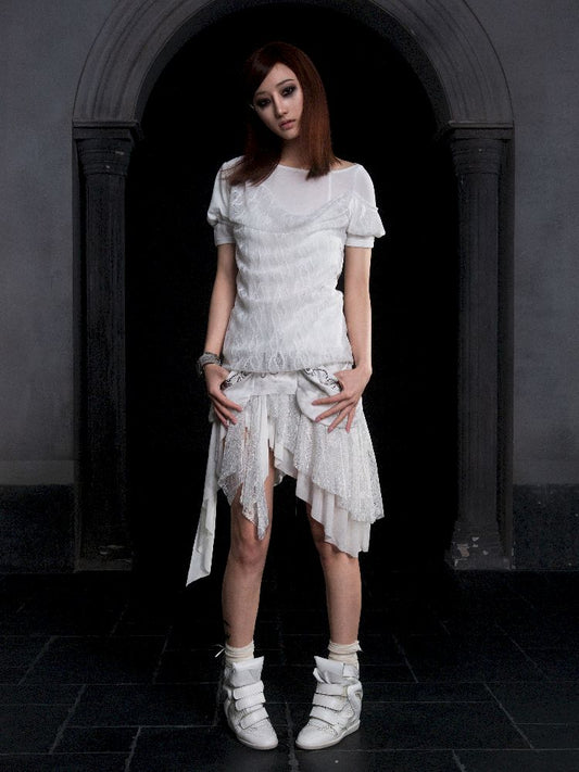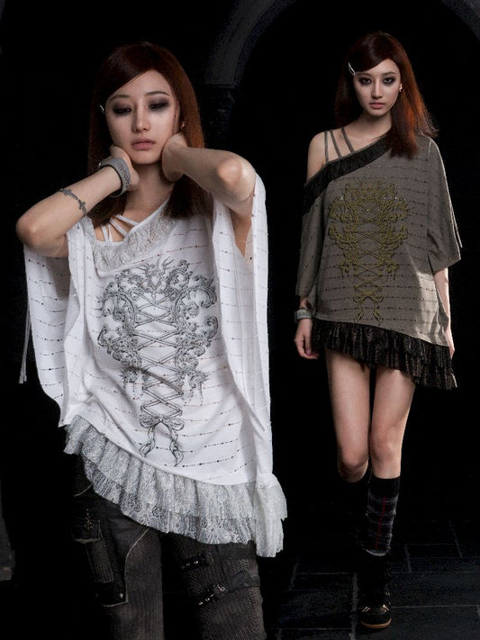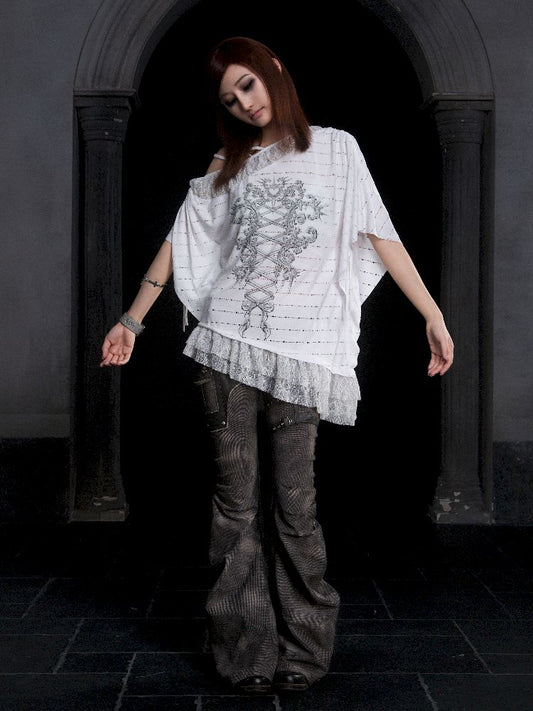 Drawstring Bat Sleeve Lace t-shirt【s0000012311】