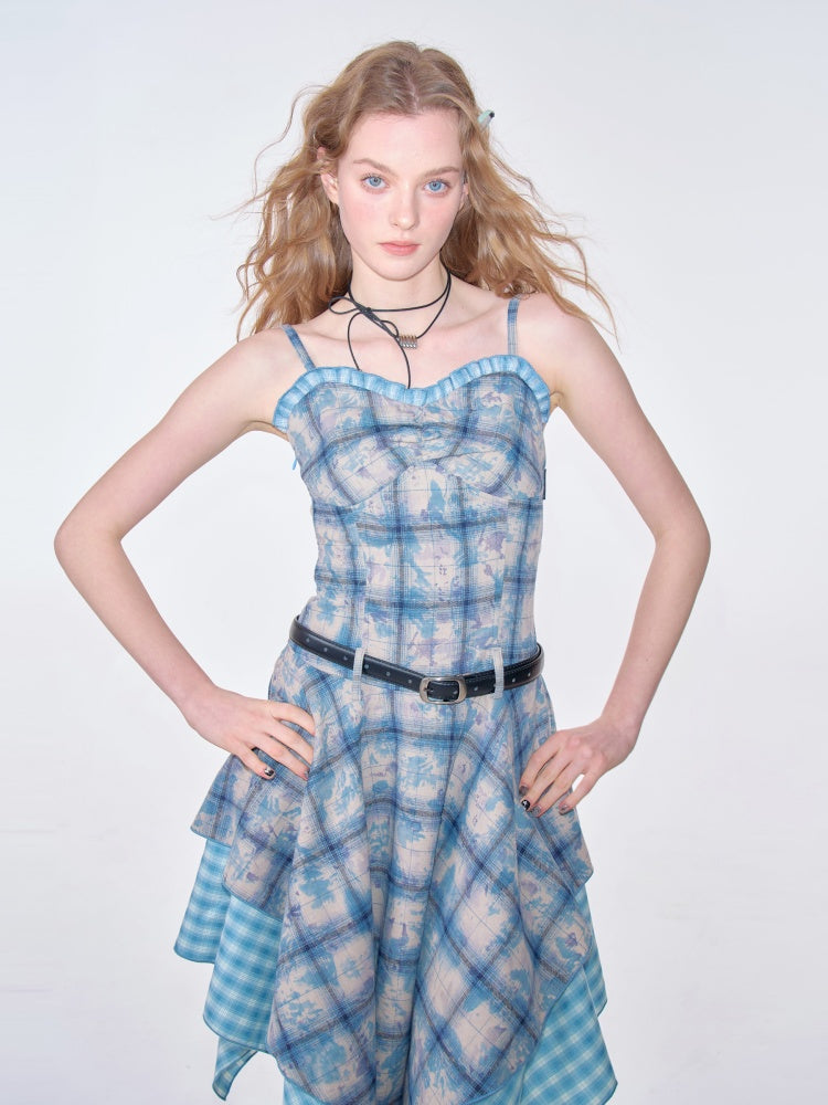 Asymmetric Hem Gingham Check Pattern Flare Camisole Dress【s0000011749】