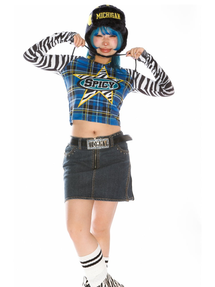College Style Zebra & Check Print Long Sleeve Cropped T-Shirt【s0000011786】