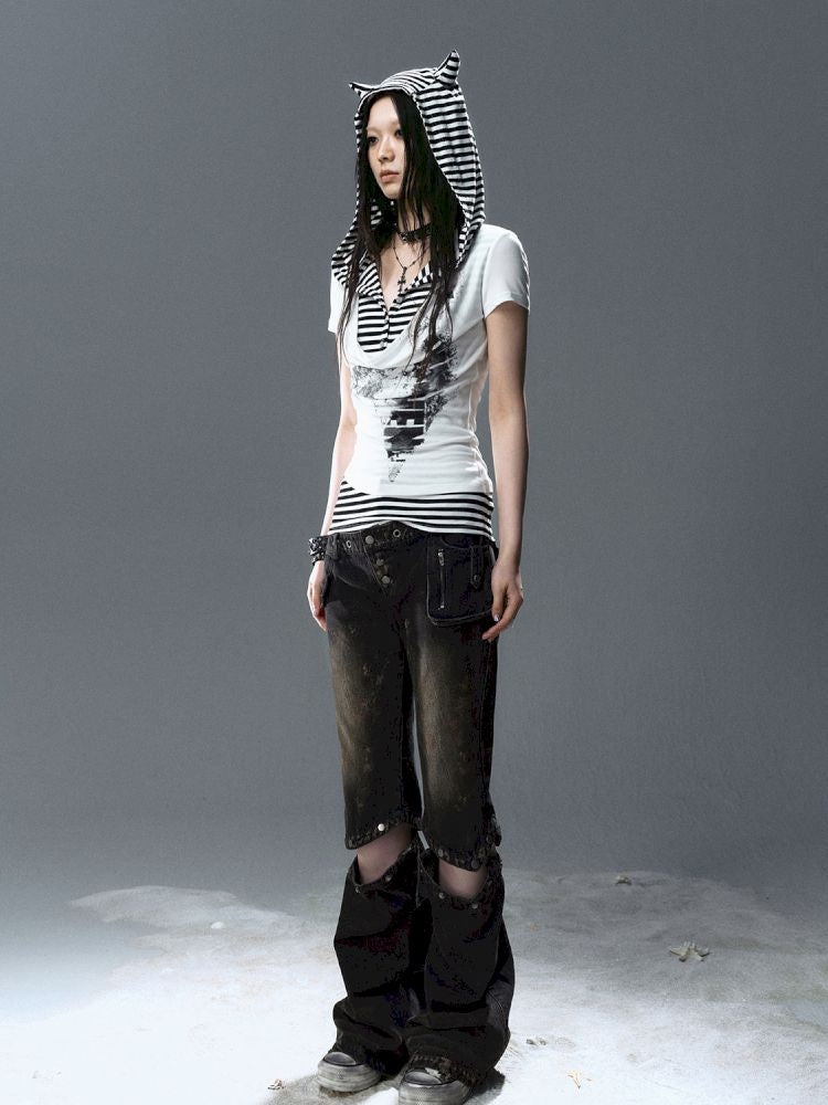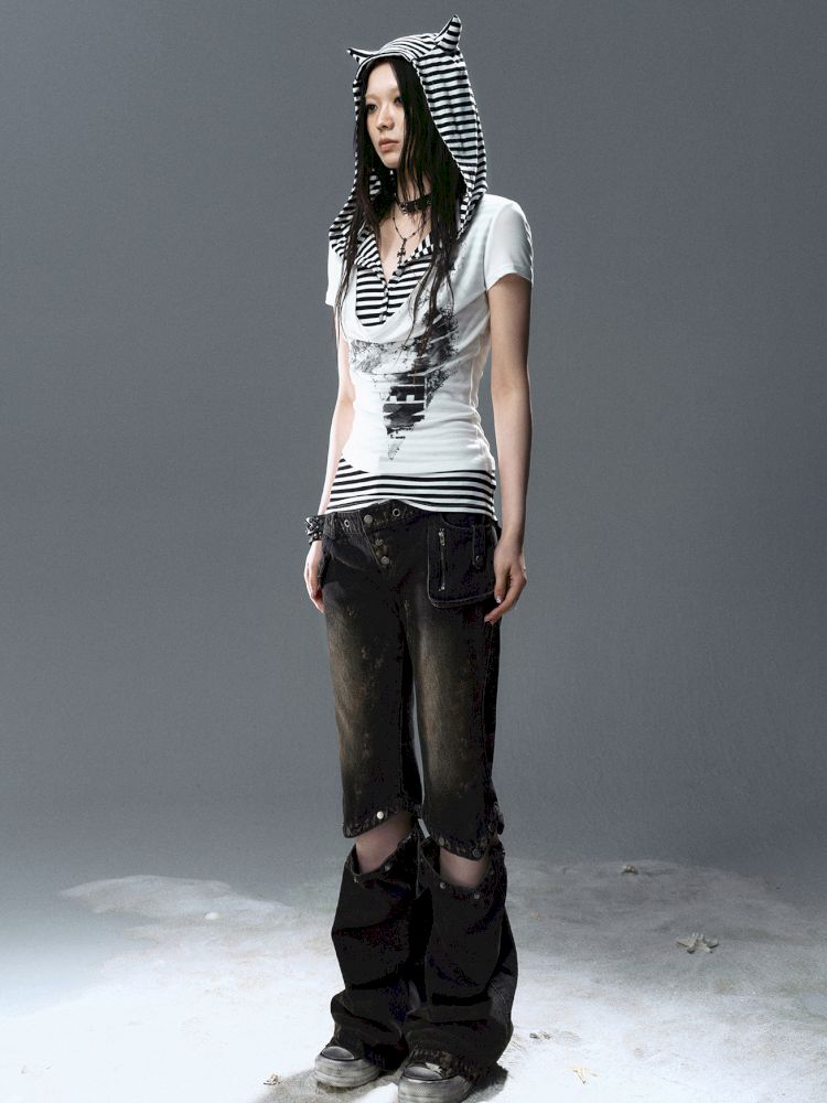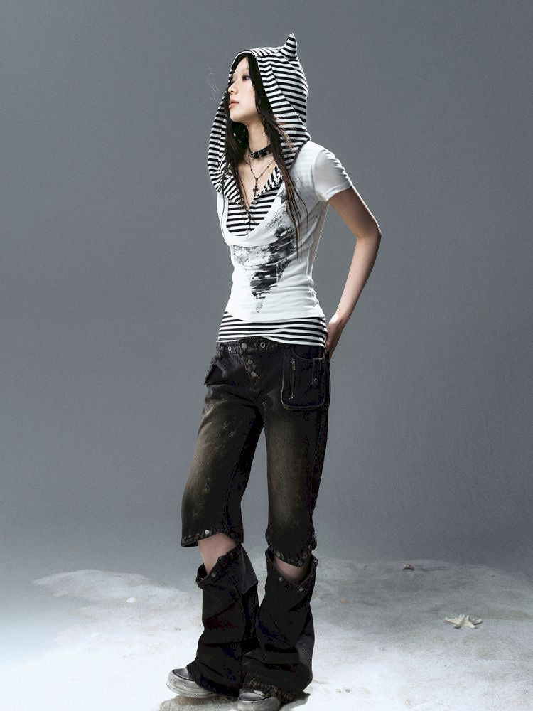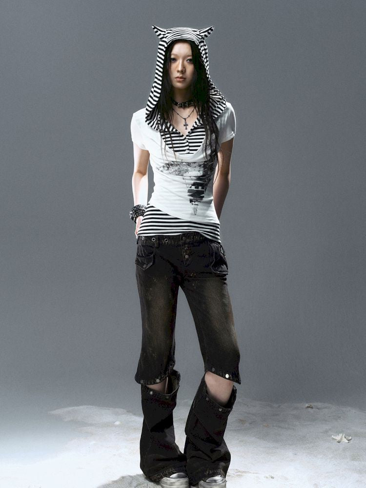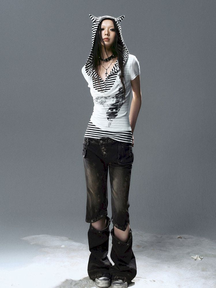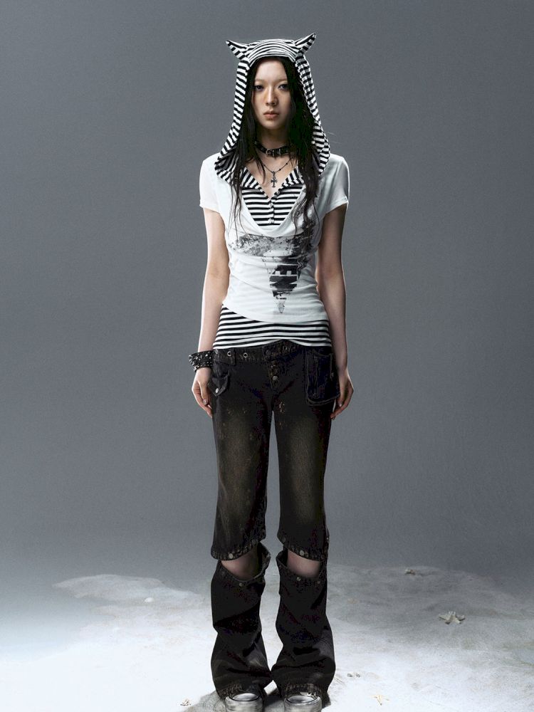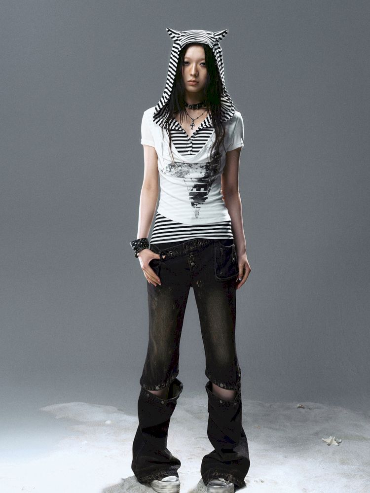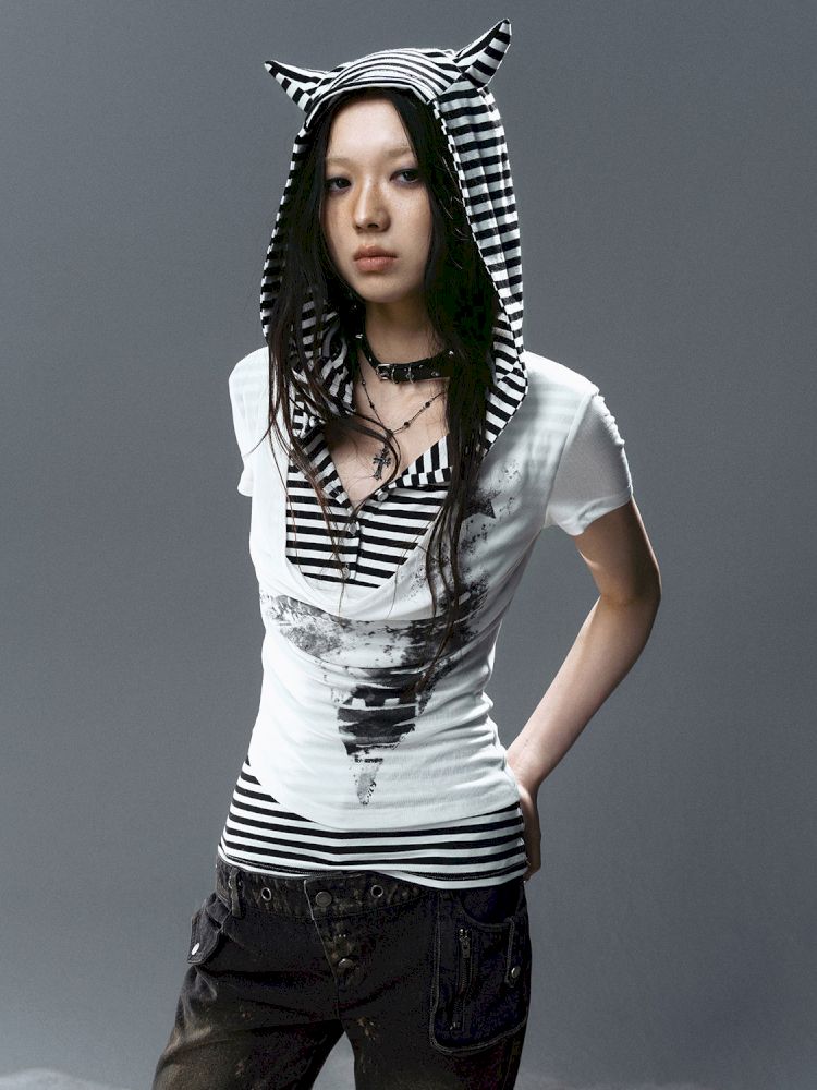 Swing Neck Striped Short Sleeve T-Shirt【s0000012807】
