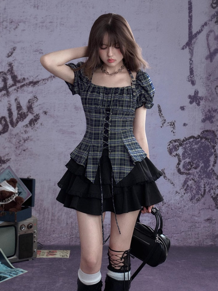 Buckle Strap Halter Neck Irregular Hem Plaid Puff Sleeve Corset Tops【s0000013120】