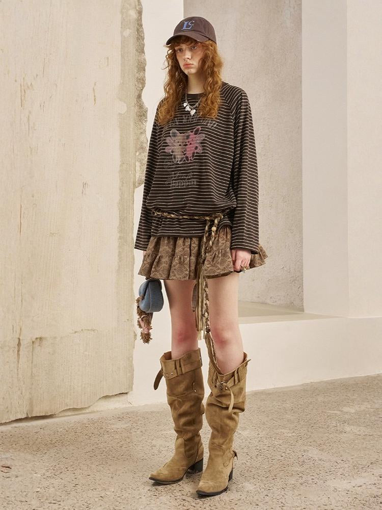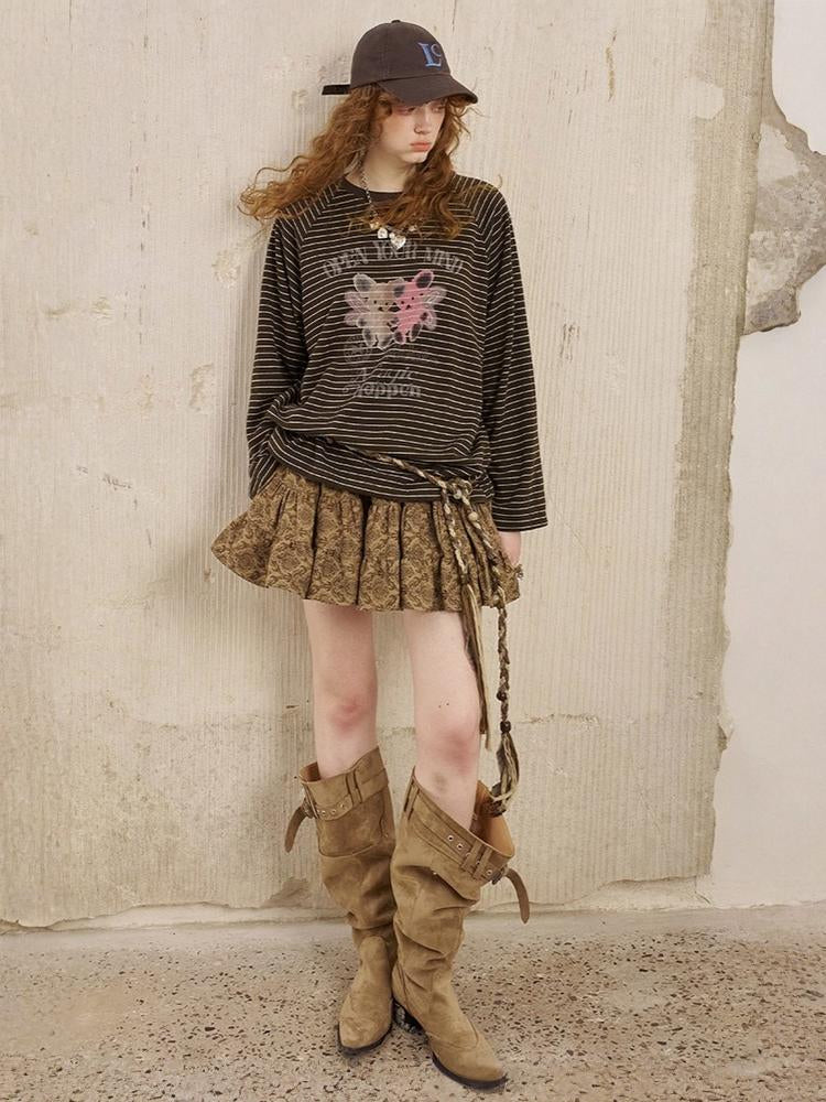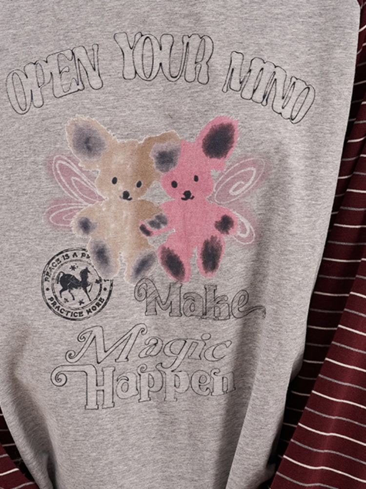 Two Bear Print Thin Striped Long Sleeve Loose T-Shirt【s0000013777】