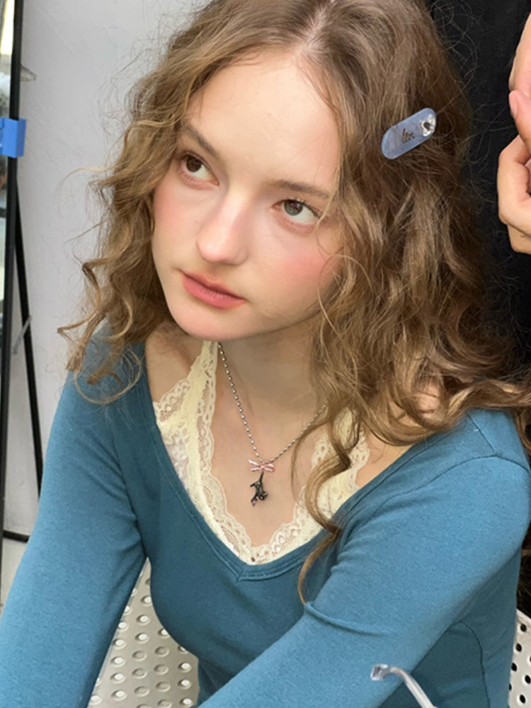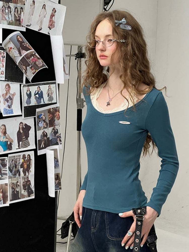 Faux Layered Lace Halter Neck Long Sleeve T-Shirt【s0000013782】