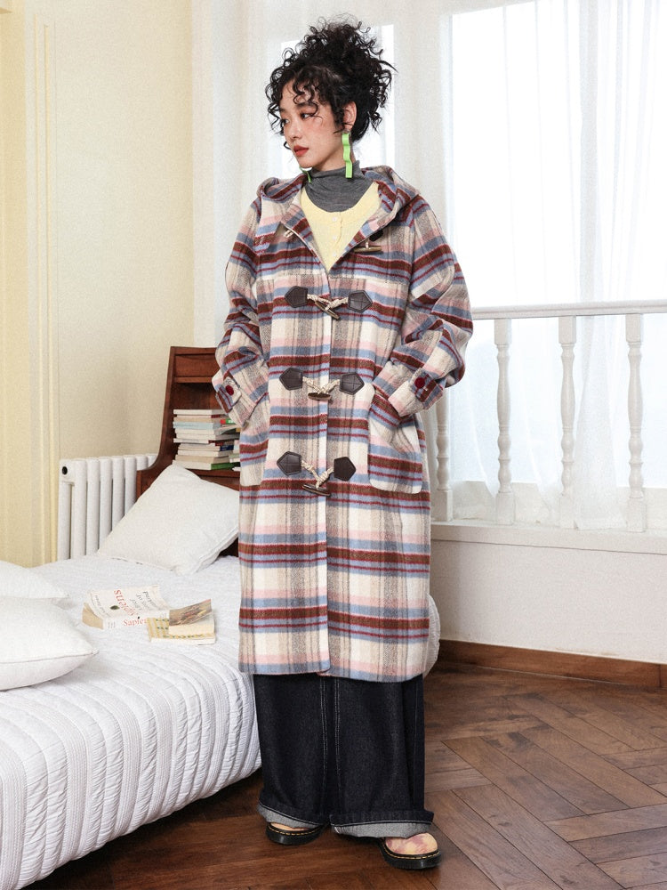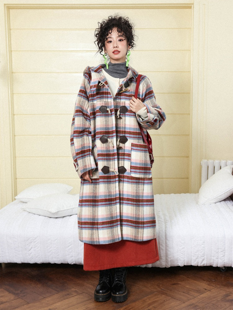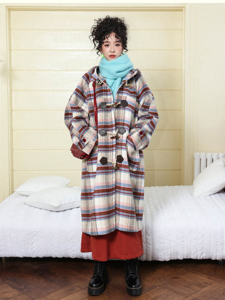 "Velvet Dream Holiday" Large Plaid Horn Buckle Hooded Wool Coat【s0000014280】