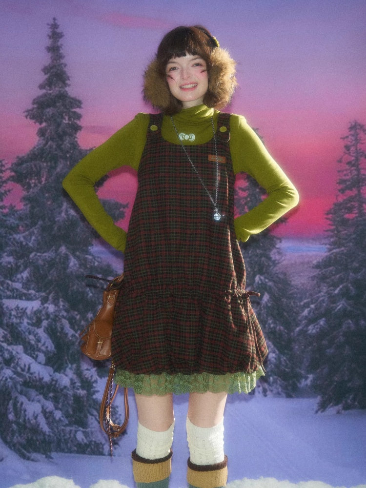 American Retro Design Plaid Lace Hem Vest Dress【s0000014776】