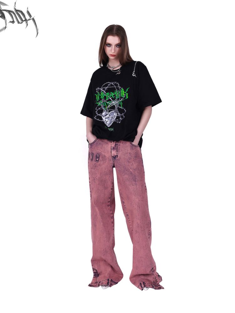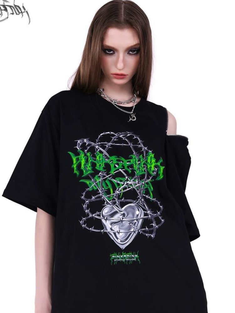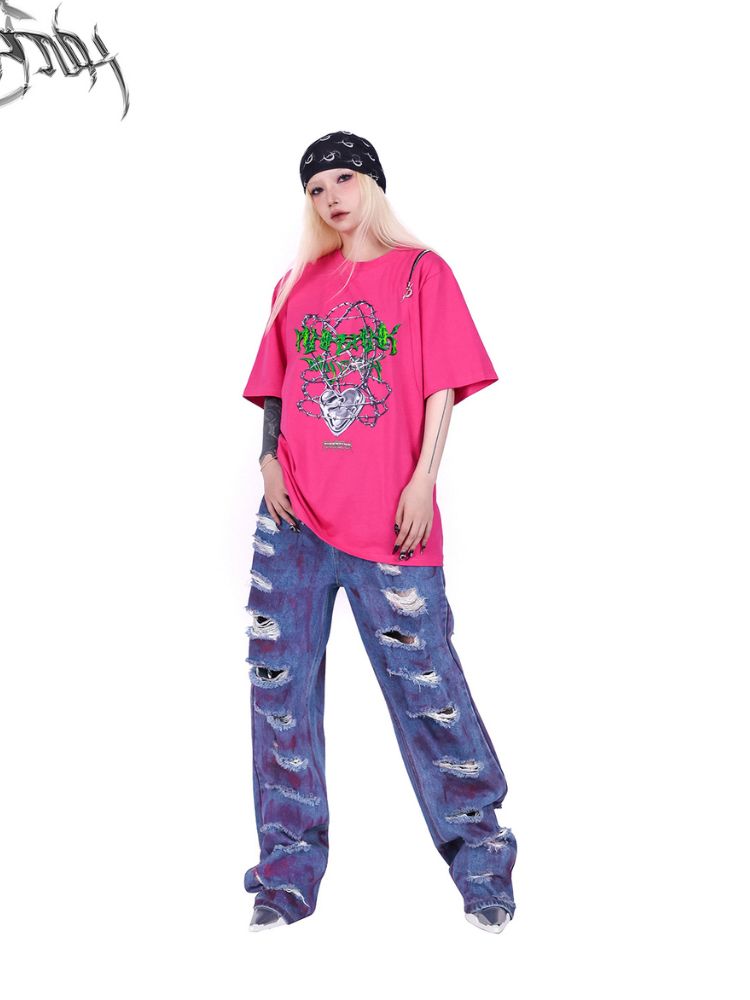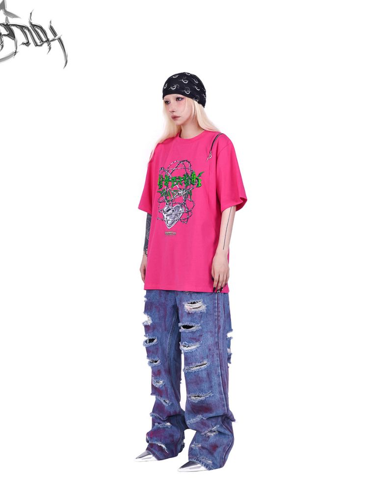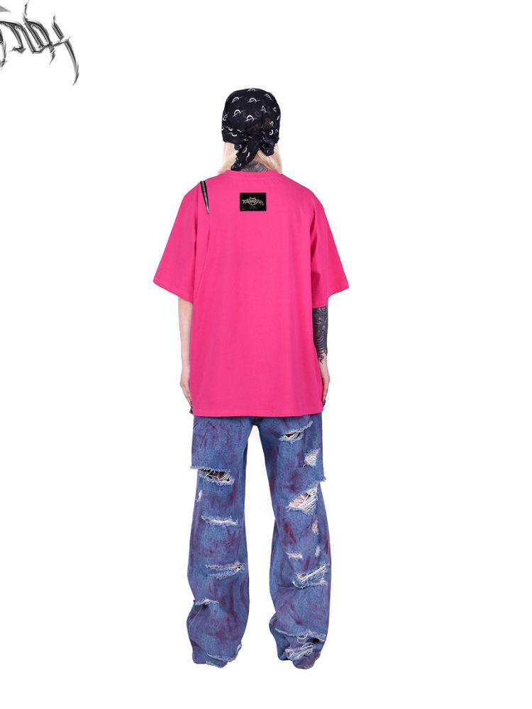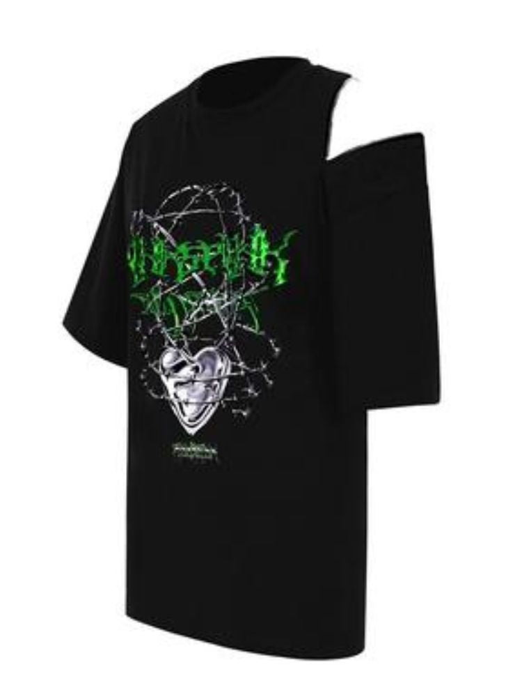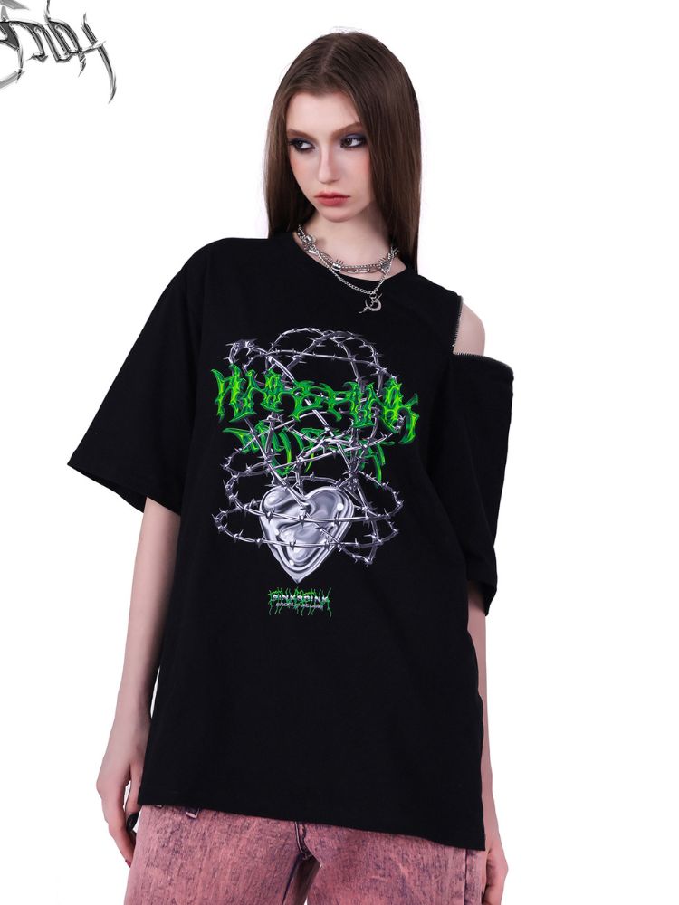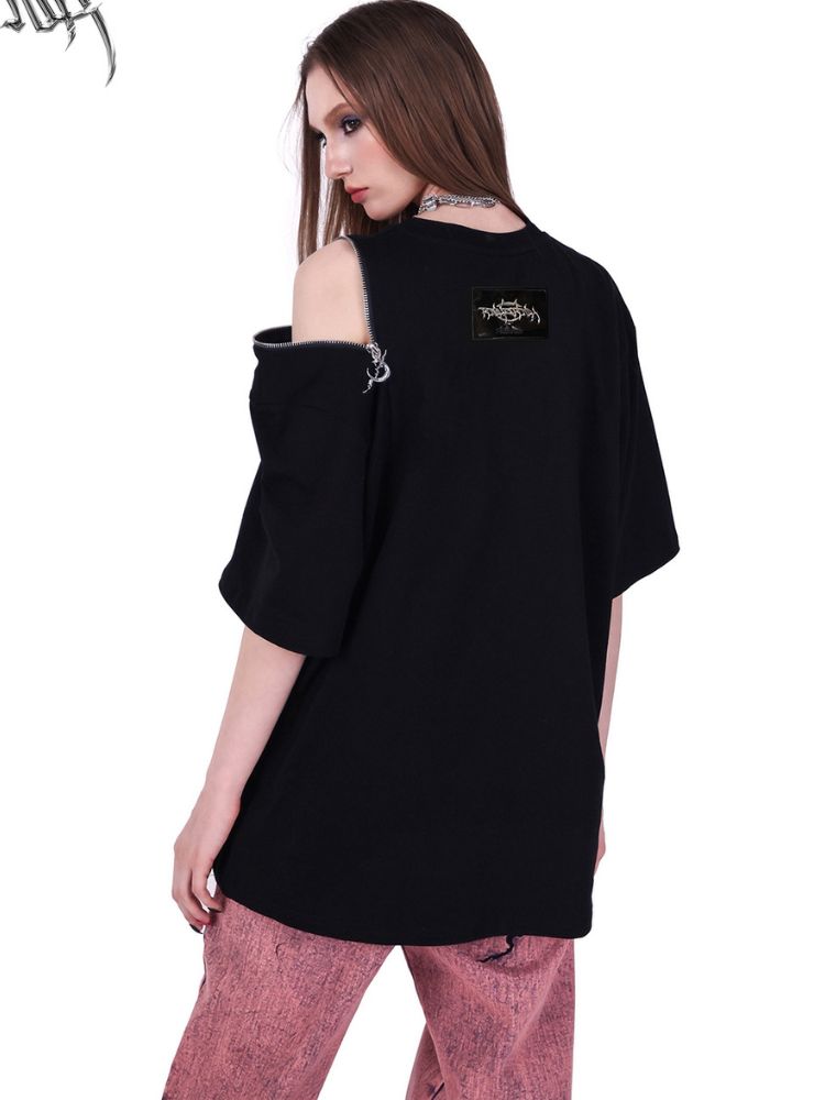 Zipper leak shoulder loose printed T-shirt【s0000002024】