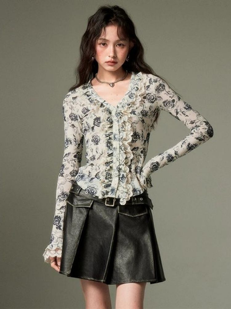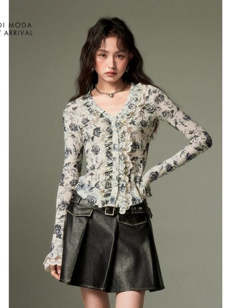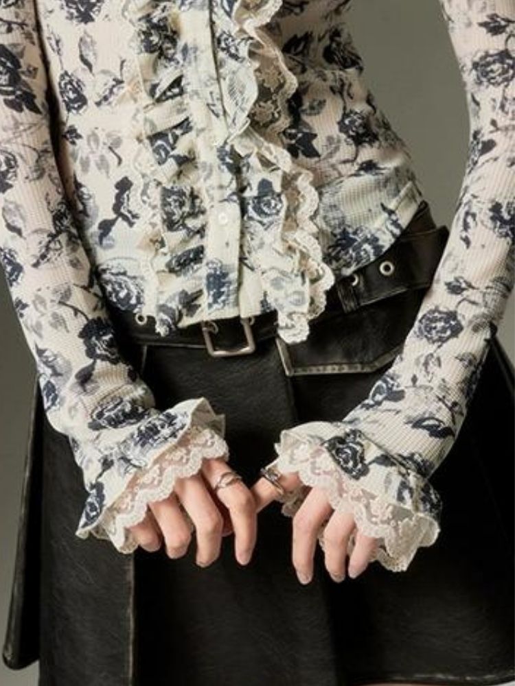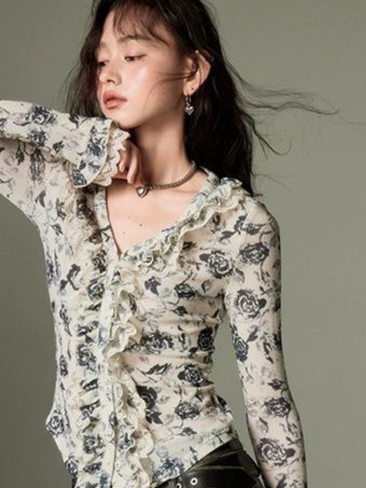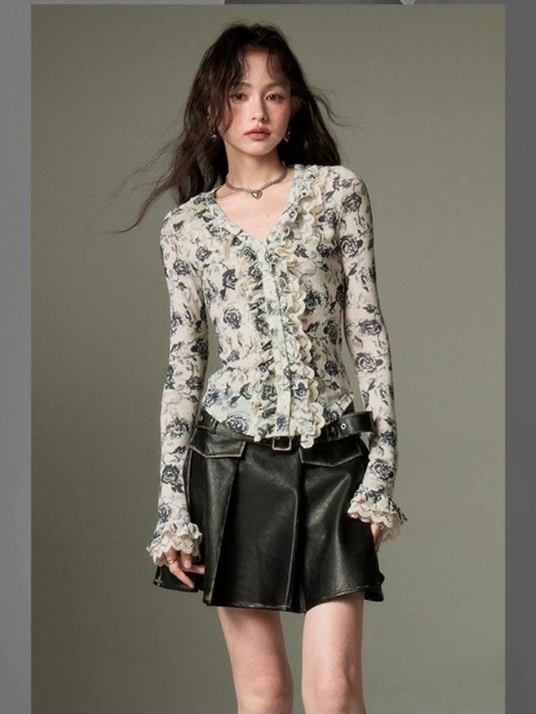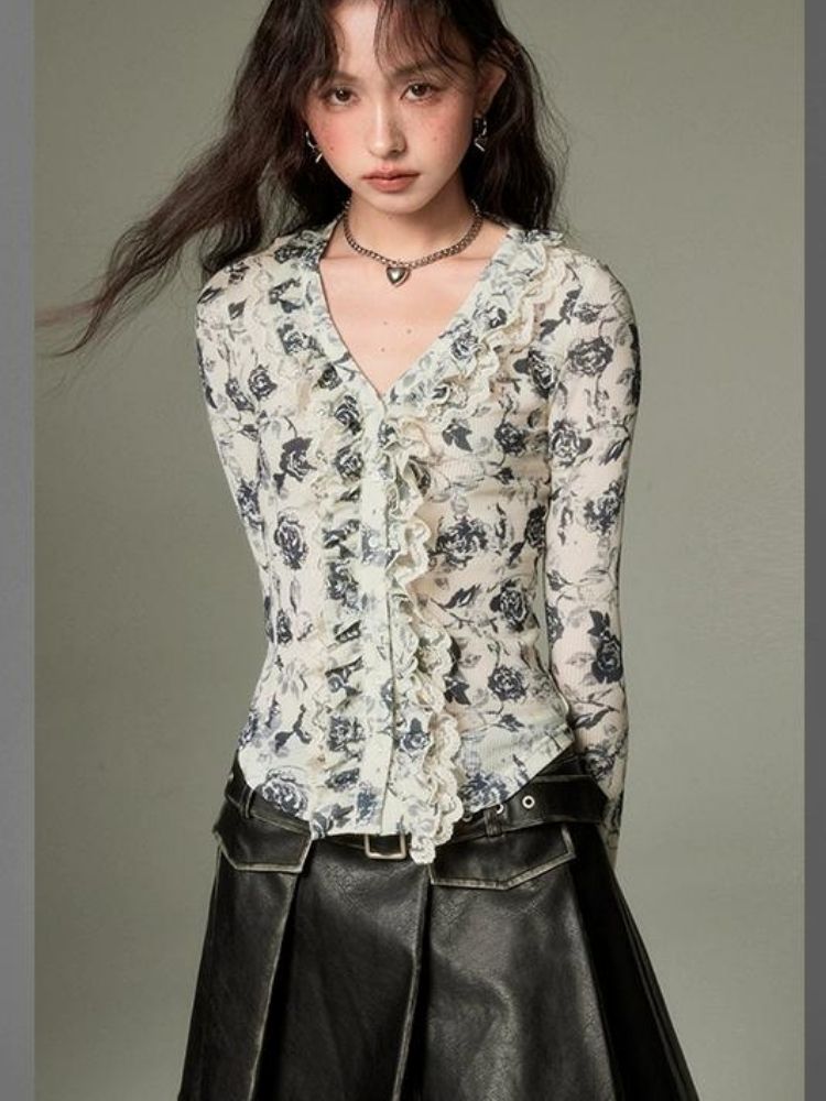 Floral lace long-sleeved v-neck shirt【s0000003270】
