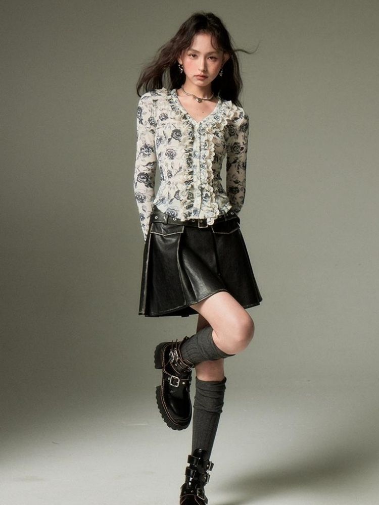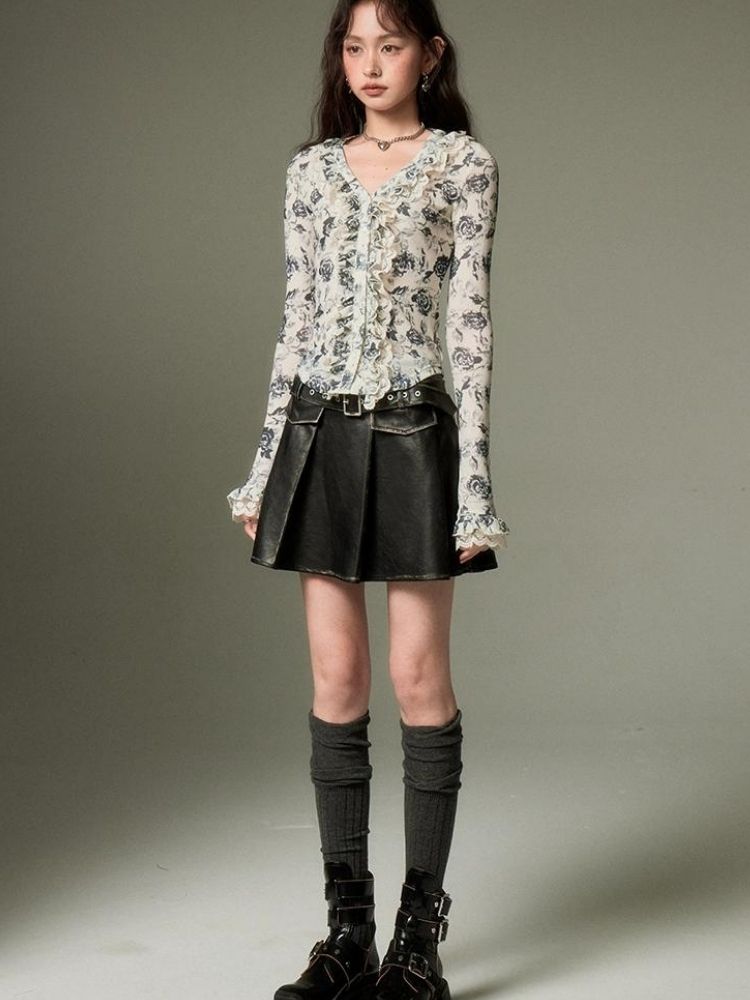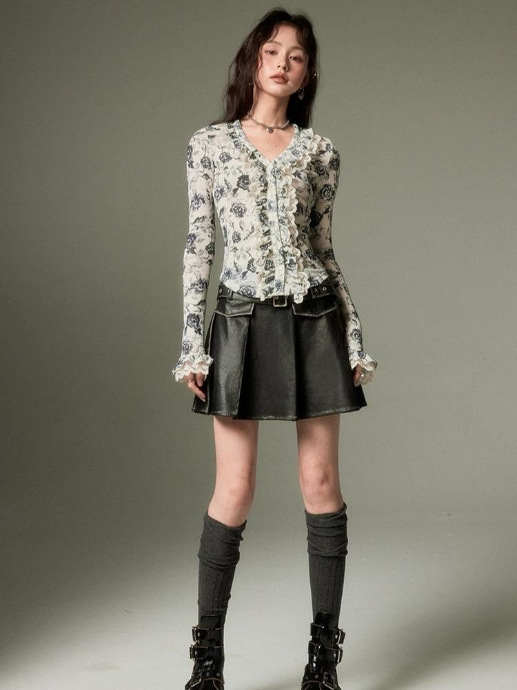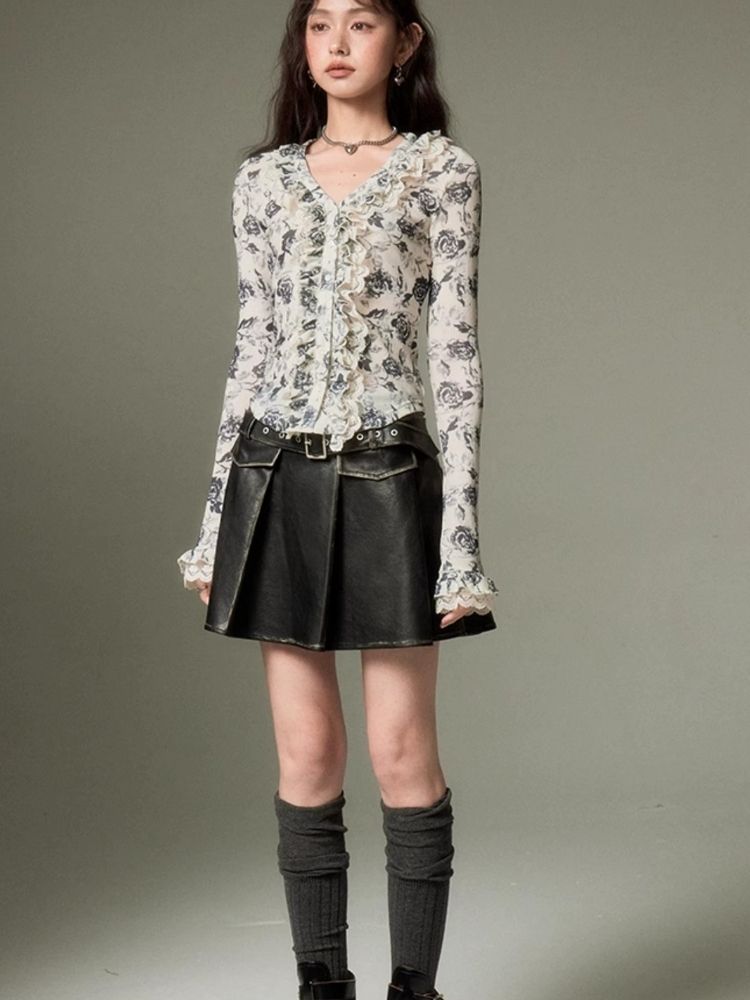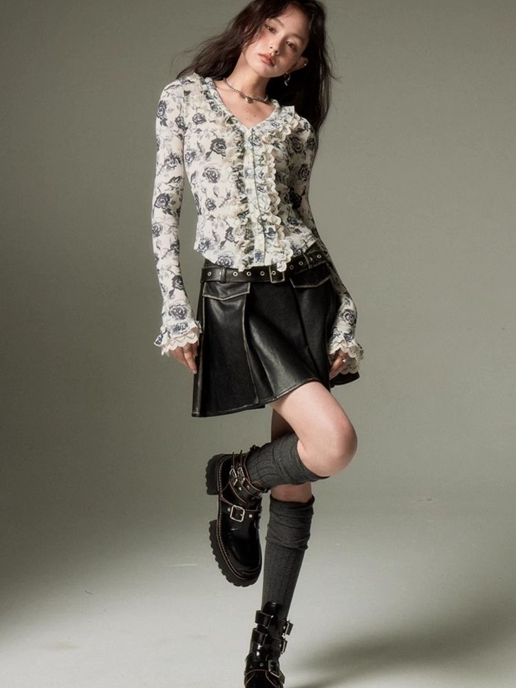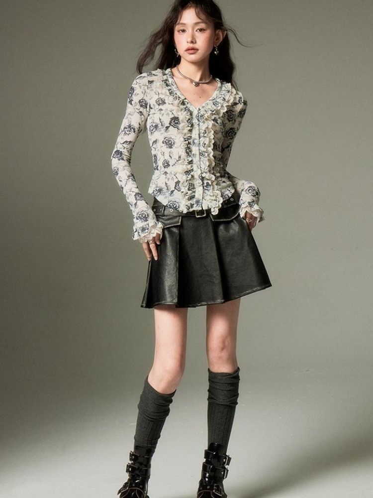 Floral lace long-sleeved v-neck shirt【s0000003270】