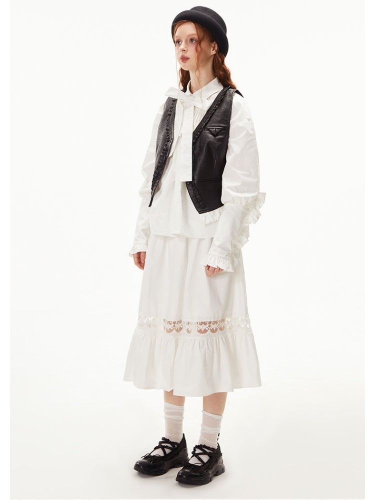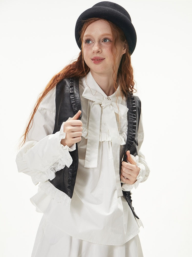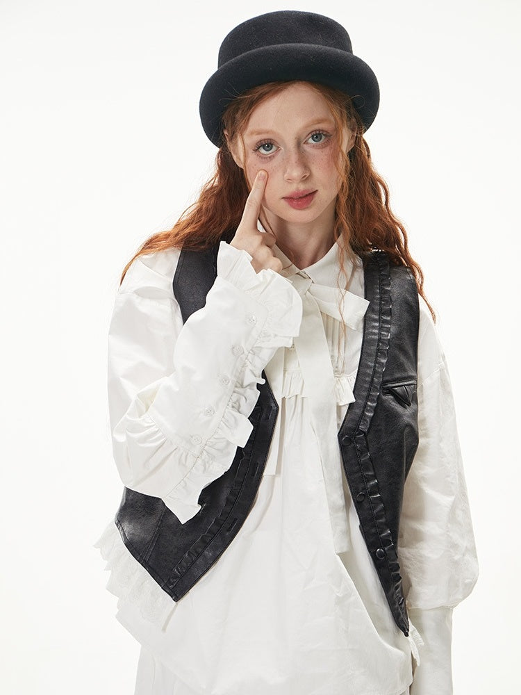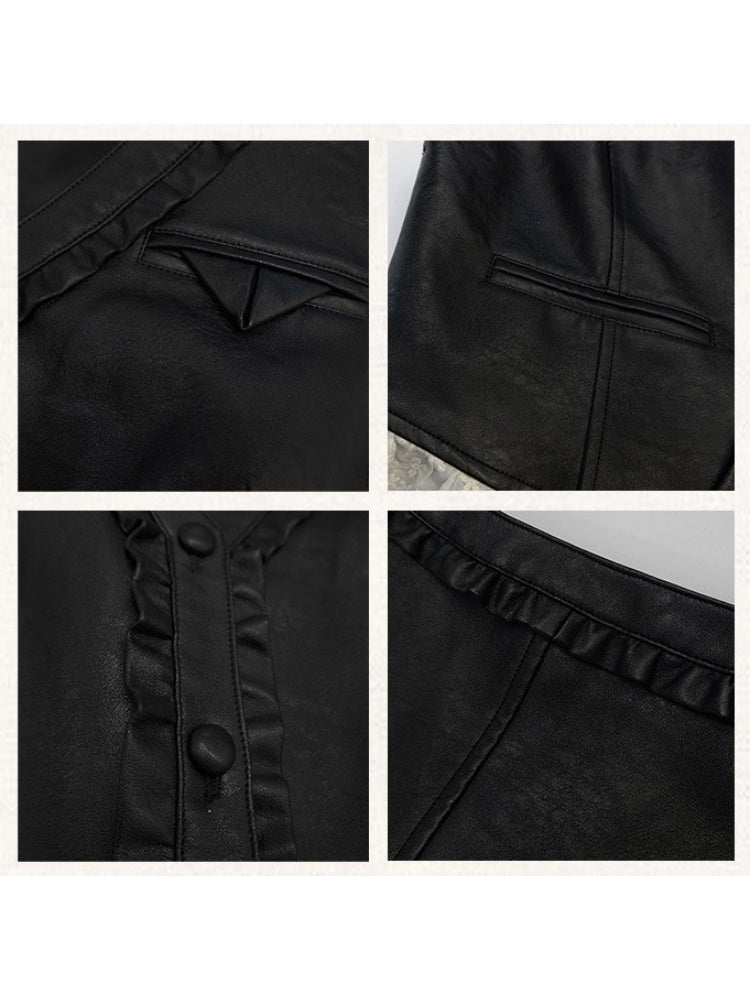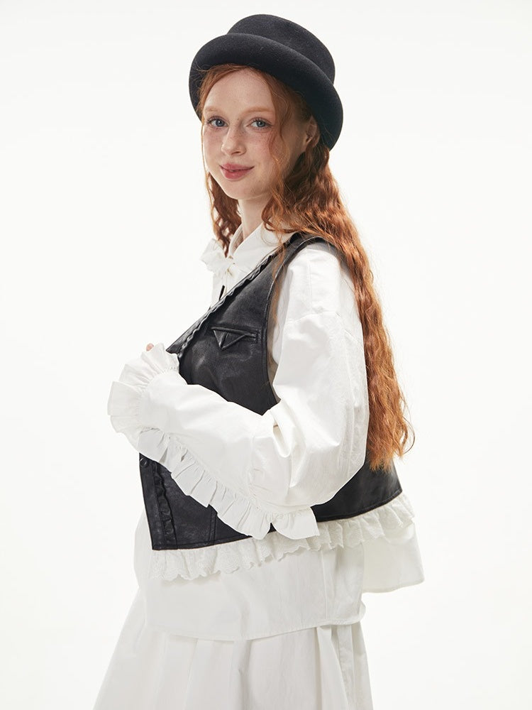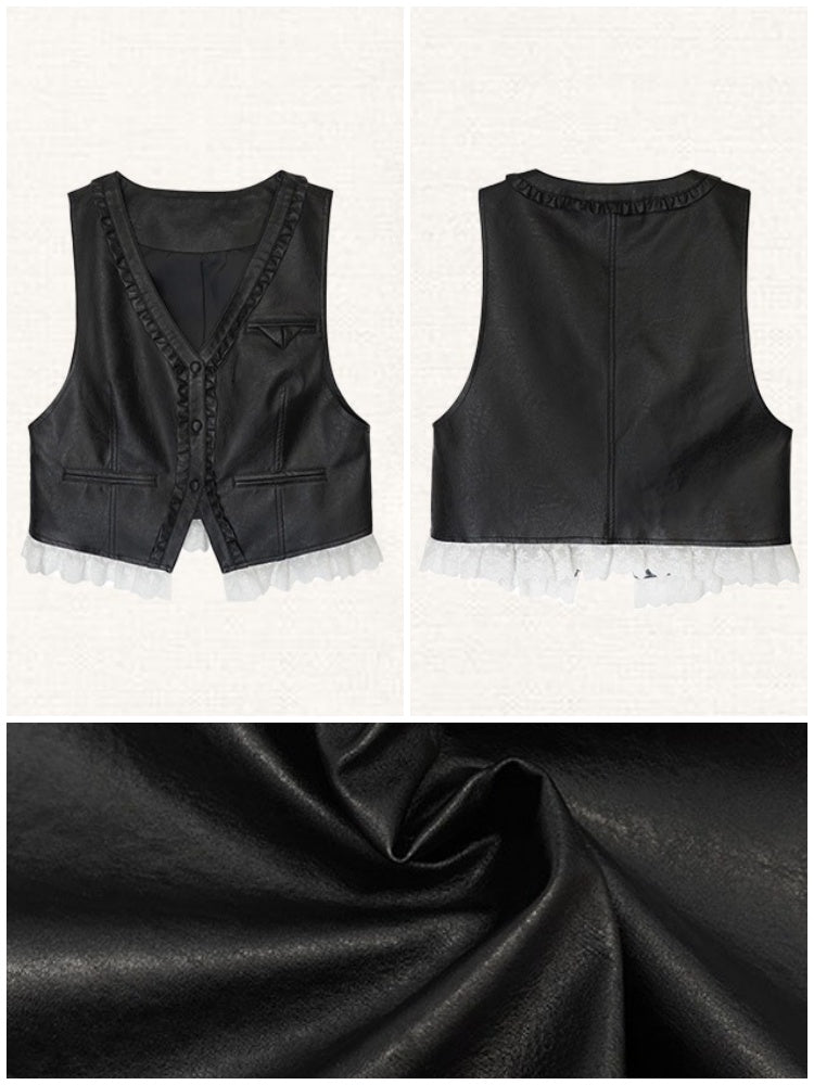 Ruffle Lace V-Neck PU Leather Vest【s0000003546】