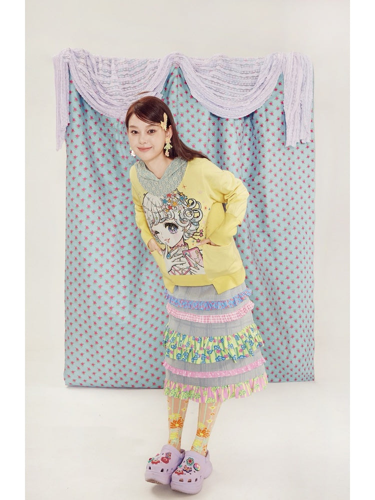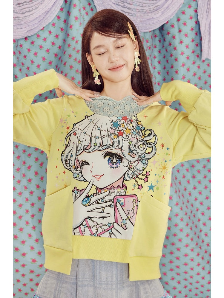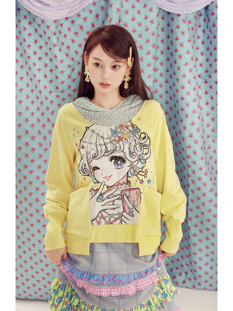 Shimizu Illustration Comic Girl Print Flower Lace Irregular Hem Hoodie【s0000003653】