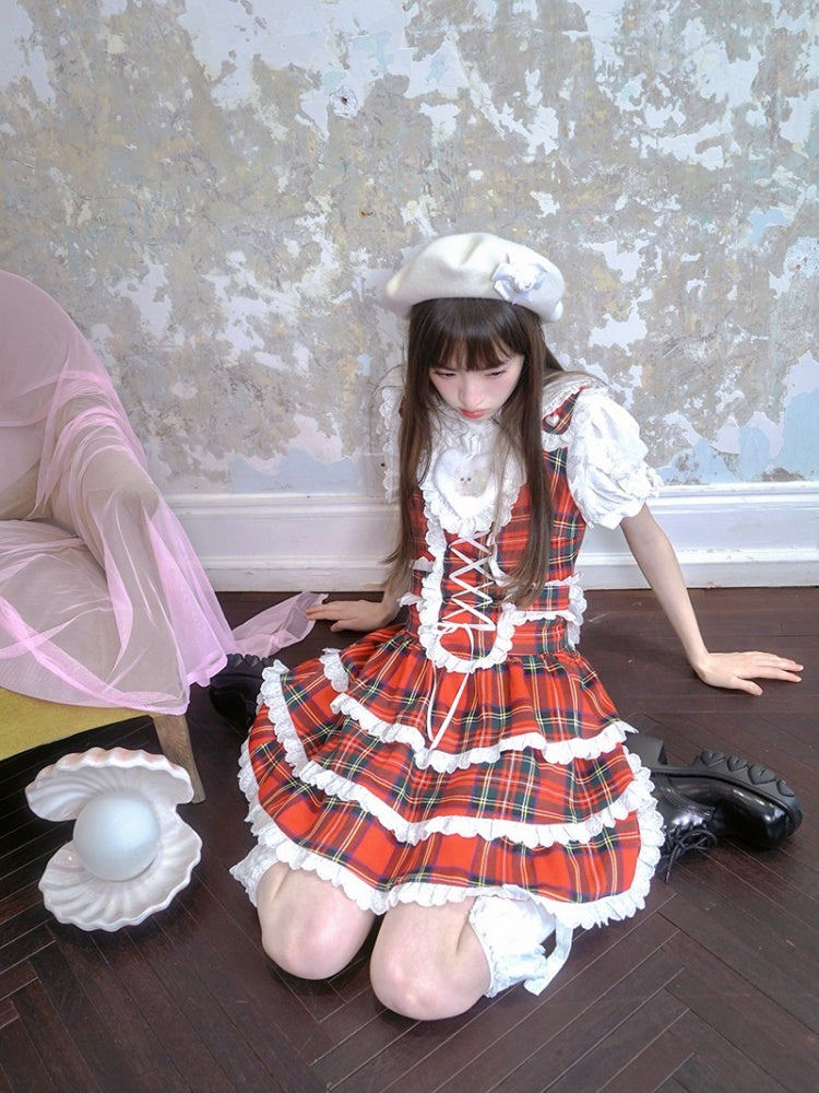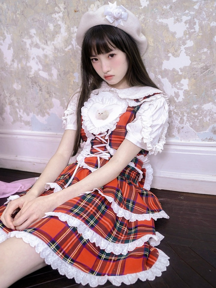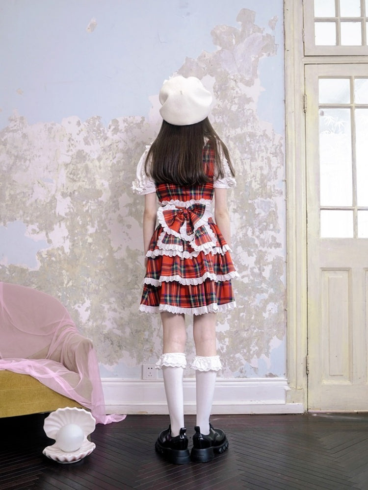 Retro Plaid Cat Print Ruffle Lace Cake Dress【s0000003815】