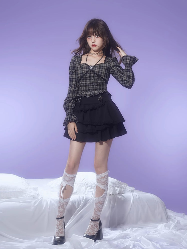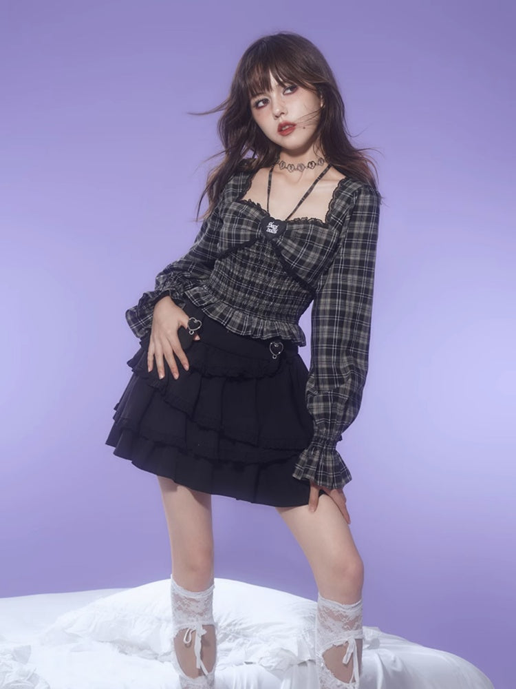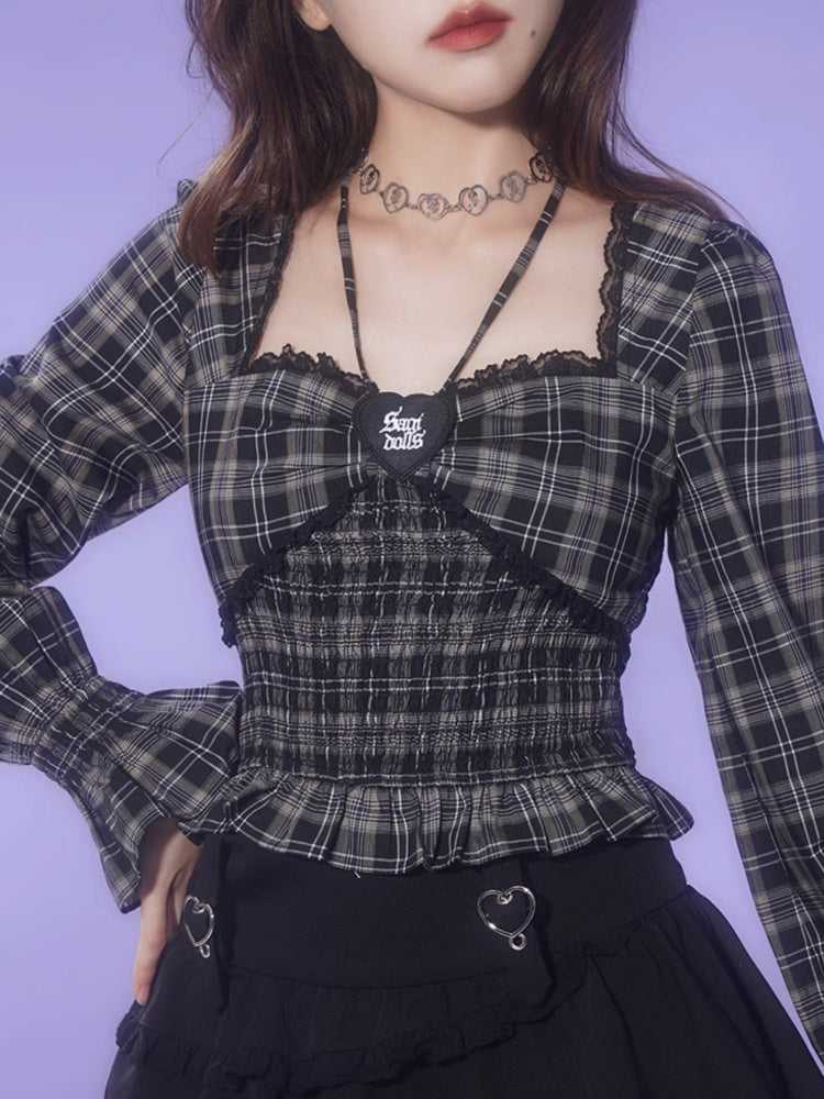 Plaid Halter Neck Puff Sleeve Tops【s0000003826】