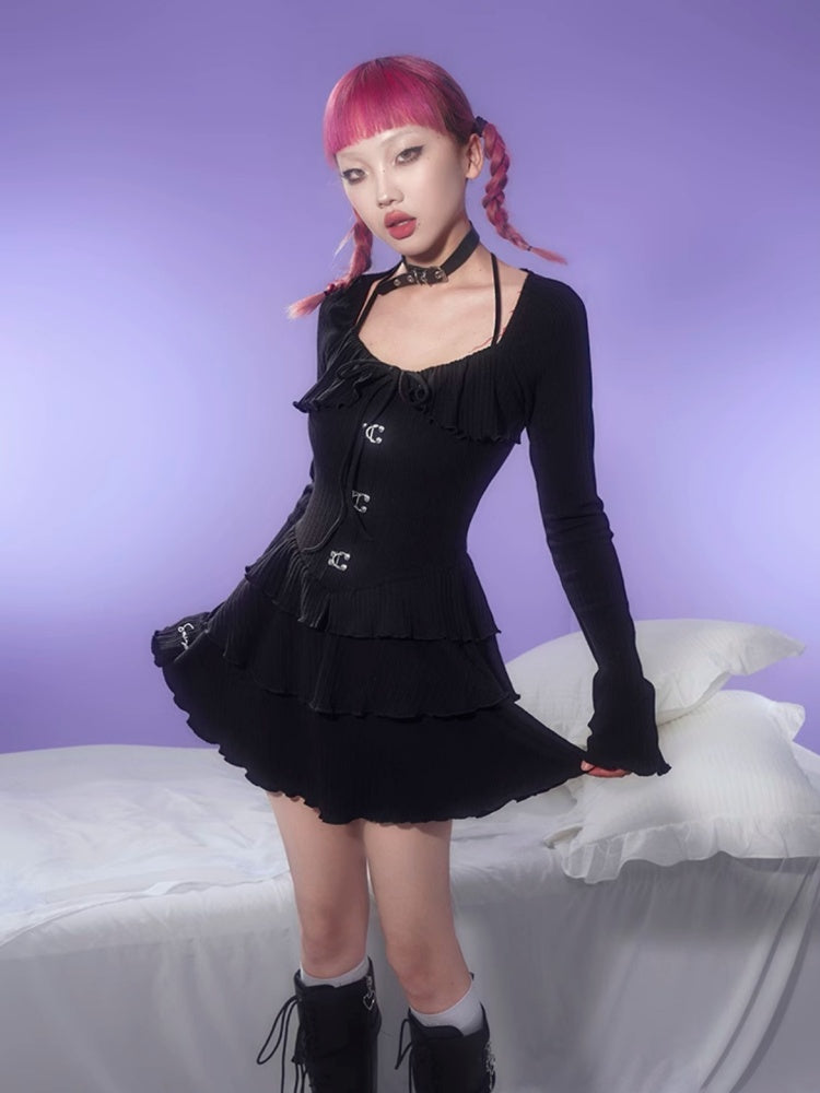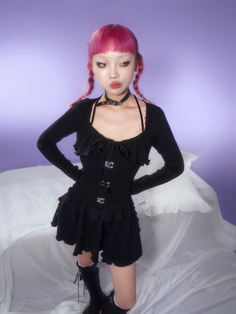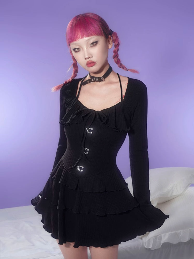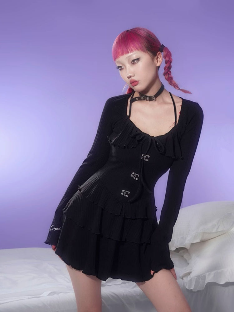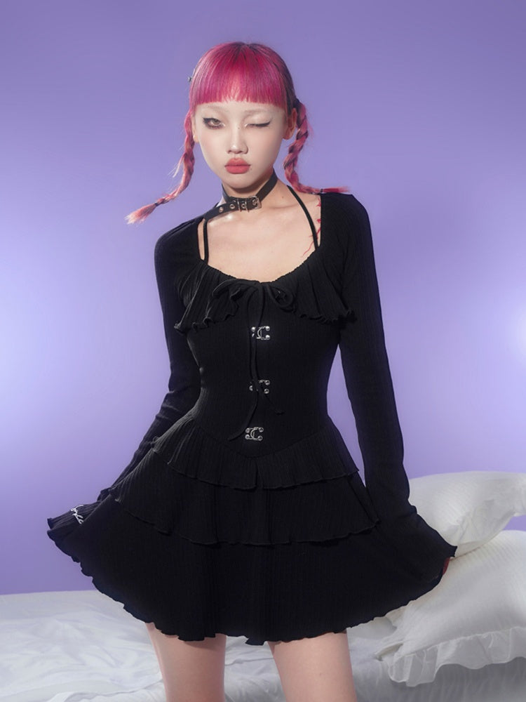 Halter Neck Ruffle Knit Cake Skirt Dress【s0000003833】