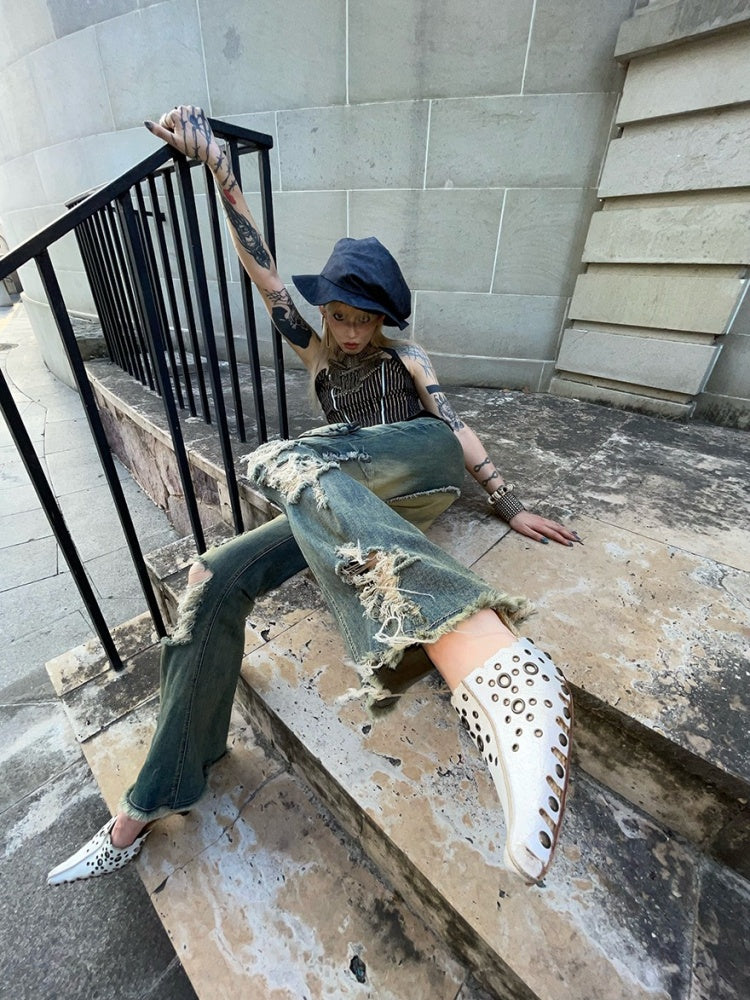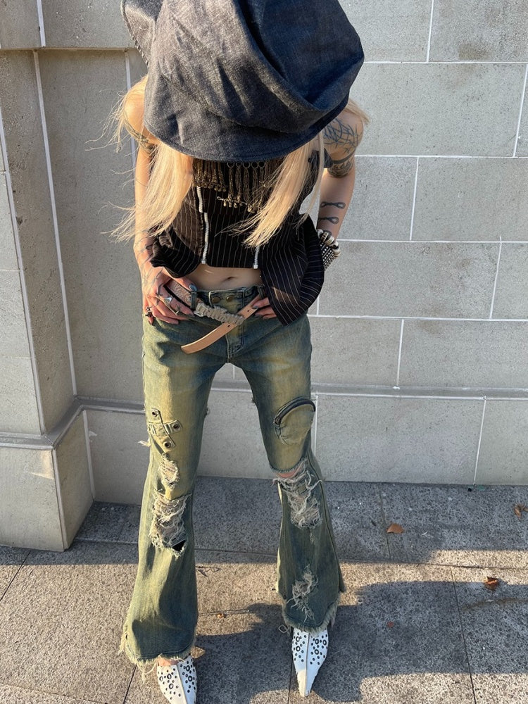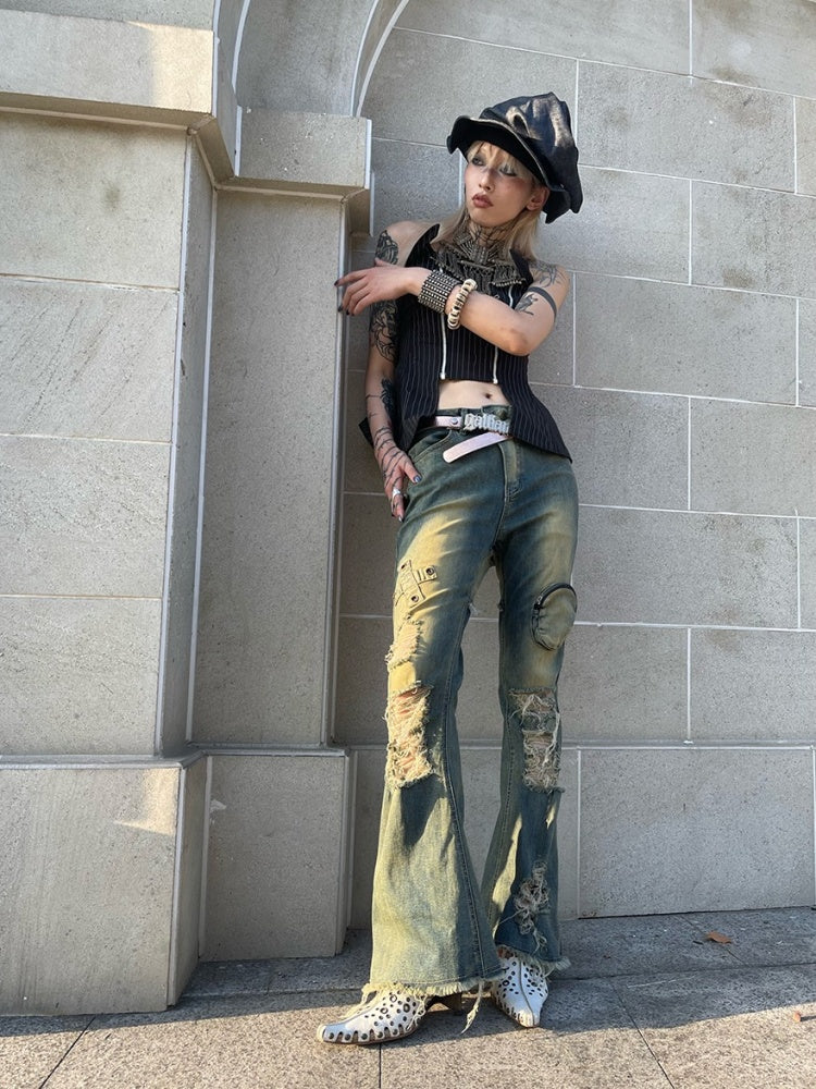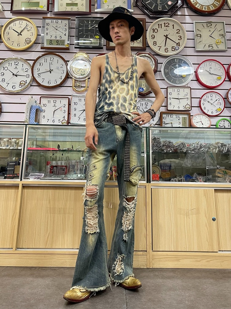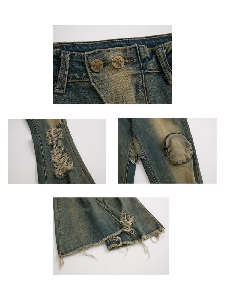 Damage Processing Wash Ripped Heavy Duty Stretch Denim Flare Pants【s0000003897】