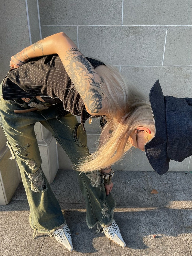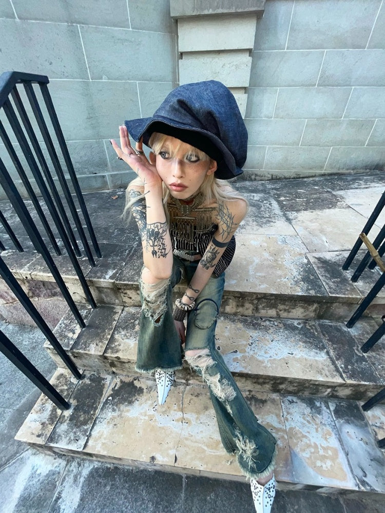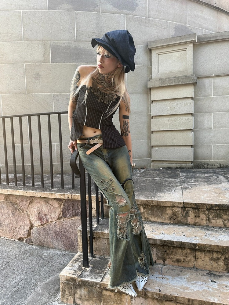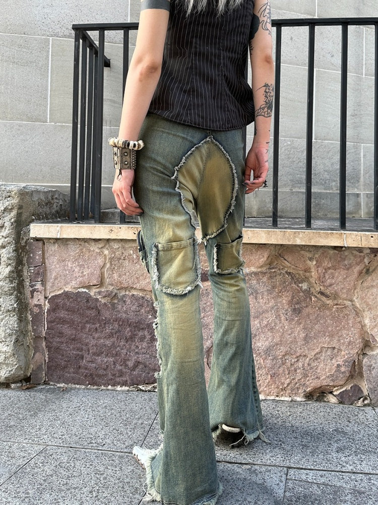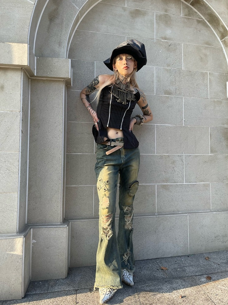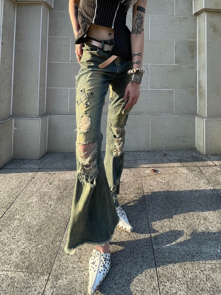 Damage Processing Wash Ripped Heavy Duty Stretch Denim Flare Pants【s0000003897】