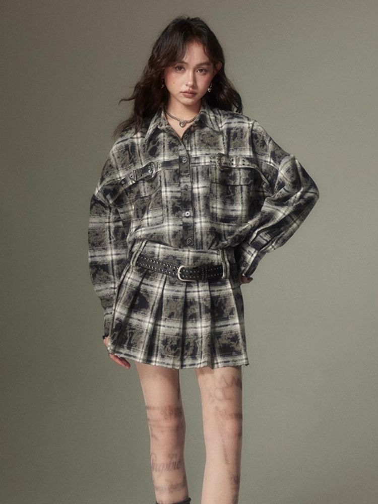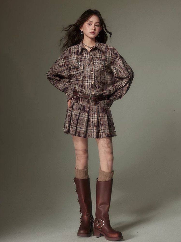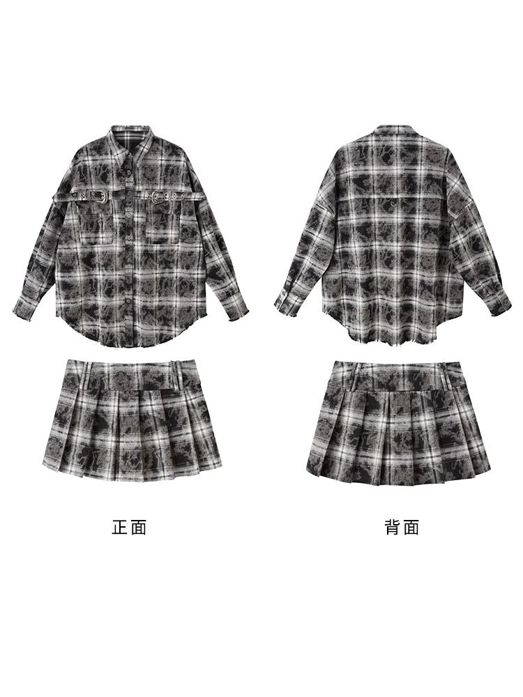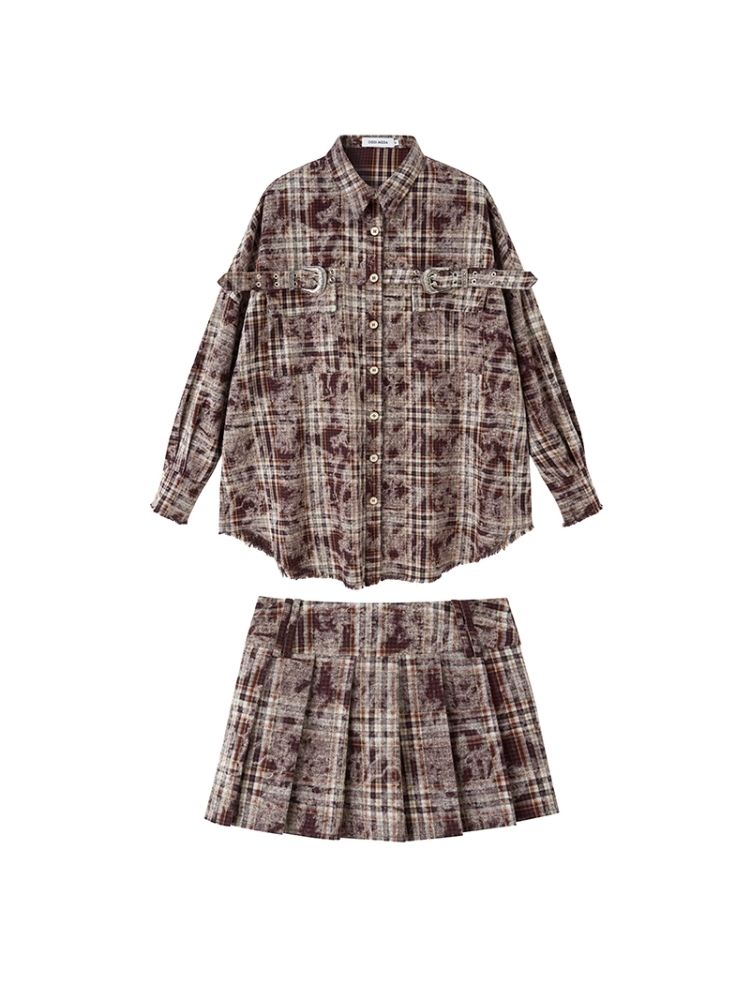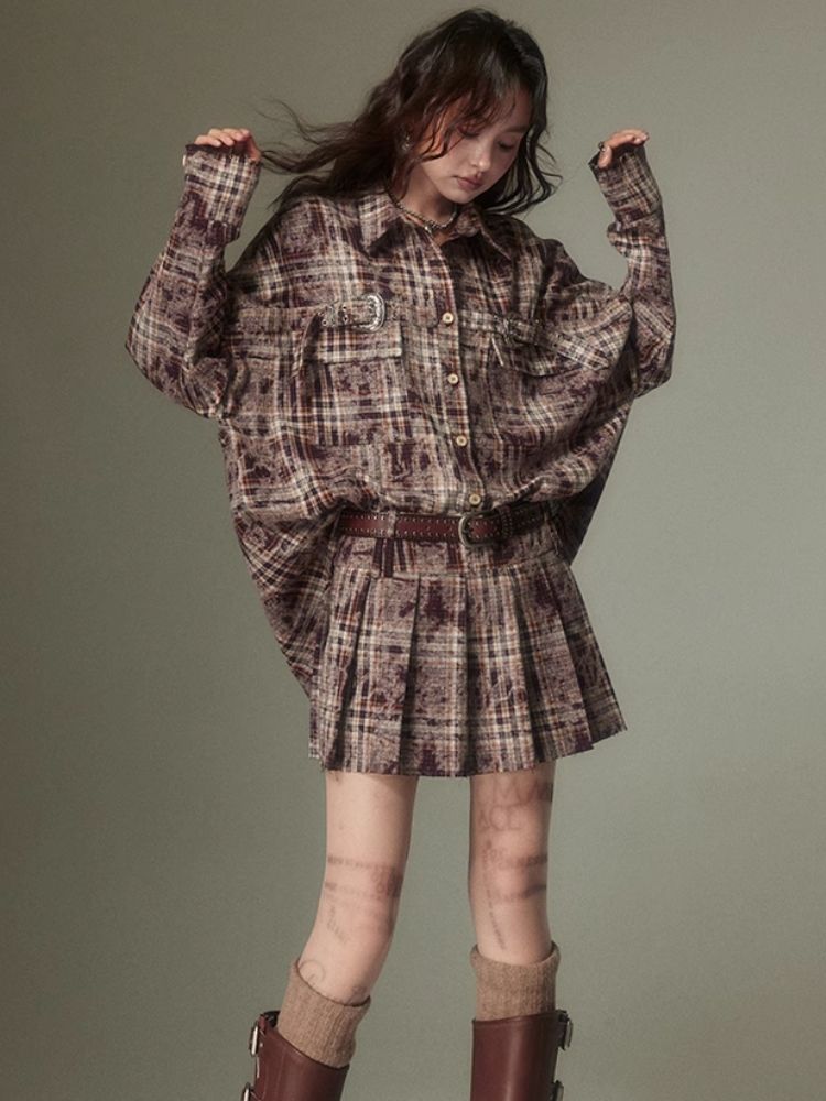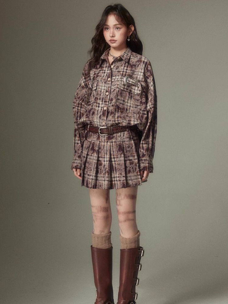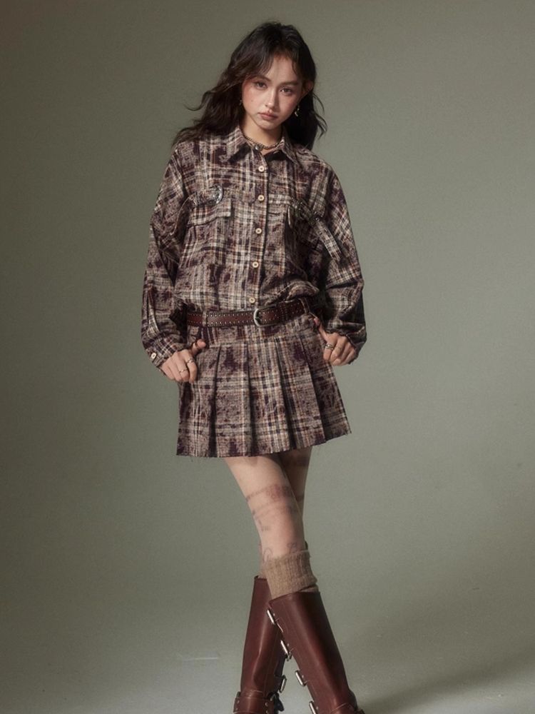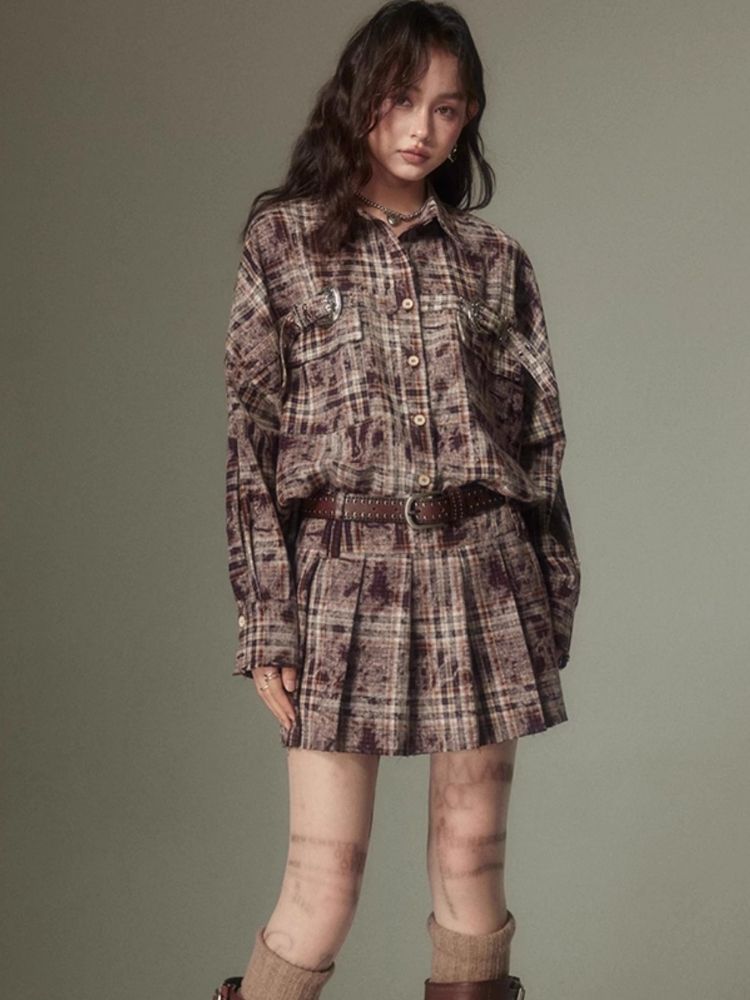 Contrast plaid shirt + pleated skirt【s0000003967】