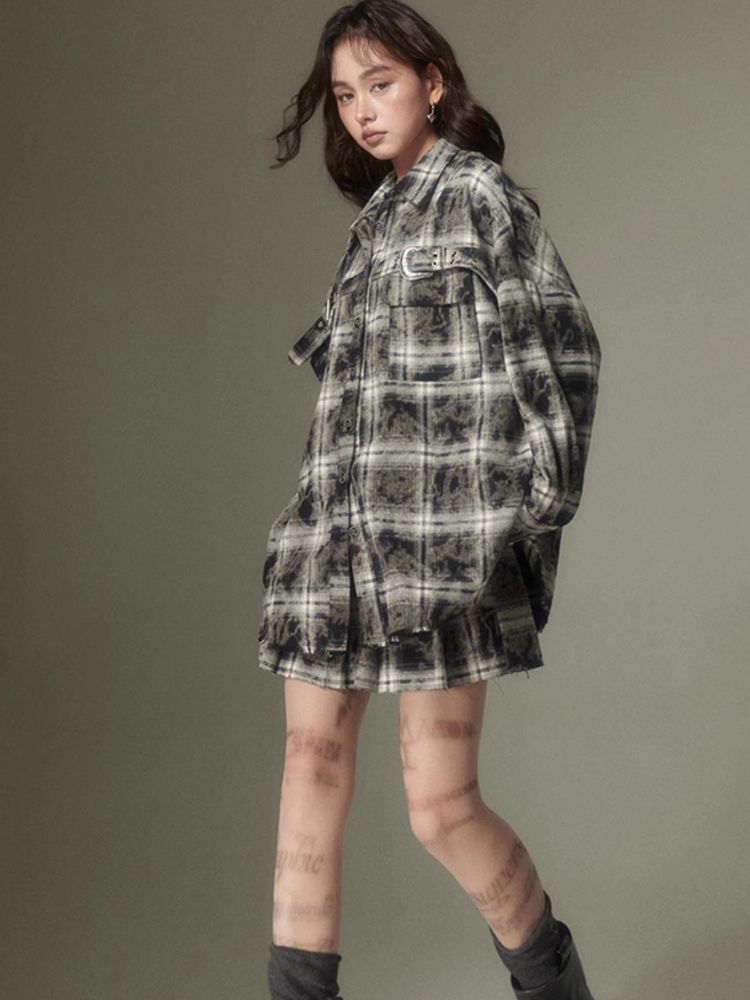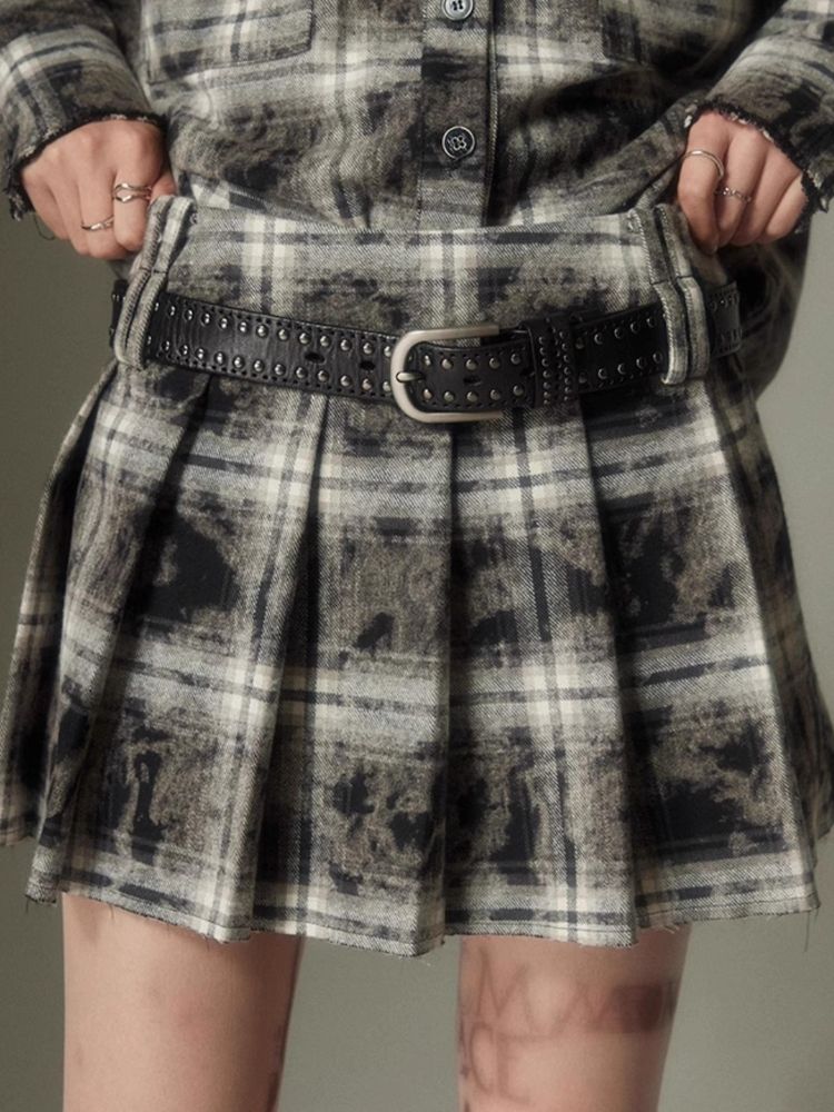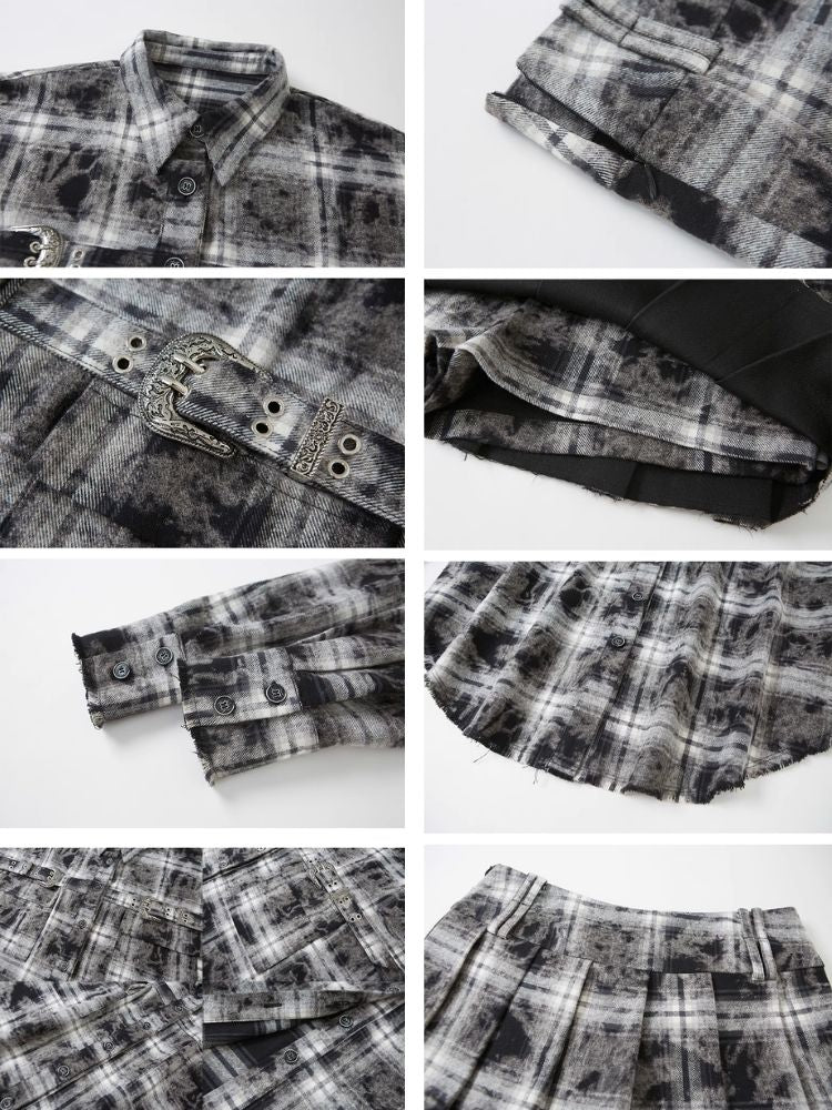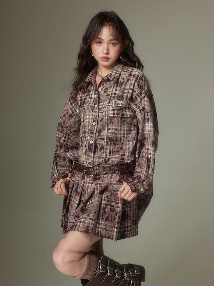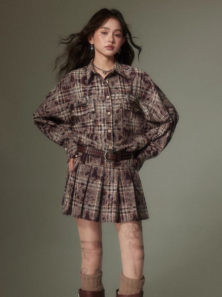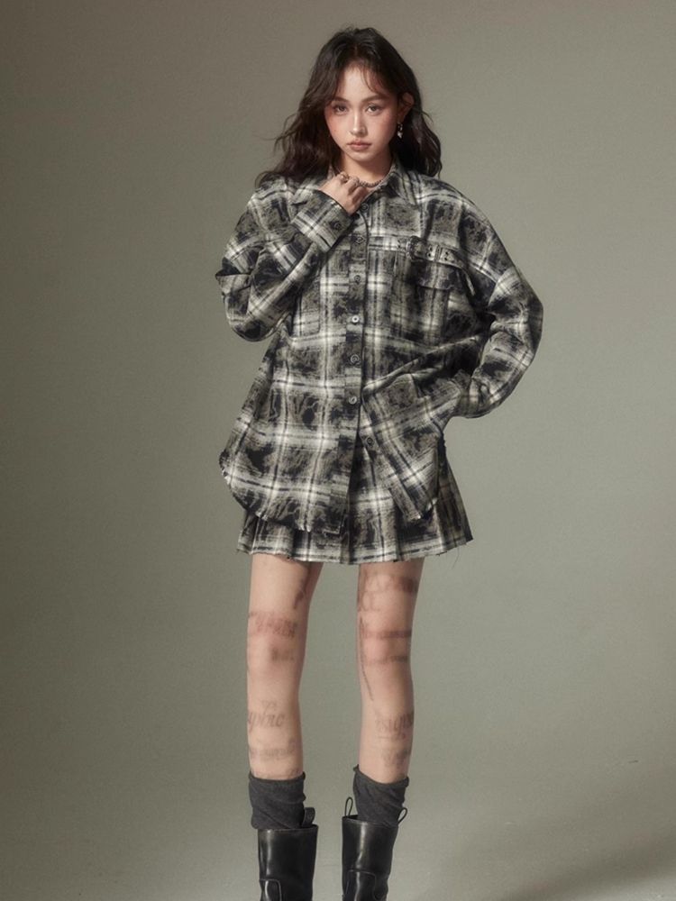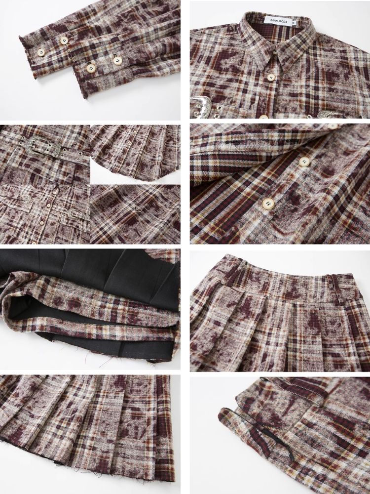 Contrast plaid shirt + pleated skirt【s0000003967】