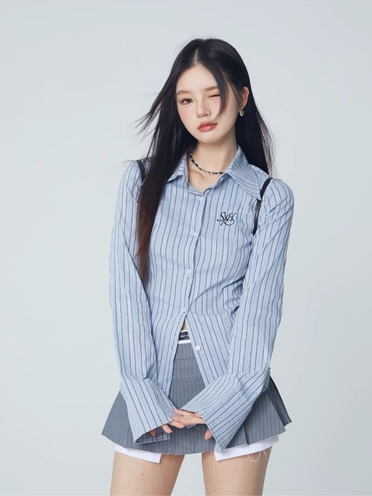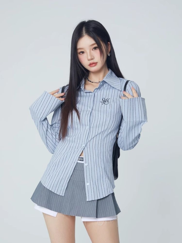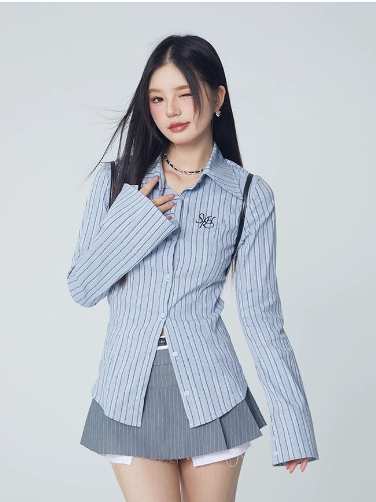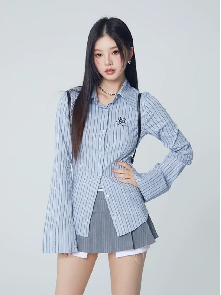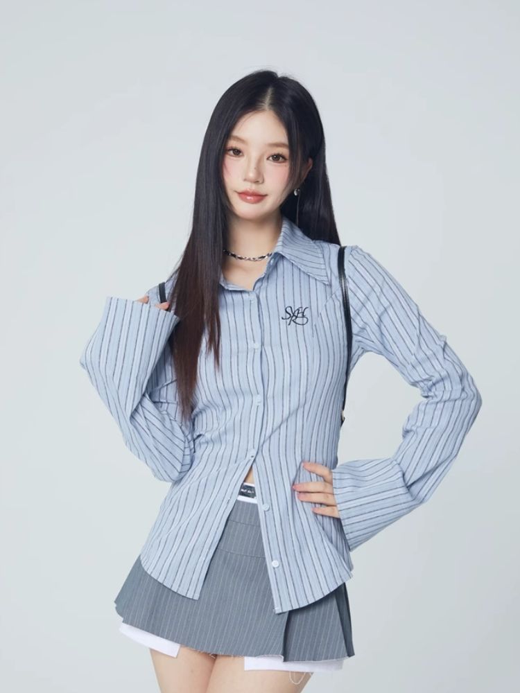 Embroidered logo stripe slim-waist shirt【s0000004074】