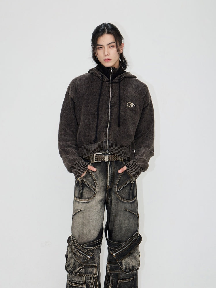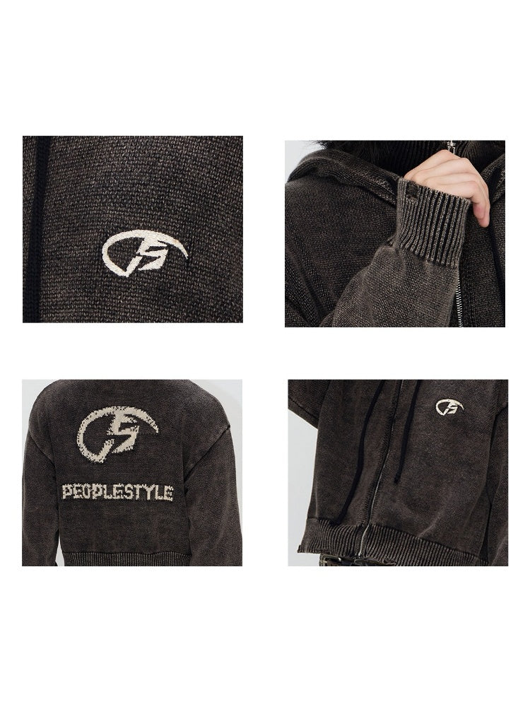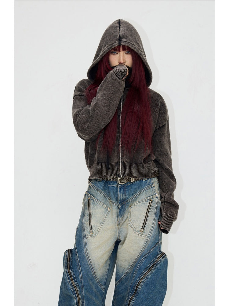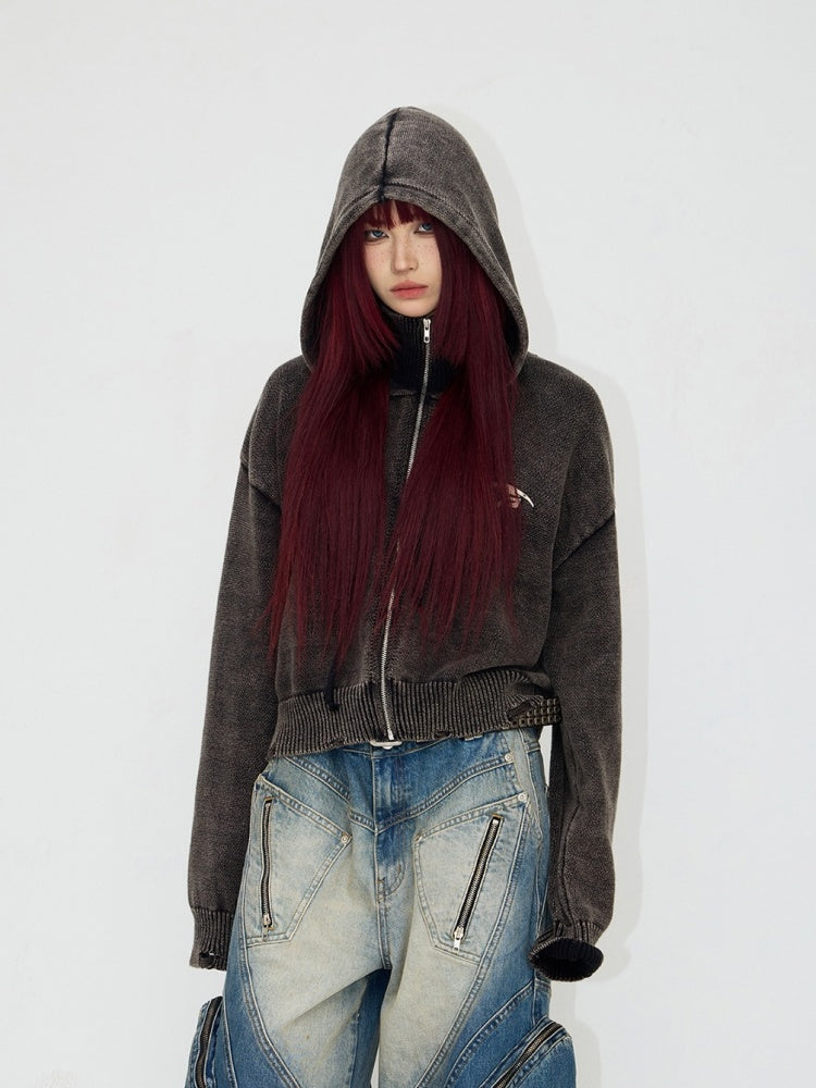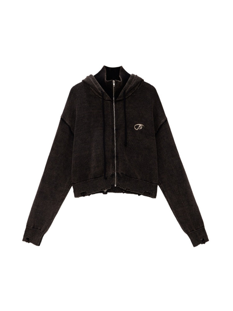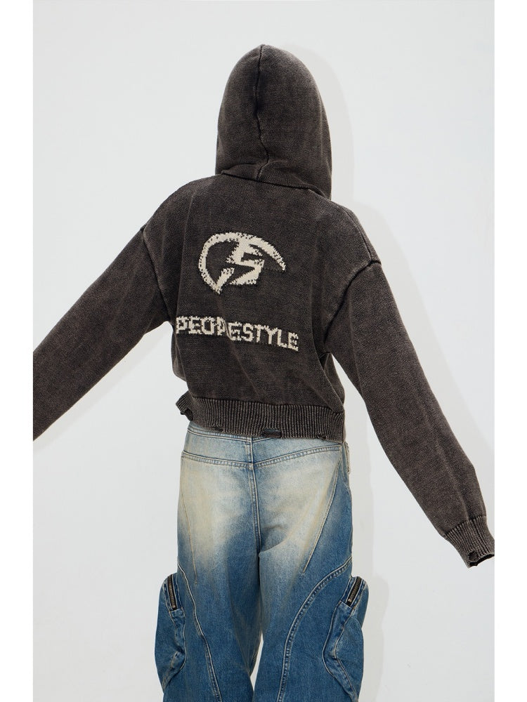Jacquard Washed Cropped Back Print Zip-Up Hooded Cardigan【s0000004206】