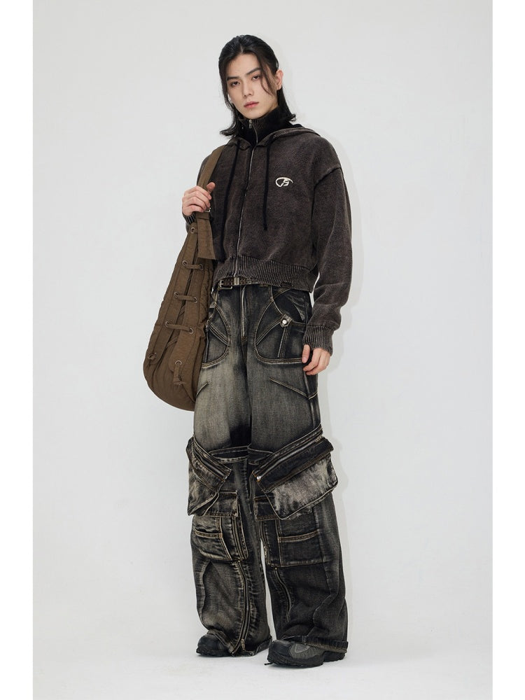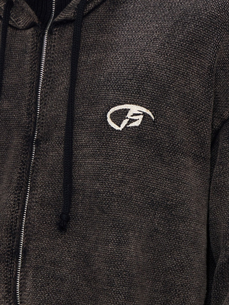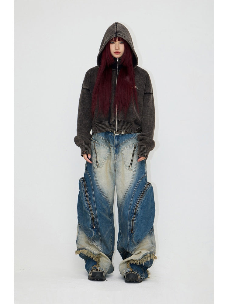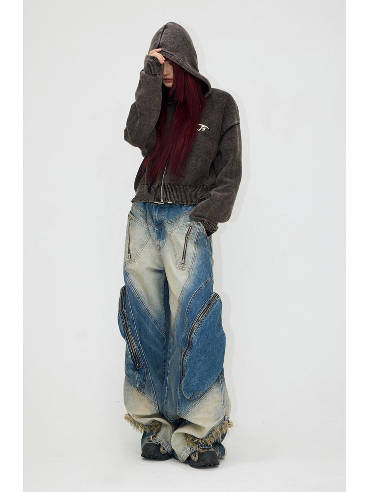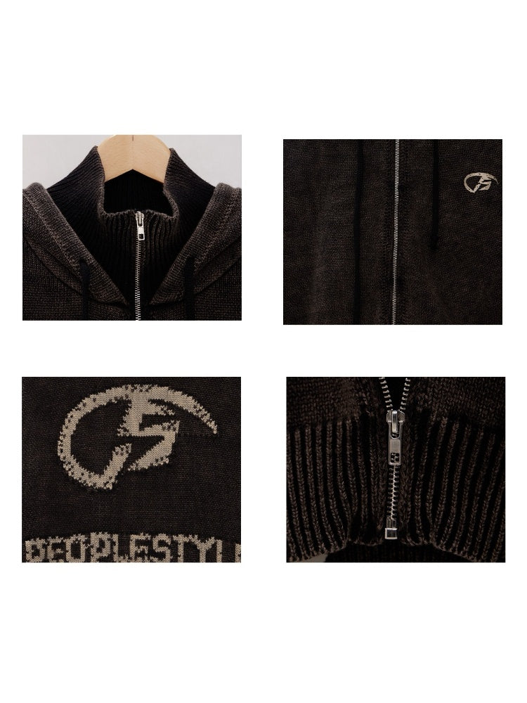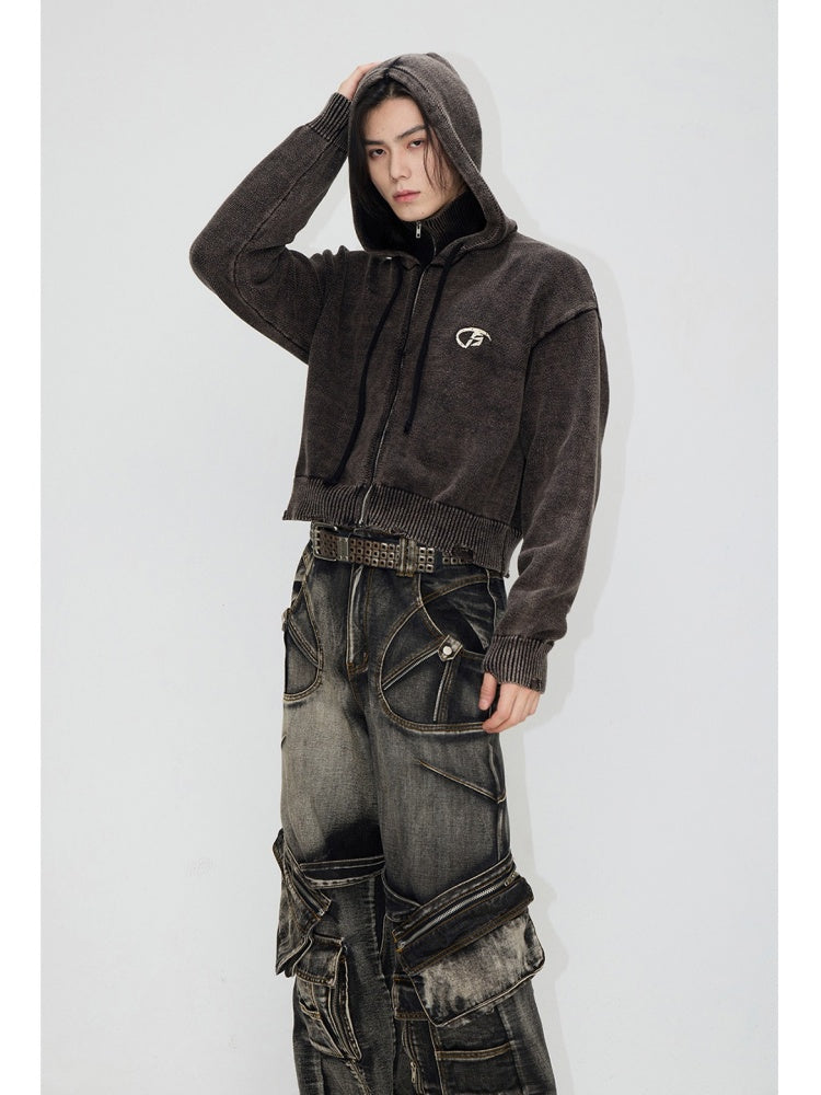 Jacquard Washed Cropped Back Print Zip-Up Hooded Cardigan【s0000004206】