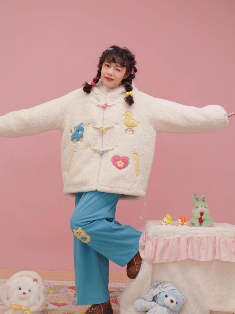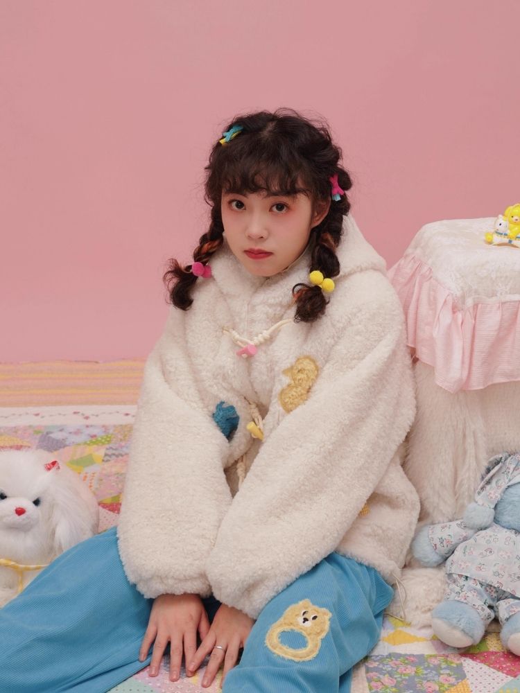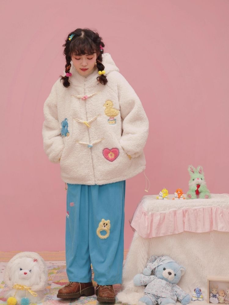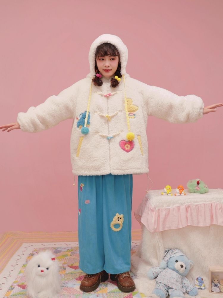 Girls cute soft toy collage embroidery horn button plush hooded outer【s0000004296】