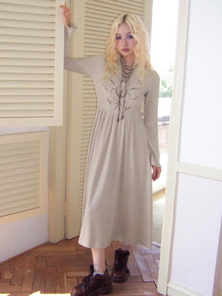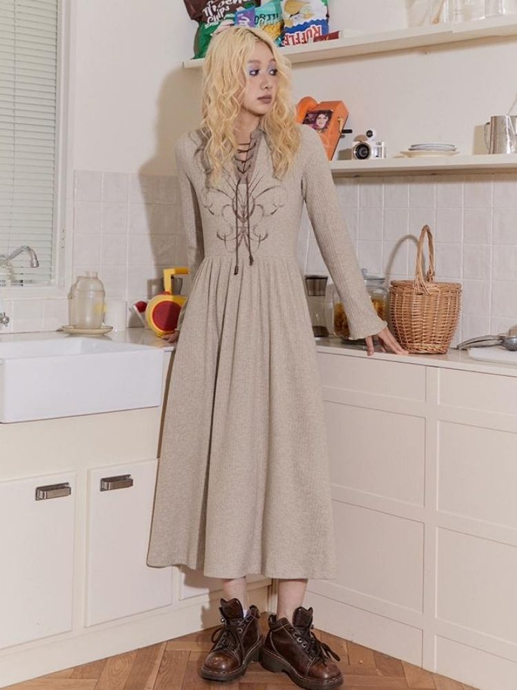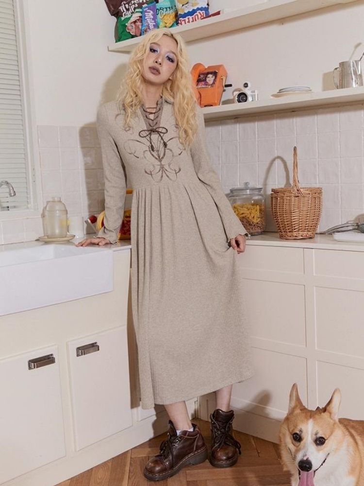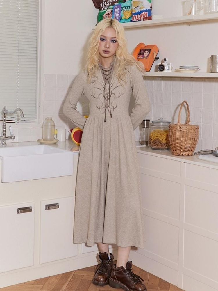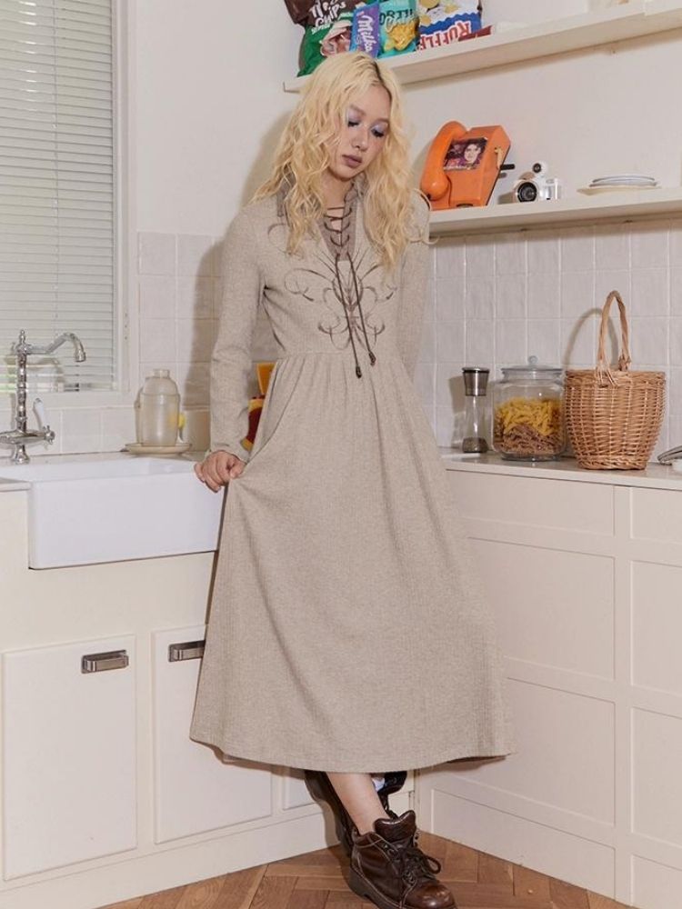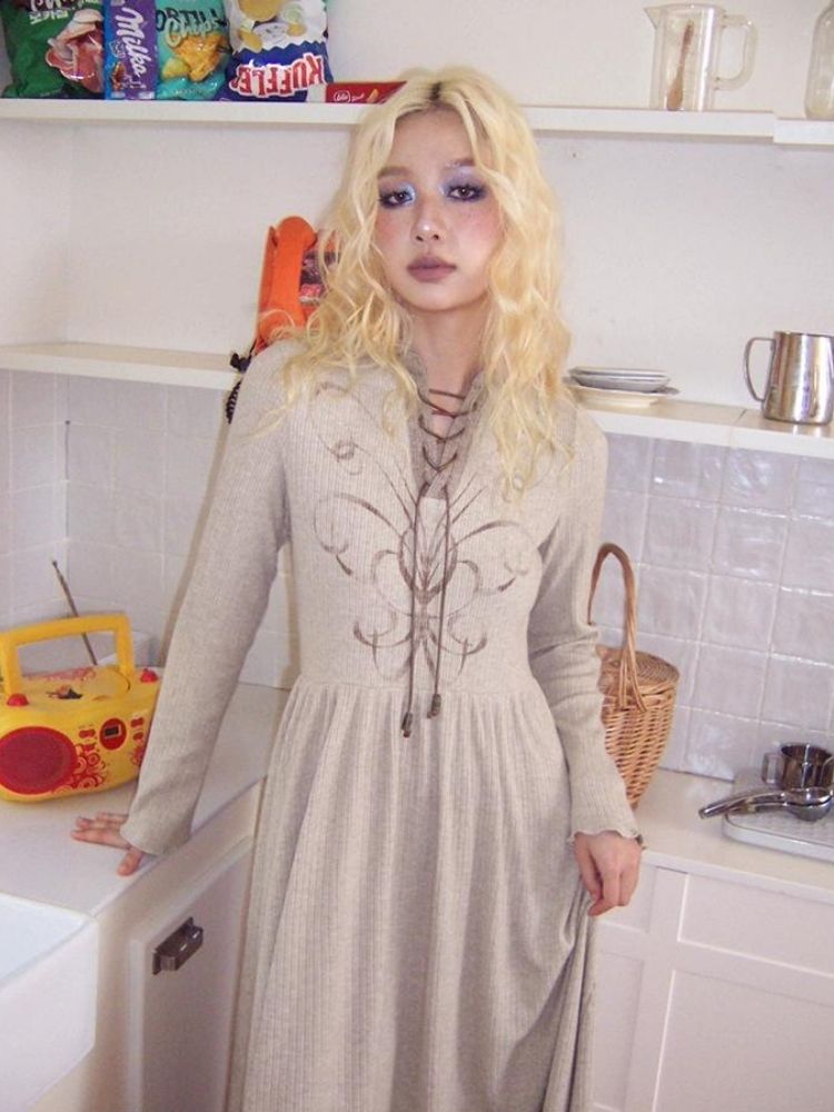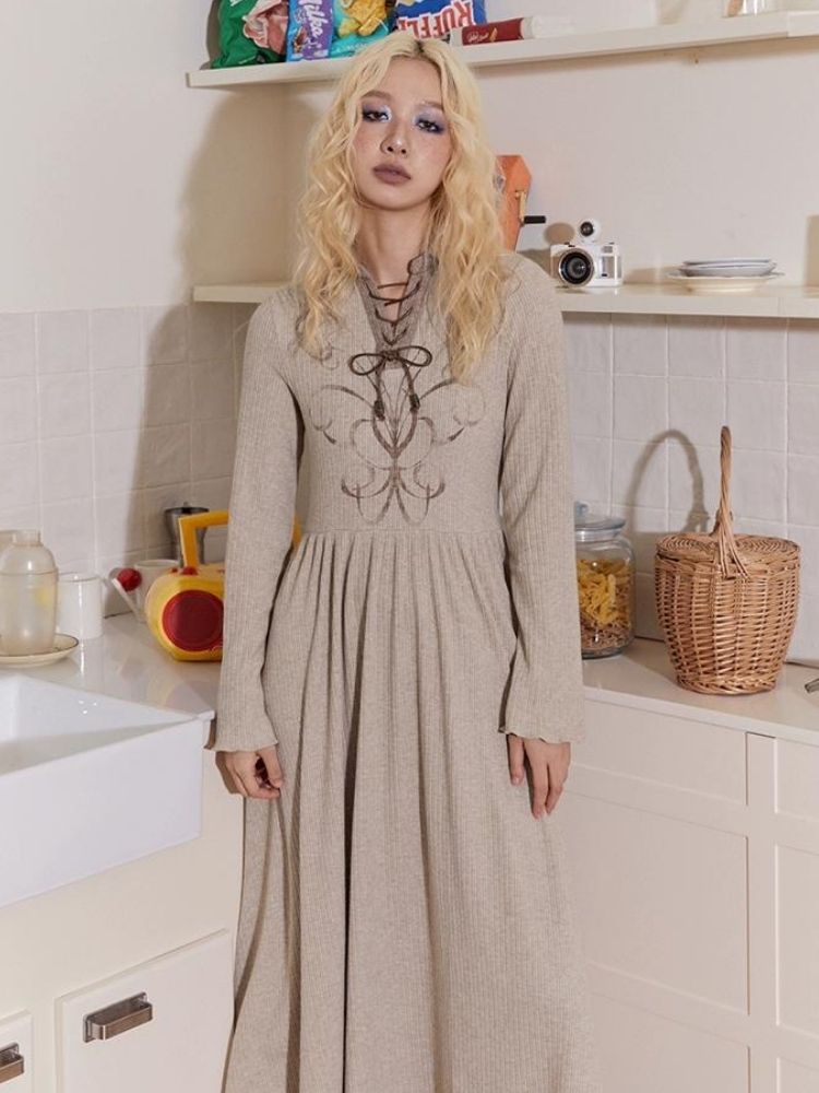 Retro Tie Printed Long Sleeve Dress【s0000004337】