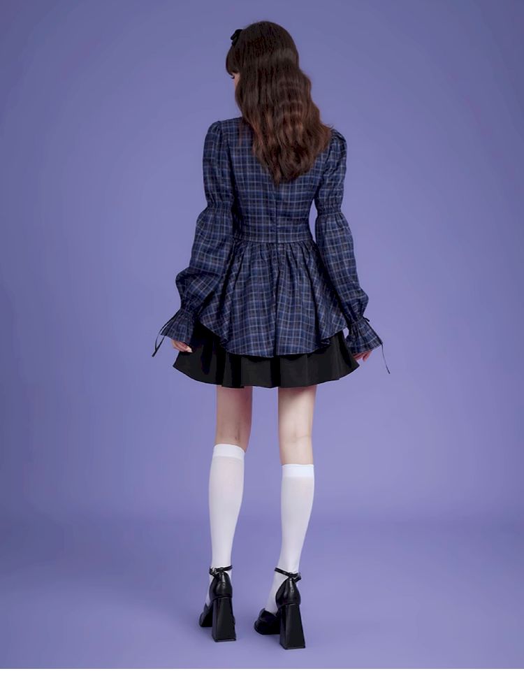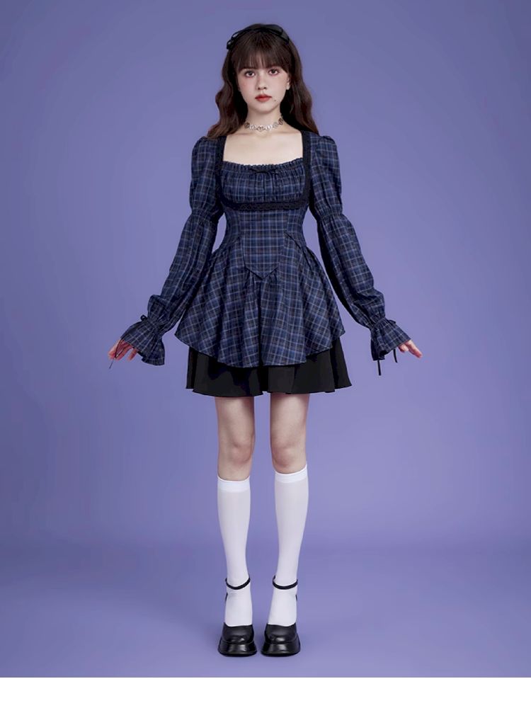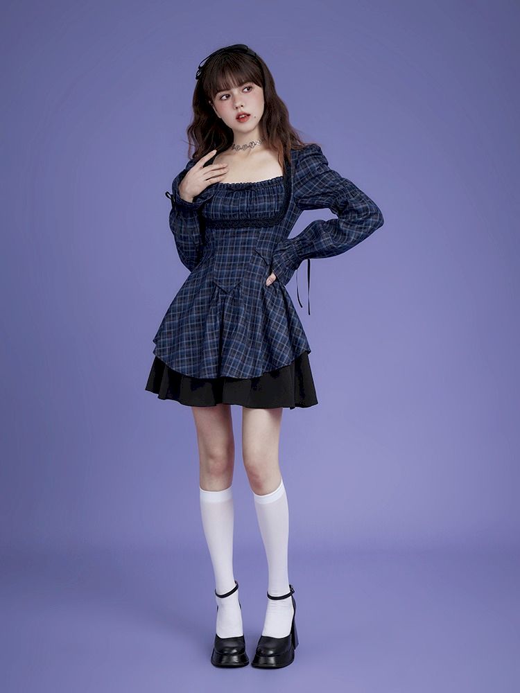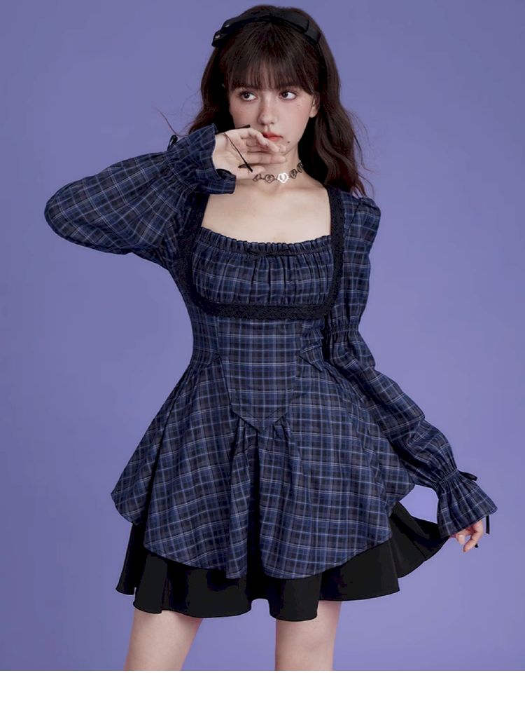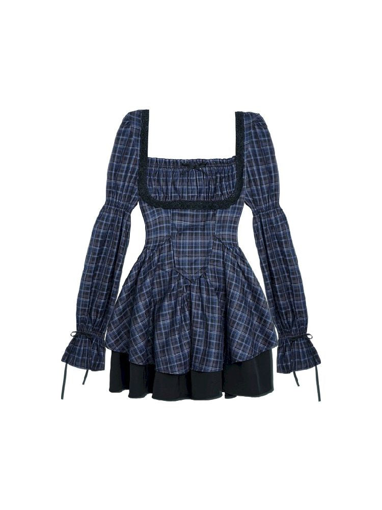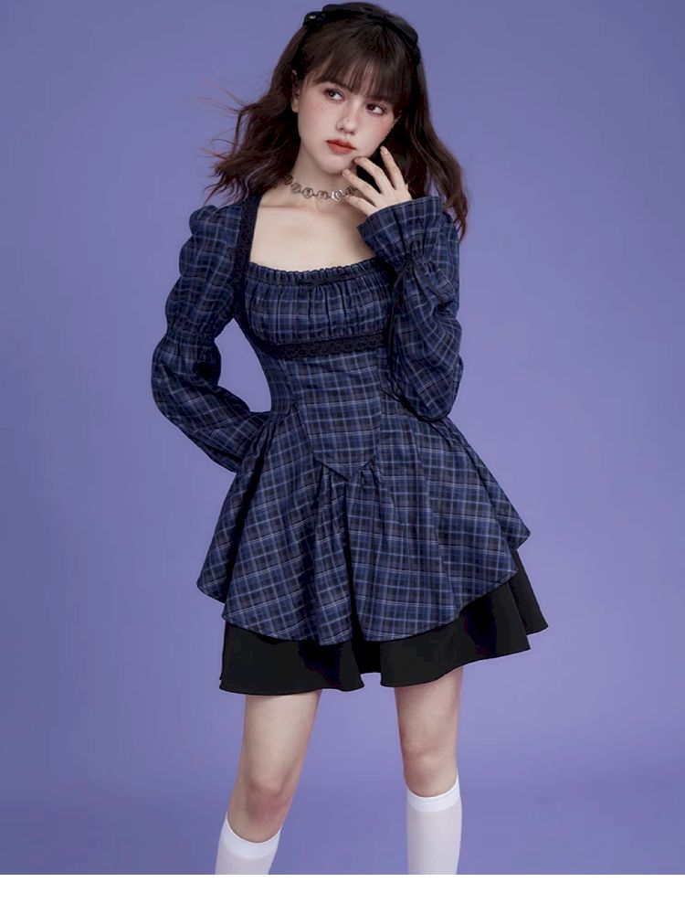 Dark Blue Grid Princess Long Sleeve Slim Dress【s0000005038】