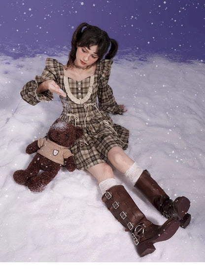 Plaid Bow Fly Sleeve Dress【s0000005043】