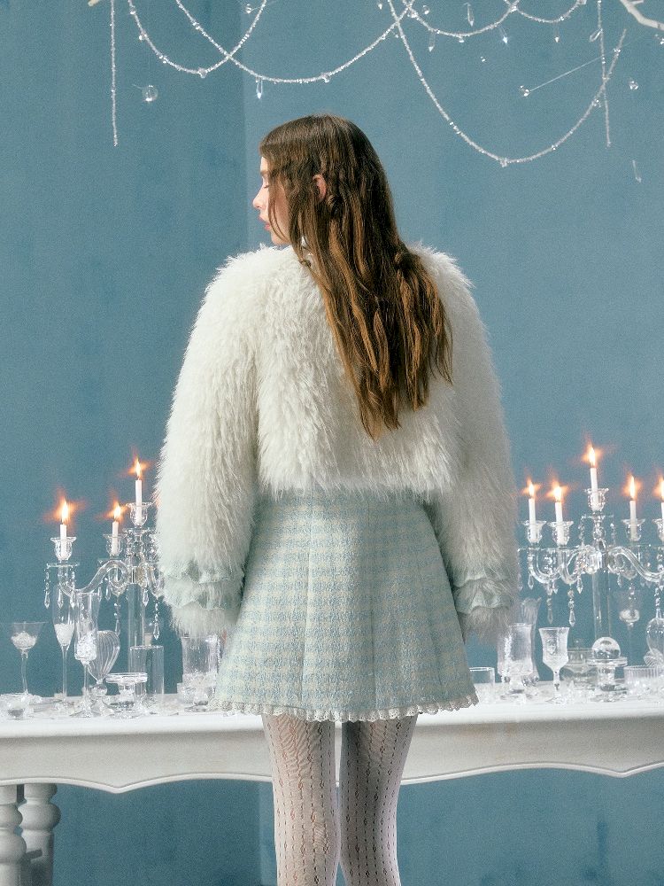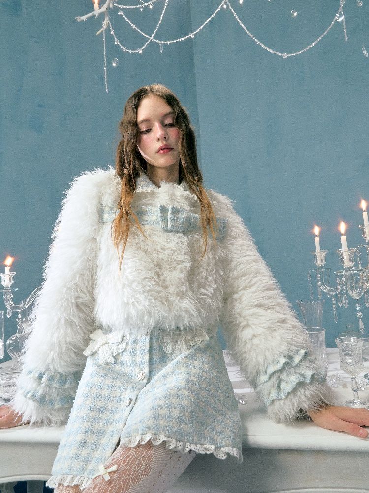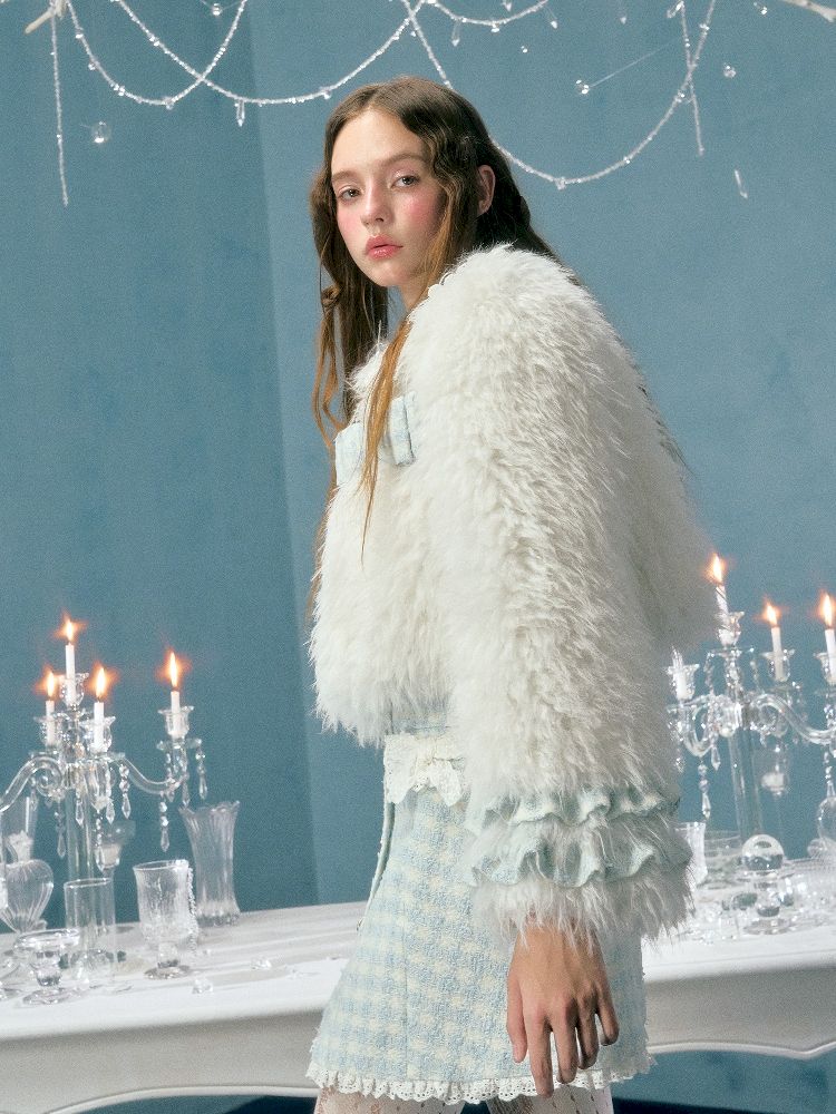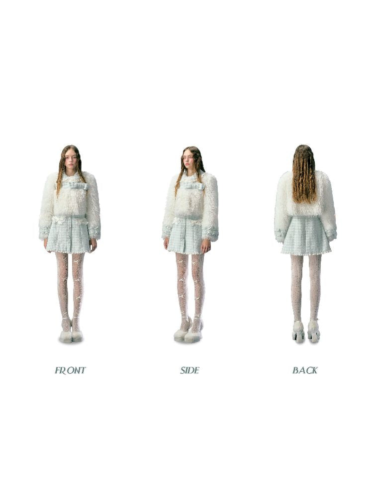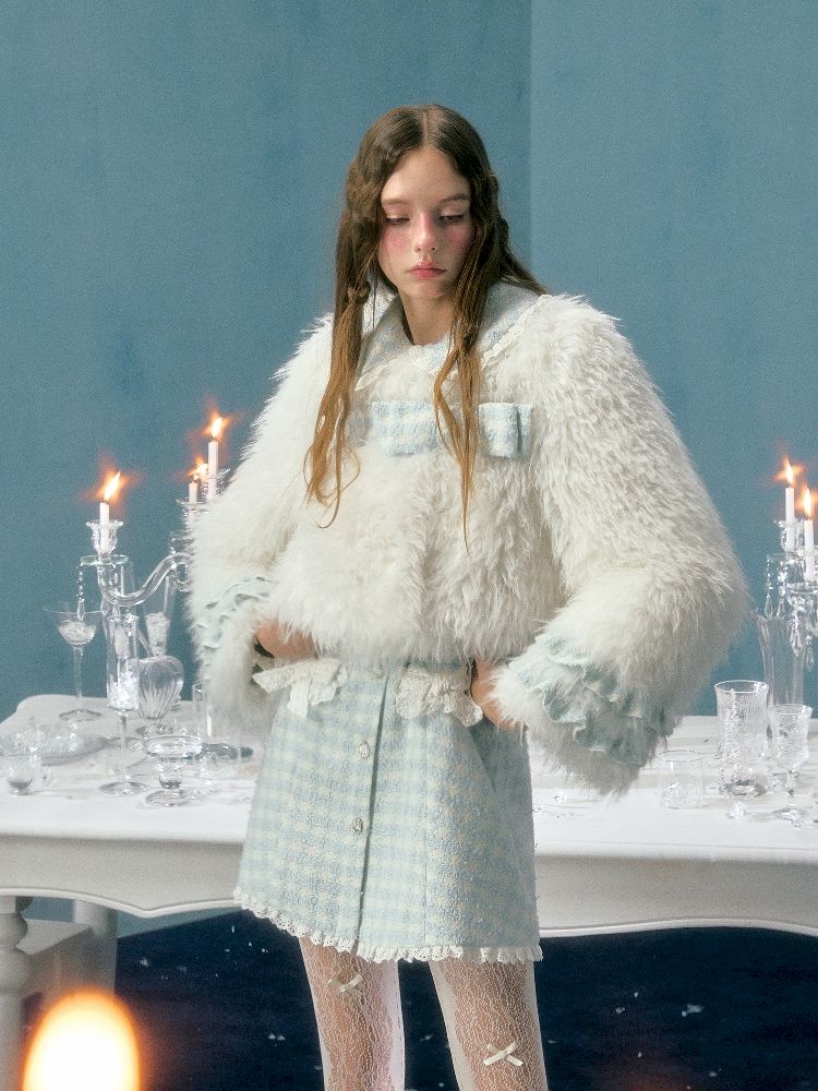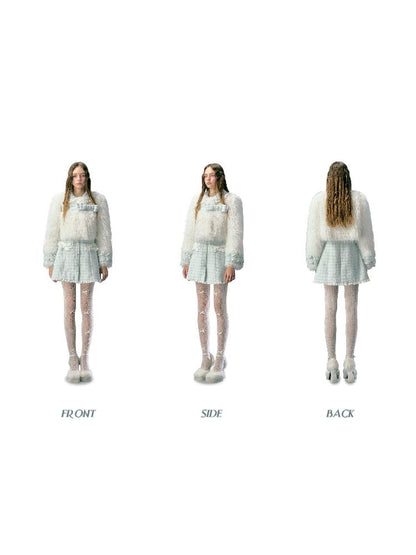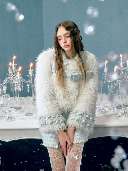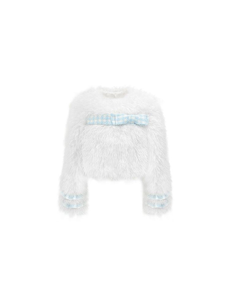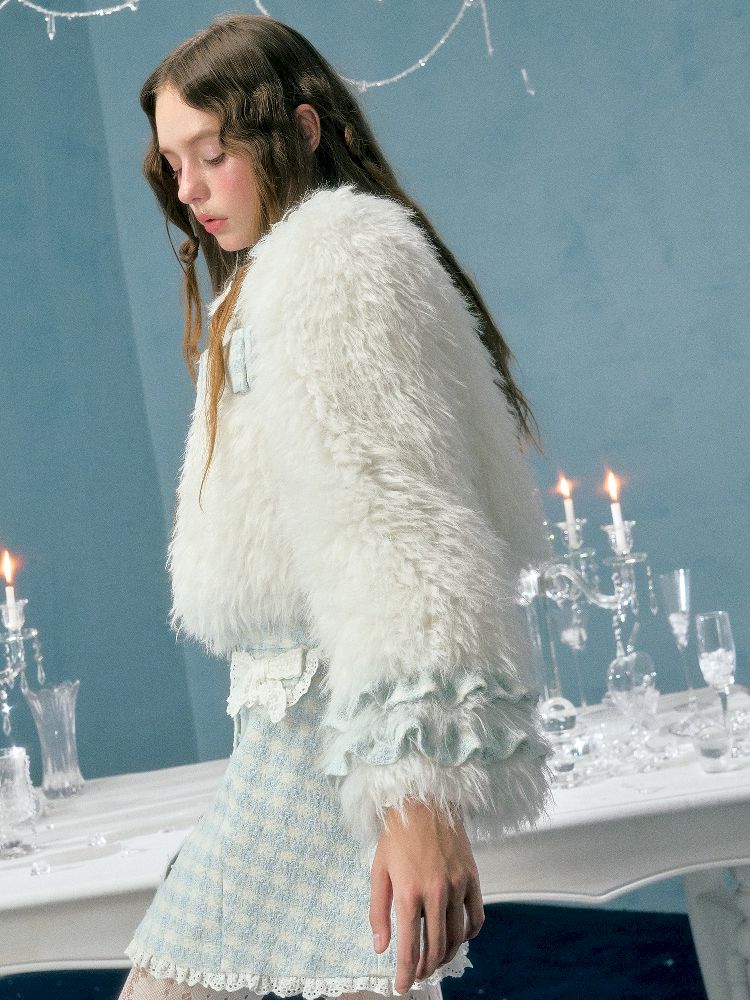 Checkered Bow Trim White Short Faux Fur Coat【s0000005140】