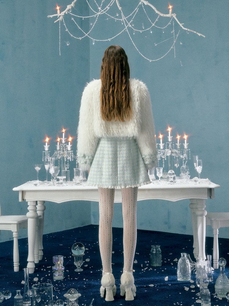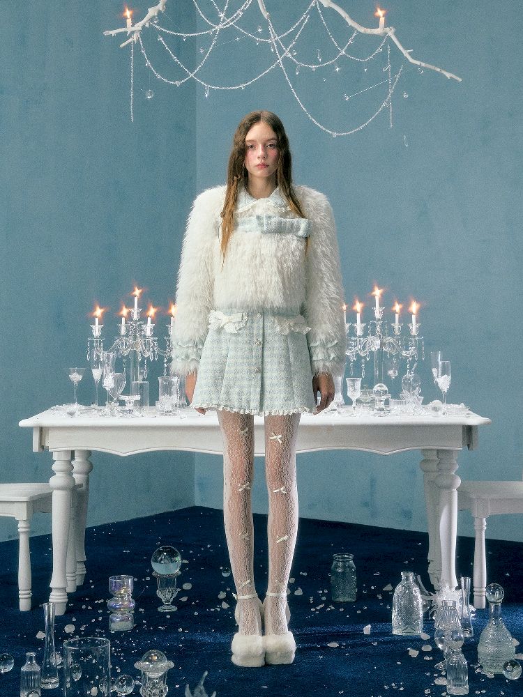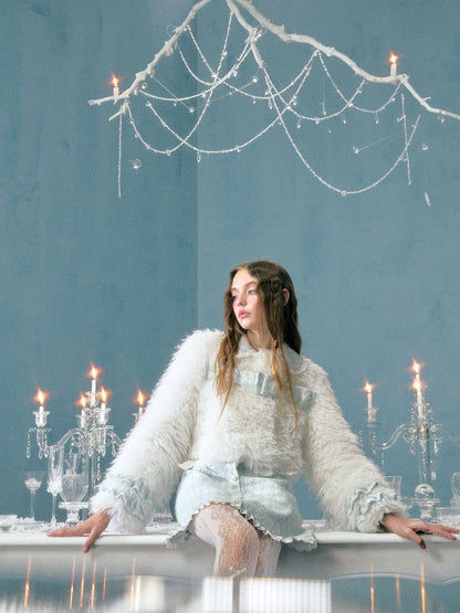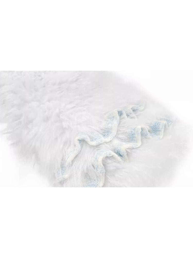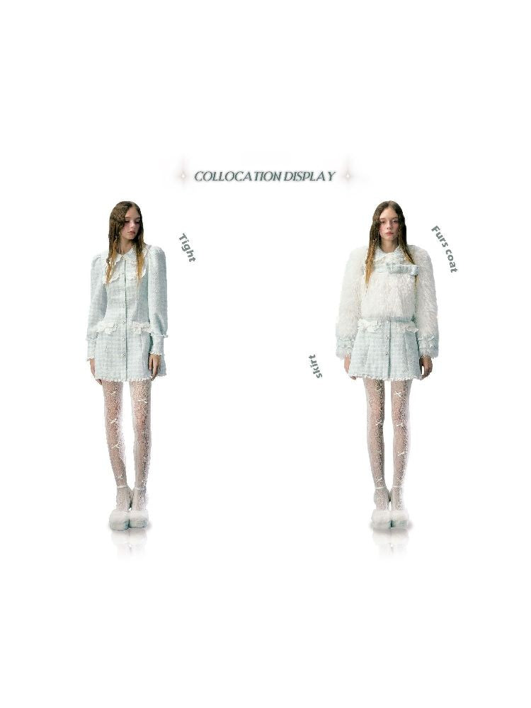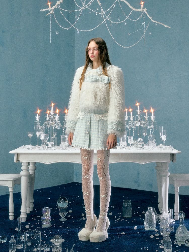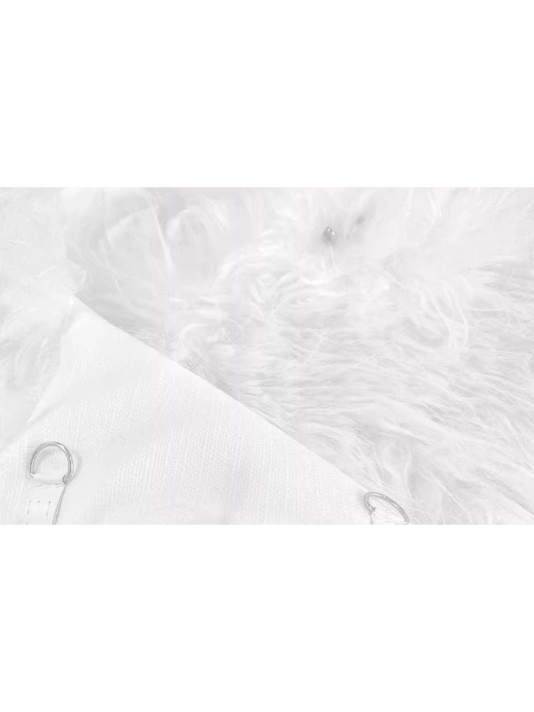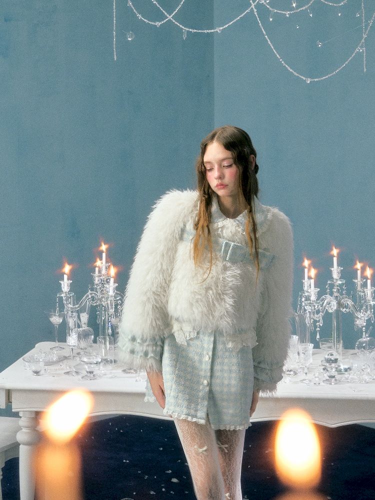 Checkered Bow Trim White Short Faux Fur Coat【s0000005140】