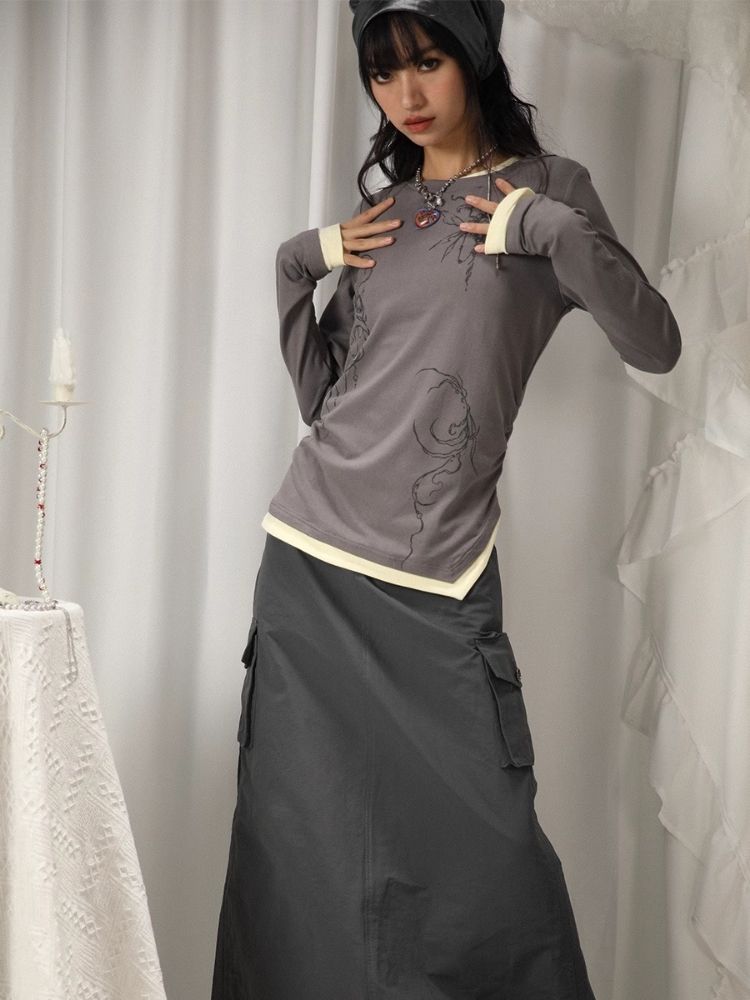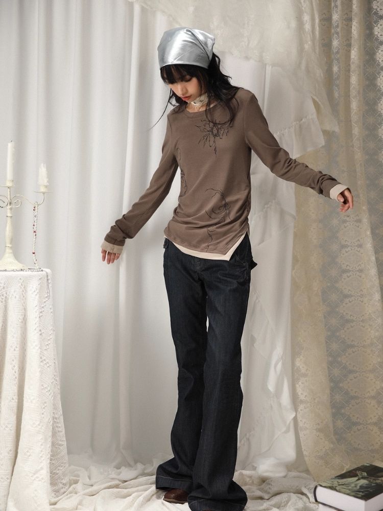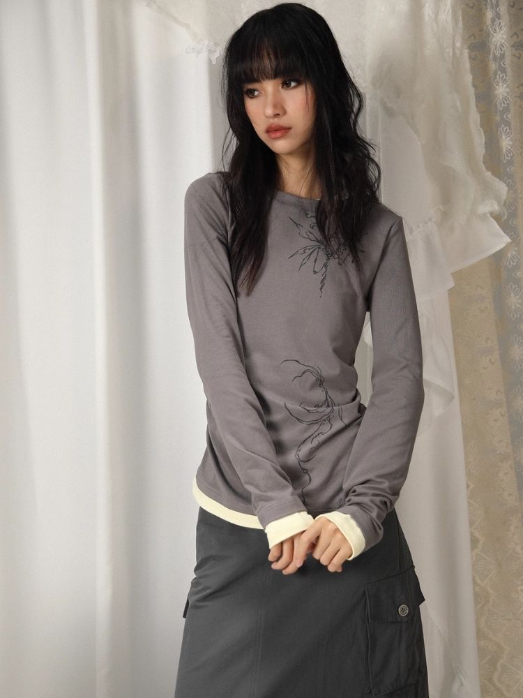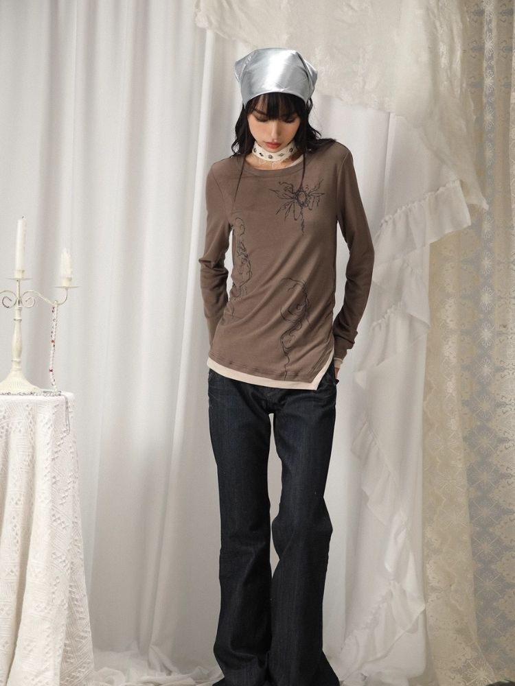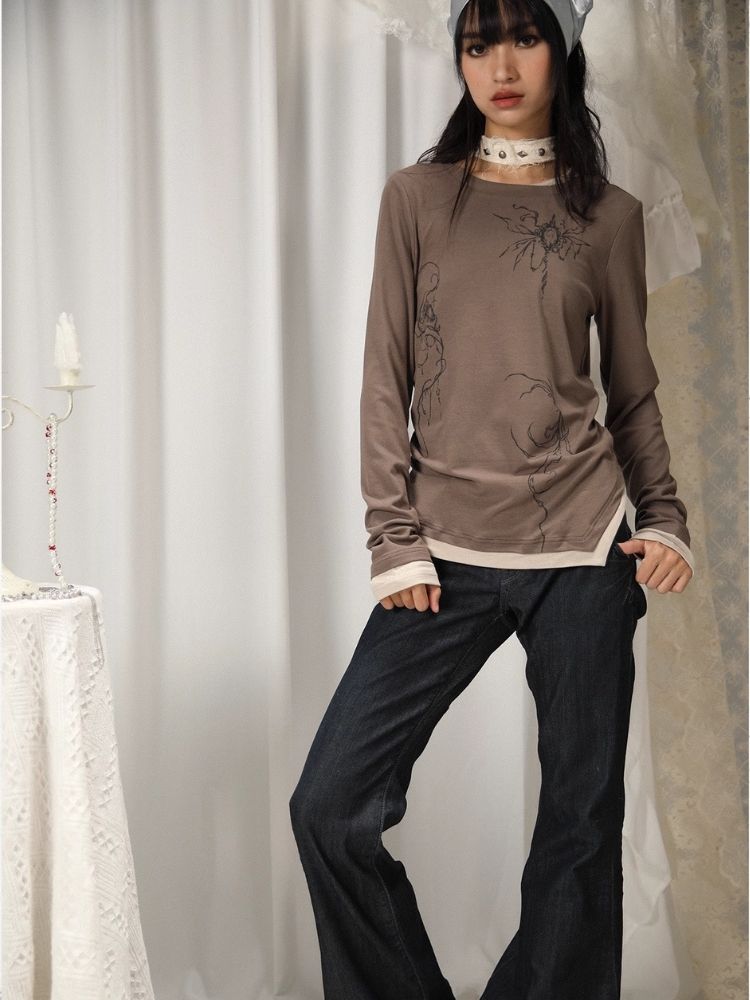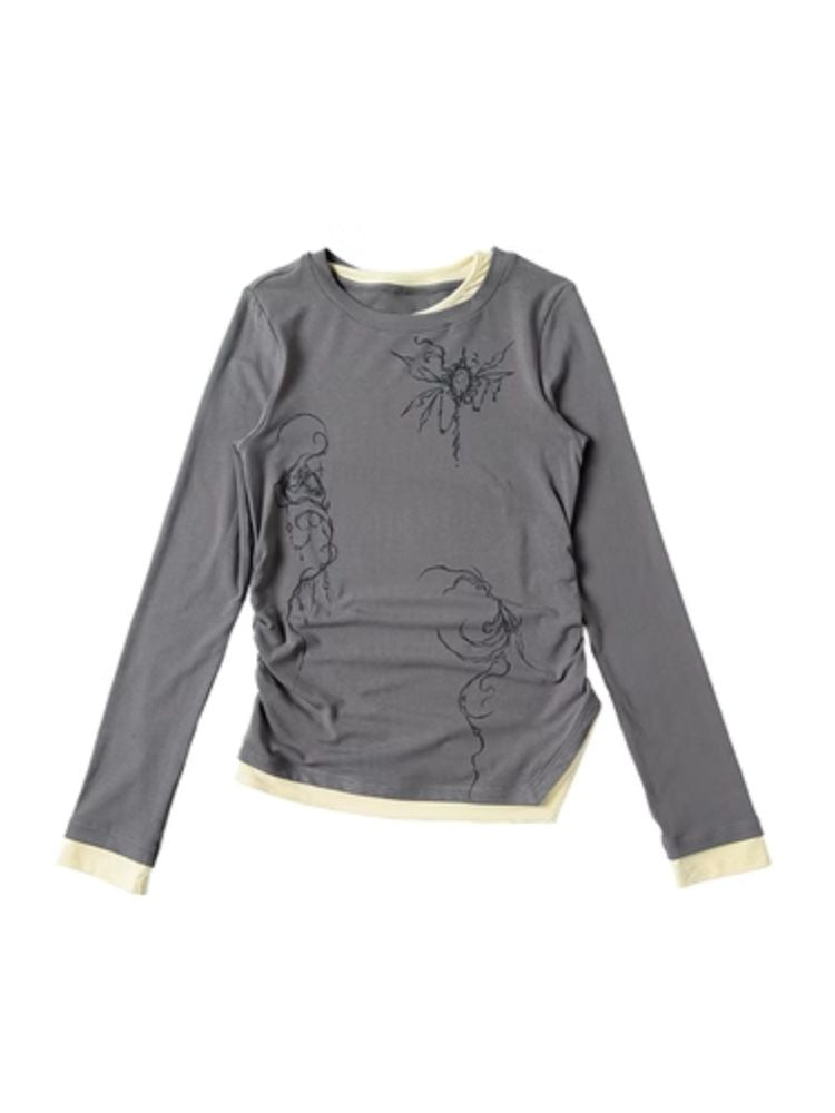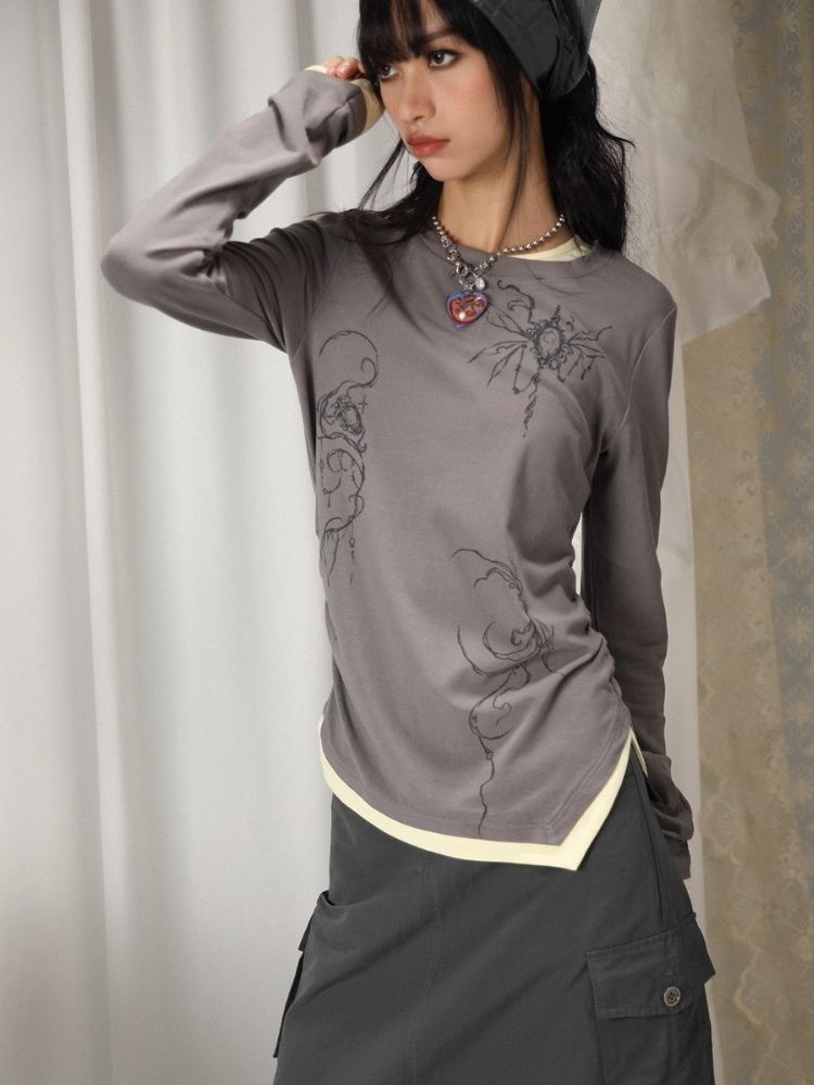 Fake Two Irregular Hem Printed Long Sleeve T-Shirt【s0000005746】